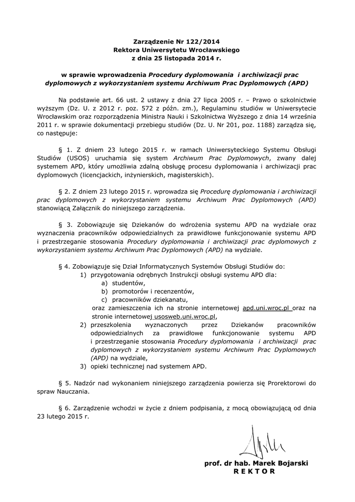 Zarządzenie Nr 122/2014 Rektora Uniwersytetu Wrocławskiego z dnia 25 listopada 2014 r. w sprawie wprowadzenia Procedury dyplomowania i archiwizacji prac dyplomowych z wykorzystaniem systemu Archiwum Prac Dyplomowych (APD) Na podstawie art. 66 ust. 2 ustawy z dnia 27 lipca 2005 r. – Prawo o szkolnictwie wyŜszym (Dz. U. z 2012 r. poz. 572 z późn. zm.), Regulaminu studiów w Uniwersytecie Wrocławskim oraz rozporządzenia Ministra Nauki i Szkolnictwa WyŜszego z dnia 14 września 2011 r. w sprawie dokumentacji przebiegu studiów (Dz. U. Nr 201, poz. 1188) zarządza się, co następuje: § 1. Z dniem 23 lutego 2015 r. w ramach Uniwersyteckiego Systemu Obsługi Studiów (USOS) uruchamia się system Archiwum Prac Dyplomowych, zwany dalej systemem APD, który umoŜliwia zdalną obsługę procesu dyplomowania i archiwizacji prac dyplomowych (licencjackich, inŜynierskich, magisterskich). § 2. Z dniem 23 lutego 2015 r. wprowadza się Procedurę dyplomowania i archiwizacji prac dyplomowych z wykorzystaniem systemu Archiwum Prac Dyplomowych (APD) stanowiącą Załącznik do niniejszego zarządzenia. § 3. Zobowiązuje się Dziekanów do wdroŜenia systemu APD na wydziale oraz wyznaczenia pracowników odpowiedzialnych za prawidłowe funkcjonowanie systemu APD i przestrzeganie stosowania Procedury dyplomowania i archiwizacji prac dyplomowych z wykorzystaniem systemu Archiwum Prac Dyplomowych (APD) na wydziale. § 4. Zobowiązuje się Dział Informatycznych Systemów Obsługi Studiów do: 1) przygotowania odrębnych Instrukcji obsługi systemu APD dla: a) studentów, b) promotorów i recenzentów, c) pracowników dziekanatu, oraz zamieszczenia ich na stronie internetowej apd.uni.wroc.pl oraz na stronie internetowej usosweb.uni.wroc.pl, 2) przeszkolenia wyznaczonych przez Dziekanów pracowników odpowiedzialnych za prawidłowe funkcjonowanie systemu APD i przestrzeganie stosowania Procedury dyplomowania i archiwizacji prac dyplomowych z wykorzystaniem systemu Archiwum Prac Dyplomowych (APD) na wydziale, 3) opieki technicznej nad systemem APD. § 5. Nadzór nad wykonaniem niniejszego zarządzenia powierza się Prorektorowi do spraw Nauczania. § 6. Zarządzenie wchodzi w Ŝycie z dniem podpisania, z mocą obowiązującą od dnia 23 lutego 2015 r. Załącznik do zarządzenia Nr 122/2014 z dnia 25 listopada 2014 r. Procedura dyplomowania i archiwizacji prac dyplomowych z wykorzystaniem systemu Archiwum Prac Dyplomowych (APD) §1 1. Wytyczne dotyczące pisania prac dyplomowych, warunki dopuszczenia studenta do egzaminu dyplomowego, formę i zakres egzaminu dyplomowego, skład komisji przeprowadzającej egzamin dyplomowy oraz organizację i przebieg egzaminu dyplomowego regulują odrębne przepisy. 2. Praca dyplomowa podlega weryfikacji w systemie antyplagiatowym zgodnie z odrębnymi regulacjami. §2 Dostęp do systemu APD jest moŜliwy po zalogowaniu na stronie internetowej apd.uni.wroc.pl lub na stronie internetowej usosweb.uni.wroc.pl. §3 1. Promotor zobowiązany jest, w terminie określonym przez Dziekana, dostarczyć do dziekanatu własnoręcznie podpisane informacje o planowanych obronach, na wzorze wydrukowanym z systemu APD. Informacja sporządzana jest odrębnie dla kaŜdego studenta i zawiera: 1) imię (imiona), nazwisko i numer albumu studenta; 2) tytuł pracy dyplomowej w języku oryginału; 3) skład komisji przeprowadzającej egzamin dyplomowy w szczególności: a) imię (imiona) i nazwisko, tytuł naukowy lub stopień naukowy promotora; b) imię (imiona) i nazwisko, tytuł naukowy lub stopień naukowy recenzenta; c) imię (imiona) i nazwisko, tytuł naukowy lub stopień naukowy przewodniczącego; 4) planowaną datę egzaminu dyplomowego. 2. Pracownik dziekanatu, w terminie określonym przez Dziekana, po otrzymaniu od promotora informacji, o których mowa w ust. 1, przed planowanym terminem egzaminu dyplomowego zobowiązany jest wprowadzić do systemu USOS: 1) tytuł pracy dyplomowej w języku oryginału; 2) skład komisji przeprowadzającej egzamin dyplomowy w szczególności: a) imię (imiona) i nazwisko, tytuł naukowy lub stopień naukowy promotora; b) imię (imiona) i nazwisko, tytuł naukowy lub stopień naukowy recenzenta; c) imię (imiona) i nazwisko, tytuł naukowy lub stopień naukowy przewodniczącego; 3) planowaną datę egzaminu dyplomowego; 3. Student, w terminie określonym przez Dziekana, przed przystąpieniem do egzaminu dyplomowego, po wprowadzeniu do systemu USOS danych przez pracownika dziekanatu, zobowiązany jest do wprowadzenia do systemu APD: 1) nazwy języka, w którym został złoŜony oryginał pracy dyplomowej; 2) tytułu pracy dyplomowej w języku polskim, jeŜeli językiem oryginału pracy jest język obcy – maksymalny limit znaków 300; 3) zwięzłego streszczenia pracy w języku polskim, jeŜeli językiem oryginału jest język polski oraz zwięzłego streszczenia pracy w języku polskim i języku oryginału, jeŜeli praca dyplomowa przygotowana jest w innym języku niŜ polski – maksymalny limit znaków 4000; 4) słów kluczowych w języku polskim, jeŜeli językiem oryginału jest język polski oraz słów kluczowych w języku polskim i w języku oryginału, jeŜeli językiem pracy jest język obcy – maksymalny limit znaków 1000; 5) wersji elektronicznej pracy dyplomowej przygotowanej w postaci jednego pliku w formacie PDF. W pracach dyplomowych zawierających załączniki naleŜy wprowadzić je do systemu APD w postaci dodatkowego spakowanego załącznika (ZIP, RAR, 7Z, GZIP). Nazwa pliku nie moŜe zawierać znaków diakrytycznych; 6) tłumaczenia na język angielski elementów, o których mowa w pkt 2-4, jeśli jest to wymagane przez Radę Wydziału. 4. Promotor, w terminie określonym przez Dziekana, zobowiązany jest do: 1) zatwierdzenia pracy dyplomowej w systemie APD; 2) wypełnienia oraz zatwierdzenia w systemie APD formularza oceny pracy dyplomowej (recenzja pracy dyplomowej); 3) złoŜenia w dziekanacie wydrukowanej z systemu APD i pod
