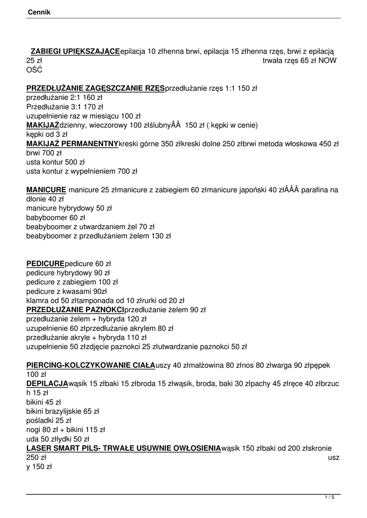 Cennik ZABIEGI UPIĘKSZAJĄCEepilacja 10 złhenna brwi, epilacja 15 złhenna rzęs, brwi z epilacją 25 zł trwała rzęs 65 zł NOW OŚĆ PRZEDŁUŻANIE ZAGĘSZCZANIE RZĘSprzedłużanie rzęs 1:1 150 zł przedłużanie 2:1 160 zł Przedłużanie 3:1 170 zł uzupełnienie raz w miesiącu 100 zł MAKIJAŻdzienny, wieczorowy 100 złślubny 150 zł ( kępki w cenie) kępki od 3 zł MAKIJAŻ PERMANENTNYkreski górne 350 złkreski dolne 250 złbrwi metoda włoskowa 450 zł brwi 700 zł usta kontur 500 zł usta kontur z wypełnieniem 700 zł MANICURE manicure 25 złmanicure z zabiegiem 60 złmanicure japoński 40 złÂ parafina na dłonie 40 zł manicure hybrydowy 50 zł babyboomer 60 zł beabyboomer z utwardzaniem żel 70 zł beabyboomer z przedłużaniem żelem 130 zł PEDICUREpedicure 60 zł pedicure hybrydowy 90 zł pedicure z zabiegiem 100 zł pedicure z kwasami 90zł klamra od 50 złtamponada od 10 złrurki od 20 zł PRZEDŁUŻANIE PAZNOKCIprzedłużanie żelem 90 zł przedłużanie żelem + hybryda 120 zł uzupełnienie 60 złprzedłużanie akrylem 80 zł przedłużanie akryle + hybryda 110 zł uzupełnienie 50 złzdjęcie paznokci 25 złutwardzanie paznokci 50 zł PIERCING-KOLCZYKOWANIE CIAŁAuszy 40 złmałżowina 80 złnos 80 złwarga 90 złpępek 100 zł DEPILACJAwąsik 15 złbaki 15 złbroda 15 złwąsik, broda, baki 30 złpachy 45 złręce 40 złbrzuc h 15 zł bikini 45 zł bikini brazylijskie 65 zł pośladki 25 zł nogi 80 zł + bikini 115 zł uda 50 złłydki 50 zł LASER SMART PILS- TRWAŁE USUWNIE OWŁOSIENIAwąsik 150 złbaki od 200 złskronie 250 zł usz y 150 zł 1/5 Cennik broda od 250 zł bikini od 400 zł pachy 400 zł uda 600 zł łydki 500 zł ramiona od 300 zł przedramiona 400 zł kark od 300 zł szyja od 300 zł owłosienie wokół brodawek 300 zł tors od 400 zł brzuch od 300 zł LASER SMART PULS - FOTOODMŁADZANIEcała twarz 400 złszyja od 300 złdekolt od 300 zł ramiona od 200 zł przedramiona od 300 zł dłonie od 150 zł plecy od 500 zł dłonie 300 zł ELEKTROKOAGULACJAusuwanie owłosienia-włosek 1 złzamykanie naczynek od 100 złusuw anie włókniaków, brodawek płaski od 30 zł OCZYSZCZANIEoczyszczanie twarzy z glinką 100 złoczyszczanie twarzy z algami 135 złoczys zczanie twarzy, mikrodermabrazja, algi 230 zł oczyszczanie pleców z glinką 145 zł oczyszczanie pleców z algami 175 zł PEELINGI PROFESJONALNEgreen peel 350 zł + oczyszczanie 500 złretix C 250 złC white 200 zł kwas TCA 280 zł + krem 350 zł kwas glikolowy 140 złkwas pirogronowy 140 złkwas migdałowy 140 zł kwas laktobionowy 140 zł kwas migdałowy 140 zł kwas mlekowy od 140 zł kwas azaleinowy od 140 zł kwas salicylowy od 140 zł ULTRADŹWIĘKIpeeling kawitacyjne 40 zł sonoforeza z maseczką 60 zł MASAŻE TWARZYmasaż klasyczny 40 złmasaż twarzy z maską 50 złpeeling, masaż twarzy 50 zł masaż liftingujący z maseczką 70 zł end ermologia twarzy 30 zł MASAŻE NA CIAŁOklasyczny 1h 100 złklasyczny plecy 45 min 50 złklasyczny kark 25 min 30 zł relaksacyjny 1 h 90 złkla syczny świecą plecy 60 zł klasyczny świecą karku 40 zł ujędrniający 70 zł gorącymi kamieniami 1,5 h 130 zł 2/5 Cennik lomi lomi 1 h 90 zł bambusowe pałeczki 50 min 80 zł stemplami ziołowymi 90 zł MASAŻE LECZNICZEcałościowy 90 złgrzbietu i kręgosłupa 50 złkręgosłupa częściowy 40 złko ńczyn górnych 40 zł kończyn dolnych 50 zł brzucha i klatki piersiowej 40 zł karku i obręczy barkowej 50 zł masaż dłoni 30 zł masaż stóp 40 zł limfatyczny częściowy 55 zł segmentarny kręgosłupa 50 zł izometryczny 50 zł ELEKTROSTYMULACJA twarz 35 złtwarz 10 zabiegów 250 złciało 35 złciało 10 zabiegów 250 zł FIZJOTERAPIA DLA DZIECI I DOROSŁYCH prądy diadynamiczne 20 złprądy interferencyjne 20 zł prądy tens 20 złk inezyterapia ćwiczenia indywidualne 45 zł kinesio taping 35 zł poizometryczna relaksacja mięśni 40 zł fizjoterapia w skoliozach, wadach postawy, wadach stóp NOWOŚĆ fizjoterapia w chorobach układu nerwowego:stwardnienie rozsiane, choroba Parkinsona, udar mózgu NOWOŚĆ ZABIEGI PIELĘGNACYJNE TWARZpeeling masaż maska algowa 65 zł czekoladowy 130 złFreihaut z kwasem hialuronowy 180 zł Freihaut dotleniający 180 złThalgo zabieg przeciwzmarszczkowy 180 zł Thalgo zabieg liftingujący 200 zł Monduniq "SIŁA JADU WĘŻA" 150 zł Monduniq "SEKRET ŚLIMAKA" 150 zł Monduniq "SMOCZA KREW" 180 zł Monduniq Trychology 140 zł Monduniq Bio'Infuzja Tlenowa 250 zł Peel Mission Mesoboost tHA haC od 200 zł Peel Mission Capilar Collagen&Elastin od 225 zł MEZOTERAPIA BEZIGŁOWAtwarzy,szyja, dekolt 120 złtwarz,szyja dekolt 6 zabiegów 550 złci ało partia 130 zł ciało 6 zabiegów 600 zł 3/5 Cennik MEZOTERAPIA IGŁOWAkoktajl od 150 złskóry głowy od 150 złfrakseloterapia 350 zł ZABIEGI WYSZCZUPLAJĄCE, ANTYCELLULITOWEkriolipoliza partia 550 zł NOWOŚĆ kriolipoliza dwie partie bądź duża głowica 1000 zł start&rewing 250 zł start&rewing 10 zabiegów 1900 zł endermologia 80 złendermologia 10 zabiegów 500 złmasaż antycellulitowy 1 h 80 złbańki chińskie 30 min 60 zł KRIOLIPOLIZA 1 partia 550 zł 2 partie lub duża na brzuch 1000 zł LIPOLIZA INIEKCYJNA Dermaheal LL ampułka 300 zł L-carnitine 200 zł Podwójny podbródek 200 zł KWAS HIALURONOWY (WYPEŁNIACZ) 1 ml 800 zł 0,5 ml 400 zł BOTOX 1 okolica 450 zł 2 okolice 800 zł 3 okolice 1100 zł NICI PDO 1 szt od 50 zł ZABIEGI PIELĘGNACYJNE NA CIAŁOmiodowy 2 h 160 złczekoladowy 2 h 160 złtutti frutti 1,5 h 160 zł 4/5 Cennik 5/5