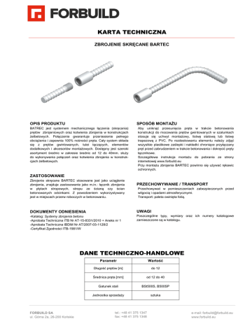 KARTA TECHNICZNA ZBROJENIE SKRĘCANE BARTEC SPOSÓB MONTAŻU OPIS PRODUKTU BATREC jest systemem mechanicznego łączenia (skręcania) prętów zbrojeniowych oraz kotwienia zbrojenia w konstrukcjach żelbetowych. Połączenie gwarantuje przeniesienie pełnego obciążenia i zapewnia 100% nośności pręta. Cały system składa się z prętów gwintowanych, tulei łączących, elementów dodatkowych i akcesoriów montażowych. Dostępny jest szeroki asortyment średnic w zakresie średnic od 12 do 40mm. służy do wykonywania połączeń oraz kotwienia zbrojenia w konstrukcjach żelbetowych. Aby uniknąć przesunięcia pręta w trakcie betonowania konstrukcji do mocowania prętów gwintowanych w szalunkach stosuje się uchwyt montażowy, listwę stalową lub listwę trapezową z PVC. Po rozdeskowaniu elementu należy zdjąć wszystkie plastikowe zaślepki i nakładki chroniące przyłączany pręt przed zabrudzeniem w trakcie betonowania i dokręcić pręty łącznikowe. Szczegółowa instrukcja montażu do pobrania ze strony internetowej www.forbuild.eu Przy montażu zbrojenia BARTEC powinno się używać rękawic ochronnych. ZASTOSOWANIE Zbrojenie skręcane BARTEC stosowane jest jako uciąglenie zbrojenia, znajduje zastosowanie jako m.in.: łącznik zbrojenia w płytach stropowych, stropu ze ścianą czy ścian betonowanych odcinkami. Z powodzeniem wykorzystywany jest w miejscach przerw roboczych w betonowaniu. PRZECHOWYWANIE / TRANSPORT Przechowywać w pomieszczeniach zabezpieczonych przed wilgocią i opadami atmosferycznymi. Transport: paleta owinięta folią. DOKUMENTY ODNIESIENIA UWAGI -Katalog: Systemy zbrojenia betonu -Aprobata Techniczna ITB Nr AT-15-8331/2010 + Aneks nr 1 -Aprobata Techniczna IBDiM Nr AT/2007-03-1128/2 -Certyfikat Zgodności ITB-1981/W Poszczególne typy, wymiary oraz ich numery katalogowe zamieszczone są w katalogu. DANE TECHNICZNO-HANDLOWE FORBUILD SA ul. Górna 2a, 26-200 Końskie Parametr Wartość Długość prętów [m] do 12 Średnica pręta [mm] od 12 do 40 Gatunek stali BSt500S, B500SP Jednostka sprzedaży sztuka tel.: +48 41 375 1347 fax: +48 41 375 1348 e-mail: [email protected] www.forbuild.eu RODZAJE POŁĄCZEŃ SYSTEMU ZBROJENIA SKRĘCANEGO BARTEC POŁĄCZENIE STANDARDOWE – TYP M Stosowane jest w przypadku gdy możliwy jest obrót pręta przyłączanego i przesuwanie go wzdłuż osi. POŁĄCZENIE POZYCYJNE – TYP MB Stosowane jest w przypadku gdy nie jest możliwy obrót pręta przyłączanego, ale możliwy jest jego przesuw wzdłuż osi. POŁĄCZENIE POZYCYJNE ZE STABILIZACJĄ – TYP MC Stosowane jest w przypadku gdy nie jest możliwy obrót pręta przyłączanego, ale możliwy jest jego przesuw wzdłuż osi a po wykonaniu połączenia pręt przyłączany musi być precyzyjnie położony względem pręta bazowego. POŁĄCZENIE DYSATANSOWE – TYP MD Stosowane jest w przypadku gdy pomiędzy czołami łączonych prętów może nastąpić dystans, lecz nie większy niż średnica łączonych prętów. POŁĄCZENIE REDUKCYJNE – TYP MR Stosowane jest w przypadku gdy możliwy jest obrót pręta przyłączanego i przesuwanie go wzdłuż osi, pręty przyłączany i bazowy mają różne średnice. POŁĄCZENIE SPAWANE – TYP W Stosowane jest w przypadku konieczności połączenia pręta zbrojeniowego z konstrukcją spawaną. Możliwy jest obrót pręta przyłączanego i przesuwanie go wzdłuż osi. 2015.05.08/010 Niniejsza karta katalogowa została opracowana przez firmę FORBUILD SA i pozostaje własnością firmy. Przedruk, kopiowanie oraz udostępnianie karty katalogowej w całości bądź części osobom do których nie jest kierowana, bez pisemnej zgody firmy FORBUILD SA są zabronione. Podstawa prawna –Dz. U. Nr 24/1994 poz. 83 z późniejszymi zmianami. Ustawa o prawie autorskim i prawach pokrewnych. FORBUILD SA ul. Górna 2a, 26-200 Końskie tel.: +48 41 375 1347 fax: +48 41 375 1348 e-mail: [email protected] www.forbuild.eu