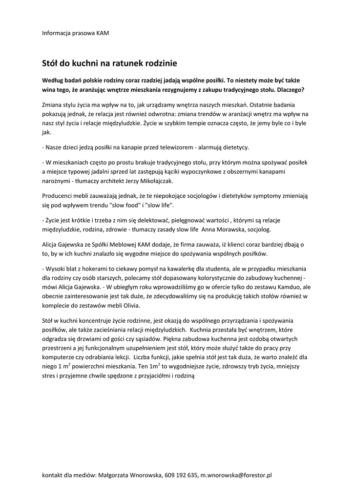 Informacja prasowa KAM Stół do kuchni na ratunek rodzinie Według badań polskie rodziny coraz rzadziej jadają wspólne posiłki. To niestety może być także wina tego, że aranżując wnętrze mieszkania rezygnujemy z zakupu tradycyjnego stołu. Dlaczego? Zmiana stylu życia ma wpływ na to, jak urządzamy wnętrza naszych mieszkań. Ostatnie badania pokazują jednak, że relacja jest również odwrotna: zmiana trendów w aranżacji wnętrz ma wpływ na nasz styl życia i relacje międzyludzkie. Życie w szybkim tempie oznacza często, że jemy byle co i byle jak. - Nasze dzieci jedzą posiłki na kanapie przed telewizorem - alarmują dietetycy. - W mieszkaniach często po prostu brakuje tradycyjnego stołu, przy którym można spożywać posiłek a miejsce typowej jadalni sprzed lat zastępują kąciki wypoczynkowe z obszernymi kanapami narożnymi - tłumaczy architekt Jerzy Mikołajczak. Producenci mebli zauważają jednak, że te niepokojące socjologów i dietetyków symptomy zmieniają się pod wpływem trendu "slow food" i "slow life". - Życie jest krótkie i trzeba z nim się delektować, pielęgnować wartości , którymi są relacje międzyludzkie, rodzina, zdrowie - tłumaczy zasady slow life Anna Morawska, socjolog. Alicja Gajewska ze Spółki Meblowej KAM dodaje, że firma zauważa, iż klienci coraz bardziej dbają o to, by w ich kuchni znalazło się wygodne miejsce do spożywania wspólnych posiłków. - Wysoki blat z hokerami to ciekawy pomysł na kawalerkę dla studenta, ale w przypadku mieszkania dla rodziny czy osób starszych, polecamy stół dopasowany kolorystycznie do zabudowy kuchennej mówi Alicja Gajewska. - W ubiegłym roku wprowadziliśmy go w ofercie tylko do zestawu Kamduo, ale obecnie zainteresowanie jest tak duże, że zdecydowaliśmy się na produkcję takich stołów również w komplecie do zestawów mebli Olivia. Stół w kuchni koncentruje życie rodzinne, jest okazją do wspólnego przyrządzania i spożywania posiłków, ale także zacieśniania relacji międzyludzkich. Kuchnia przestała być wnętrzem, które odgradza się drzwiami od gości czy sąsiadów. Piękna zabudowa kuchenna jest ozdobą otwartych przestrzeni a jej funkcjonalnym uzupełnieniem jest stół, który może służyć także do pracy przy komputerze czy odrabiania lekcji. Liczba funkcji, jakie spełnia stół jest tak duża, że warto znaleźć dla niego 1 m2 powierzchni mieszkania. Ten 1m2 to wygodniejsze życie, zdrowszy tryb życia, mniejszy stres i przyjemne chwile spędzone z przyjaciółmi i rodziną kontakt dla mediów: Małgorzata Wnorowska, 609 192 635, [email protected] Informacja prasowa KAM Zdjęcia w 300 dpi do pobrania www.forestor.pl/kam/stol Dąb sonoma w połączeniu z szarością - Spółka Meblowa KAM oferuje w tej kolorystyce meble kuchenne Kamduo oraz funkcjonalny stół z taboretami. kontakt dla mediów: Małgorzata Wnorowska, 609 192 635, [email protected] Informacja prasowa KAM Możliwość zabudowania szafek kuchennych pod sam sufit daje zestaw KAMDUO XL. Dzięki temu zyskujemy przestrzeń na duży stół kuchenny - oferowany opcjonalnie w zestawie z meblami. Nowością tego roku jest stół ofertowany w komplecie z zestawem mebli Olivia. Pochwała naturze w postaci pięknych frontów w dekorze drewnianym świetnie wpisuje się w styl slow life. Nawet w nowoczesnych projektach mebli kuchennych (KAMplus) należy pamiętać o wygodnym miejscu do spożywania posiłków. kontakt dla mediów: Małgorzata Wnorowska, 609 192 635, [email protected]