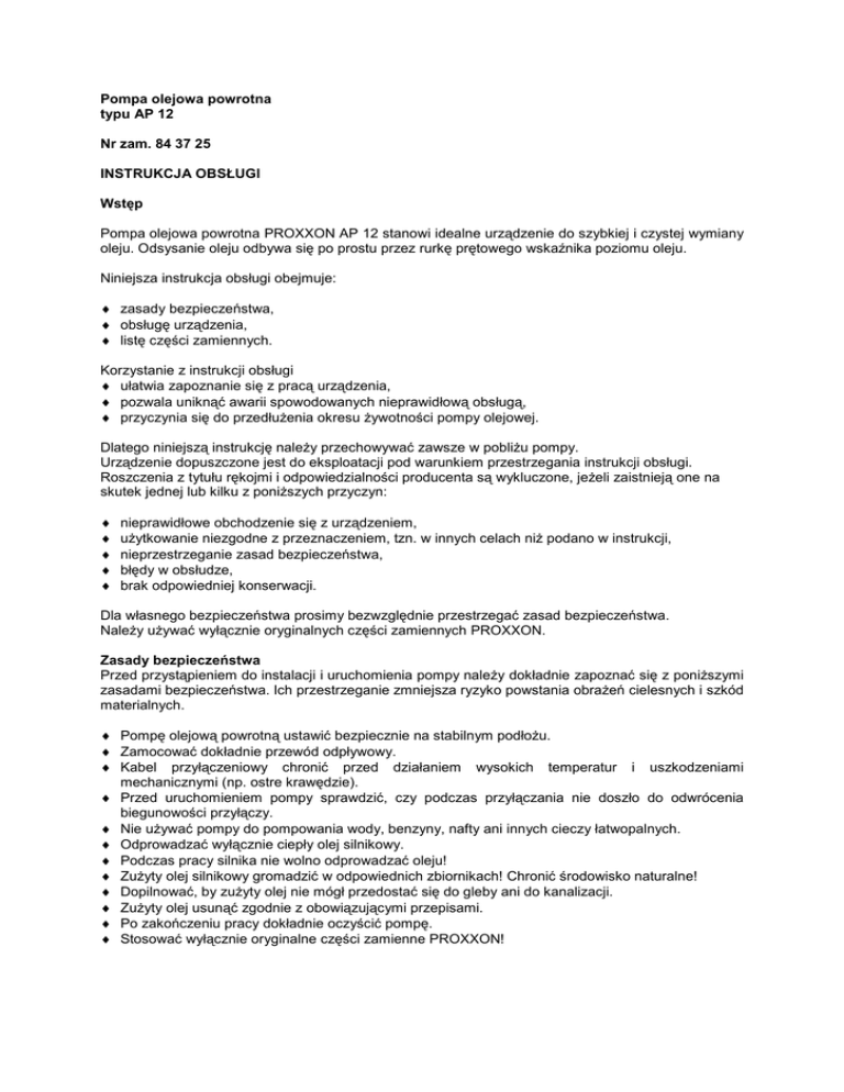 Pompa olejowa powrotna typu AP 12 Nr zam. 84 37 25 INSTRUKCJA OBSŁUGI Wstęp Pompa olejowa powrotna PROXXON AP 12 stanowi idealne urządzenie do szybkiej i czystej wymiany oleju. Odsysanie oleju odbywa się po prostu przez rurkę prętowego wskaźnika poziomu oleju. Niniejsza instrukcja obsługi obejmuje: ♦ zasady bezpieczeństwa, ♦ obsługę urządzenia, ♦ listę części zamiennych. Korzystanie z instrukcji obsługi ♦ ułatwia zapoznanie się z pracą urządzenia, ♦ pozwala uniknąć awarii spowodowanych nieprawidłową obsługą, ♦ przyczynia się do przedłużenia okresu żywotności pompy olejowej. Dlatego niniejszą instrukcję należy przechowywać zawsze w pobliżu pompy. Urządzenie dopuszczone jest do eksploatacji pod warunkiem przestrzegania instrukcji obsługi. Roszczenia z tytułu rękojmi i odpowiedzialności producenta są wykluczone, jeżeli zaistnieją one na skutek jednej lub kilku z poniższych przyczyn: ♦ ♦ ♦ ♦ ♦ nieprawidłowe obchodzenie się z urządzeniem, użytkowanie niezgodne z przeznaczeniem, tzn. w innych celach niż podano w instrukcji, nieprzestrzeganie zasad bezpieczeństwa, błędy w obsłudze, brak odpowiedniej konserwacji. Dla własnego bezpieczeństwa prosimy bezwzględnie przestrzegać zasad bezpieczeństwa. Należy używać wyłącznie oryginalnych części zamiennych PROXXON. Zasady bezpieczeństwa Przed przystąpieniem do instalacji i uruchomienia pompy należy dokładnie zapoznać się z poniższymi zasadami bezpieczeństwa. Ich przestrzeganie zmniejsza ryzyko powstania obrażeń cielesnych i szkód materialnych. ♦ Pompę olejową powrotną ustawić bezpiecznie na stabilnym podłożu. ♦ Zamocować dokładnie przewód odpływowy. ♦ Kabel przyłączeniowy chronić przed działaniem wysokich temperatur i uszkodzeniami mechanicznymi (np. ostre krawędzie). ♦ Przed uruchomieniem pompy sprawdzić, czy podczas przyłączania nie doszło do odwrócenia biegunowości przyłączy. ♦ Nie używać pompy do pompowania wody, benzyny, nafty ani innych cieczy łatwopalnych. ♦ Odprowadzać wyłącznie ciepły olej silnikowy. ♦ Podczas pracy silnika nie wolno odprowadzać oleju! ♦ Zużyty olej silnikowy gromadzić w odpowiednich zbiornikach! Chronić środowisko naturalne! ♦ Dopilnować, by zużyty olej nie mógł przedostać się do gleby ani do kanalizacji. ♦ Zużyty olej usunąć zgodnie z obowiązującymi przepisami. ♦ Po zakończeniu pracy dokładnie oczyścić pompę. ♦ Stosować wyłącznie oryginalne części zamienne PROXXON! Objaśnienia do rysunku 1. Sonda odsysająca, ∅ 6 mm 2. Przewód ssawny, ∅ 10 mm 3. Pompa olejowa powrotna 4. Zaciski przyłączeniowe 5. Kabel przyłączeniowy 6. Przewód odpływowy, ∅ 10 mm Opis urządzenia Pompa olejowa powrotna PROXXON AP 12 to pompa łopatkowa z płytkami mosiężnymi. Jest ona napędzana silnikiem prądu stałego 12 V poprzez przekładnię redukcyjną.. Zasilanie z akumulatora samochodowego 12 V. Oba króćce przyłączeniowe przeznaczone są do przewodów giętkich o średnicy wewnętrznej 10 mm. Zewnętrzna średnica sondy odsysającej wynosi 6 mm. Z tego względu pompa może być stosowana wyłącznie wtedy, gdy średnica wewnętrzna rurki prętowego wskaźnika poziomu oleju jest większa niż 6 mm. Pompa nadaje się do pompowania oleju silnikowego, oleju do silników wysokoprężnych oraz oleju opałowego. Dane techniczne Silnik: Pobór prądu: Poziom hałasu: Pompa: Maksymalne natężenie przepływu dla oleju do silników wysokoprężnych i oleju opałowego: Maksymalne natężenie przepływu podczas wymiany oleju sondą (przy temperaturze oleju 40°C) 12 V DC ok. 6 A ≤ 70 dB(A) pompa łopatkowa z płytkami mosiężnymi i przekładnią redukcyjną ok. 250 l/godz. ok. 3 l/min. Obsługa pompy Niebezpieczeństwo! Nie wolno używać pompy do pompowania wody, benzyny, nafty ani innych cieczy łatwopalnych! 1. W celu wymiany oleju silnikowego włączyć silnik i doprowadzić do rozgrzania oleju silnikowego do temperatury ok. 40°C. Uwaga! Nigdy nie uruchamiać silnika bez oleju! 2. Wyłączyć silnik. 3. Przewód ssawny (przewód tkaninowy, zakończony sondą odsysającą) nasadzić na króciec ssawny. Uwaga! Przewód odpływowy zamocować obejmą zaciskową, gdyż po doprowadzeniu ciśnienia może dojść do odłączenia przewodu. 4. Przewód odpływowy (przezroczysty) nasadzić na króciec odpływowy i zamocować obejmą. Wskazówka Sonda odsysająca została ciasno zrolowana ze względów transportowych. Podczas użytkowania musi ona przebiegać możliwie prosto, dlatego należy ją najpierw odginać dotąd aż zostanie wyprostowana. W razie wprowadzenia powyginanej sondy do miski olejowej odciąganie oleju nie nastąpi wcale lub będzie ono niedostateczne. Średnica zewnętrzna sondy odsysającej wynosi 6 mm. Z tego względu pompa może być stosowana wyłącznie wtedy, gdy średnica wewnętrzna rurki prętowego wskaźnika poziomu oleju jest większa niż 6 mm. 5. Wprowadzić sondę odsysającą do rurki prętowego wskaźnika poziomu oleju i wsunąć aż do najgłębszego punktu miski olejowej. Uwaga! Zużytego oleju nie wolno odprowadzać do gleby, ani do instalacji ściekowej. Takie postępowanie jest karalne i przyczynia się do zanieczyszczenia środowiska! Zużyty olej należy przekazywać zawsze do odpowiednich punktów składowania, w których zostanie on usunięty w sposób nieszkodliwy dla środowiska. 6. Końcówkę przewodu odpływowego wetknąć do odpowiedniego zbiornika. 7. Podłączyć pompę do akumulatora 12 V z uwzględnieniem właściwej biegunowości (zaciskiem czerwonym do (+), a zaciskiem czarnym do (-). 8. Włączyć pompę i odprowadzić olej. 9. Po zakończeniu procesu odsysania wyłączyć pompę. Zdjąć przewód ssawny i przewód odpływowy. 10. Zgodnie z instrukcją konserwacji pojazdu nalać świeżego oleju silnikowego. Ponownie wprowadzić prętowy wskaźnik poziomu oleju. Sprawdzić poziom oleju. Wskazówka Po zakończeniu