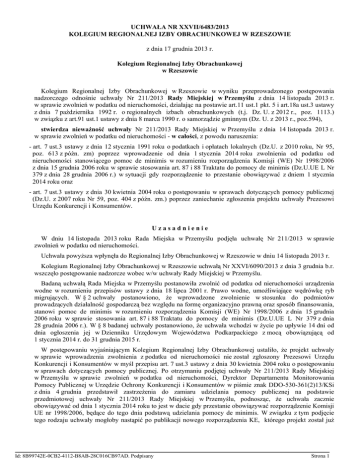 UCHWAŁA NR XXVII/6483/2013 KOLEGIUM REGIONALNEJ IZBY OBRACHUNKOWEJ W RZESZOWIE z dnia 17 grudnia 2013 r. Kolegium Regionalnej Izby Obrachunkowej w Rzeszowie Kolegium Regionalnej Izby Obrachunkowej w Rzeszowie w wyniku przeprowadzonego postępowania nadzorczego odnośnie uchwały Nr 211/2013 Rady Miejskiej w Przemyślu z dnia 14 listopada 2013 r. w sprawie zwolnień w podatku od nieruchomości, działając na postawie art.11 ust.1 pkt. 5 i art.18a ust.3 ustawy z dnia 7 października 1992 r. o regionalnych izbach obrachunkowych (t.j. Dz. U. z 2012 r., poz. 1113.) w związku z art.91 ust.1 ustawy z dnia 8 marca 1990 r. o samorządzie gminnym (Dz. U. z 2013 r., poz.594), stwierdza nieważność uchwały Nr 211/2013 Rady Miejskiej w Przemyślu z dnia 14 listopada 2013 r. w sprawie zwolnień w podatku od nieruchomości - w całości, z powodu naruszenia: - art. 7 ust.3 ustawy z dnia 12 stycznia 1991 roku o podatkach i opłatach lokalnych (Dz.U. z 2010 roku, Nr 95, poz. 613 z późn. zm) poprzez wprowadzenie od dnia 1 stycznia 2014 roku zwolnienia od podatku od nieruchomości stanowiącego pomoc de minimis w rozumieniu rozporządzenia Komisji (WE) Nr 1998/2006 z dnia 15 grudnia 2006 roku w sprawie stosowania art. 87 i 88 Traktatu do pomocy de minimis (Dz.U.UE L Nr 379 z dnia 28 grudnia 2006 r.) w sytuacji gdy rozporządzenie to przestanie obowiązywać z dniem 1 stycznia 2014 roku oraz - art. 7 ust.3 ustawy z dnia 30 kwietnia 2004 roku o postępowaniu w sprawach dotyczących pomocy publicznej (Dz.U. z 2007 roku Nr 59, poz. 404 z późn. zm.) poprzez zaniechanie zgłoszenia projektu uchwały Prezesowi Urzędu Konkurencji i Konsumentów. Uzasadnienie W dniu 14 listopada 2013 roku Rada Miejska w Przemyślu podjęła uchwałę Nr 211/2013 w sprawie zwolnień w podatku od nieruchomości. Uchwała powyższa wpłynęła do Regionalnej Izby Obrachunkowej w Rzeszowie w dniu 14 listopada 2013 r. Kolegium Regionalnej Izby Obrachunkowej w Rzeszowie uchwałą Nr XXVI/6090/2013 z dnia 3 grudnia b.r. wszczęło postępowanie nadzorcze wobec w/w uchwały Rady Miejskiej w Przemyślu. Badaną uchwałą Rada Miejska w Przemyślu postanowiła zwolnić od podatku od nieruchomości urządzenia wodne w rozumieniu przepisów ustawy z dnia 18 lipca 2001 r. Prawo wodne, umożliwiające wędrówkę ryb migrujących. W § 2 uchwały postanowiono, że wprowadzone zwolnienie w stosunku do podmiotów prowadzących działalność gospodarczą bez względu na formę organizacyjno prawną oraz sposób finansowania, stanowi pomoc de minimis w rozumieniu rozporządzenia Komisji (WE) Nr 1998/2006 z dnia 15 grudnia 2006 roku w sprawie stosowania art. 87 i 88 Traktatu do pomocy de minimis (Dz.U.UE L Nr 379 z dnia 28 grudnia 2006 r.). W § 8 badanej uchwały postanowiono, że uchwała wchodzi w życie po upływie 14 dni od dnia ogłoszenia jej w Dzienniku Urzędowym Województwa Podkarpackiego z mocą obowiązującą od 1 stycznia 2014 r. do 31 grudnia 2015 r. W postępowaniu wyjaśniającym Kolegium Regionalnej Izby Obrachunkowej ustaliło, że projekt uchwały w sprawie wprowadzenia zwolnienia z podatku od nieruchomości nie został zgłoszony Prezesowi Urzędu Konkurencji i Konsumentów w myśl przepisu art. 7 ust.3 ustawy z dnia 30 kwietnia 2004 roku o postępowaniu w sprawach dotyczących pomocy publicznej. Po otrzymaniu podjętej uchwały Nr 211/2013 Rady Miejskiej w Przemyślu w sprawie zwolnień w podatku od nieruchomości, Dyrektor Departamentu Monitorowania Pomocy Publicznej w Urzędzie Ochrony Konkurencji i Konsumentów w piśmie znak DDO-530-361(2)13/KSi z dnia 4 grudnia przedstawił zastrzeżenia do zamiaru udzielania pomocy publicznej na podstawie przedmiotowej uchwały Nr 211/2013 Rady Miejskiej w Przemyślu, podnosząc, że uchwała zacznie obowiązywać od dnia 1 stycznia 2014 roku to jest w dacie gdy przestanie obowiązywać rozporządzenie Komisji UE nr 1998/2006, będące do tego dnia podstawą udzielania pomocy de minimis. W związku z tym podjęcie tego rodzaju uchwały mogłoby nastąpić po publikacji nowego rozporządzenia KE, którego projekt został już Id: 8B99742E-0CB2-4112-B8AB-28C016CB97AD. Podpisany Strona 1 opracowany jako jeden z elementów przeprowadzanej przez Komisję reformy unijnych przepisów dotyczących pomocy publicznej. W związku z powyższym, Kolegium Regionalnej Izby Obrachunkowej zważyło co następuje: Zgodnie z przepisem art. 7 ust.3 ustawy z dnia 30 kwietnia 2004 roku o postępowaniu w sprawach dotyczących pomocy publicznej, projekt programu pomocowego przewidujący udzielanie pomocy de minimis podlega wyłącznie zgłoszeniu Prezesowi Urzędu, który w terminie 14 dni może przedstawić zastrzeżenia dotyczące przejrzystości zasad udzielania pomocy. Zaniechanie zgłoszenia Prezesowi UOKiK projektu badanej uchwały Nr 211/2013 Rady Miejskiej w Przemyślu, przewidującej udzielenie pomocy de minimis oznacza niespełnienie wymogu ustawowego wynikającego z powołanego przepisu art. 7 ust.3 ustawy o postępowaniu w sprawach dotyczących pomocy publicznej. Zgodnie z orzecznictwem Regionalnych Izb Obrachunkowych, uchwała podjęta bez uprzedniego przesłania projektu tej uchwały do Prezesa Urzędu Ochrony Konkurencji i Konsumentów jest nieważna (uchwała RIO w Katowicach z dnia 31 lipca 2008 roku czy uchwała RIO w Warszawie z dnia 24 kwietnia 2012 roku -orzecznictwo LEX do art.7 ustawy o postępowaniu w sprawach dotyczących pomocy publicznej). Ponadto biorąc pod uwagę zgłoszone przez UOKiK uwagi do podjętej uchwały, dotyczące braku podstaw udzielania pomocy od dnia 1 stycznia 2014 roku z uwagi na utratę mocy obowiązującej powołanego w uchwale Rady Miejskiej rozporządzenia komisji (WE) Nr 1998/2006 z dnia 15 grudnia 2006 roku w sprawie stosowania art. 87 i 88 Traktatu do pomocy de minimis (Dz.U.UE L Nr 379 z dnia 28 grudnia 2006 r.), podjęta uchwała Nr 211/2013 Rady Miejskiej w Przemyślu w sprawie zwolnień w podatku od nieruchomości nie będzie możliwa do stosow