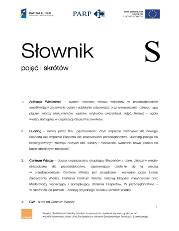 Słownik S pojęć i skrótów 1. Aplikacja Wiedzomat – system wymiany wiedzy wdrożony w przedsiębiorstwie umożliwiający zadawanie pytań i udzielanie odpowiedzi oraz umieszczanie różnego typu pigułek wiedzy (dokumentów, wpisów, artykułów, prezentacji, zdjęć, filmów) – ogółu wiedzy dostępnej w organizacji dla jej Pracowników. 2. Budding – rozwój przez tzw. „pączkowanie”, czyli: wsparcie rozwojowe dla nowego Eksperta lub wsparcie Eksperta dla pracowników przedsiębiorstwa. Budding polega na nieskrępowanym rozwoju nowych idei, wiedzy i możliwości tworzenia nowej jakości na bazie istniejących rozwiązań. 3. Centrum Wiedzy – obszar organizacyjny, skupiający Ekspertów z danej dziedziny wiedzy strategicznej dla przedsiębiorstwa, zapewniający dzielenie się tą wiedzą w przedsiębiorstwie. Centrum Wiedzy jest zarządzane i rozwijane przez Lidera Zarządzania Wiedzą. Działania Centrum Wiedzy realizują Eksperci merytoryczni oraz Moderatorzy wspierający i porządkujący działania Ekspertów. W przedsiębiorstwie – w zależności od potrzeb – działają od jednego do kilku Centrów Wiedzy. 4. CW – skrót od Centrum Wiedzy 1 Projekt „Światłowód Wiedzy źródłem motywacji do dzielenia się wiedzą eksperta” współfinansowany przez Unię Europejską w ramach Europejskiego Funduszu Społecznego. 5. Działania w klasie – ogół aktywności dydaktycznych odbywających się stacjonarnie (szkolenia, warsztaty, instruktarze, staże, konferencje), gdzie jest bezpośredni kontakt uczestników z prowadzącymi. Termin powstał w odróżnieniu od aplikacji Wiedzomat. 6. Ekspert – osoba działająca w CW jako specjalista, mający szczególną wiedzę w wybranej dziedzinie i motywację, aby swoją wiedzą dzielić się z innymi pracownikami w przedsiębiorstwie. 7. Katalog aktywności Eksperta – opisuje działania Eksperta związane z dzieleniem się wiedzą i podlegające ewaluacji. (Rekomendacja: lista działań jest „otwarta” i powinna być rozwijana i aktualizowana w zależności od potrzeb danego przedsiębiorstwa). 8. Kodeks Eksperta – zasady, jakimi powinien się kierować Ekspert działając w CW. Kandydaci na Ekspertów zapoznają się z Kodeksem Eksperta i podpisują dokument, w którym zobowiązują się działać zgodnie z tymi zasadami. 9. Lider ZW – stanowisko/ rola przypisane osobie odpowiedzialnej w firmie za prawidłową realizację procesu ZW, nadzór nad procesem ZW w przedsiębiorstwie. 10. LZW – skrót od Lider ZW 11. Managin Managinno – aplikacja (narzędzie informatyczne) wspomagające prowadzenie akcji innowacyjności polegających na zgłaszaniu, komentowaniu, nominowaniu nowych pomysłów. 12. Mentoring – obejmuje bezpośrednią pomoc w rozwoju, doradztwo i nieformalną wymianę informacji1. 1 Za: David Clutterback, Everyone needs a mentor, 1991, w: Trener i mentor, Parsloe i Wray 2003. 2 Projekt „Światłowód Wiedzy źródłem motywacji do dzielenia się wiedzą eksperta” współfinansowany przez Unię Europejską w ramach Europejskiego Funduszu Społecznego. 13. Moderator CW – rola pełniona przez Lidera ZW w średniej wielkości przedsiębiorstwie lub wyodrębnione stanowisko w dużym przedsiębiorstwie. Moderator może być przypisany do CW lub do innej funkcji w strukturze organizacyjnej. Moderator przygotowuje i aktualizuje Pigułki Wiedzy i zapewnia wsparcie techniczne dla Eksperta. Jest też łącznikiem pomiędzy Ekspertem a LZW. 14. N+1 N+1 – kierownictwo naczelnego poziomu w organizacji, w strukturze organizacyjnej zaraz pod zarządem przedsiębiorstwa 15. Pigułki wiedzy – niewielkie, skondensowane treściowo i tematycznie dokumenty – artykuły, prezentacje, filmy itp. zamieszczane w aplikacji Wiedzomat. Zazwyczaj Ekspert przekazuje do Moderatora treści, które Moderator zamieszcza w aplikacji Wiedzomat w postaci pigułki wiedzy. 16. Profil Eksperta w Bazie Wiedzy – zakładka będąca „wizytówką” Eksperta w aplikacji Wiedzomat zawierająca jego dane, obszar ekspertyzy, aktywność i jego Pigułki Wiedzy. 17. Profil Roli Eksperta – profil kompetencyjny Eksperta oraz obszary odpowiedzialności przypisane roli Eksperta. 18. Think tank (ang., dosłownie: zbiornik myśli) – komitet doradczy, z założenia niezależny, niedziałający dla zysku ośrodek zajmujący się badaniami i analizami dotyczącymi spraw publicznych. Do celów działalności think tanków należy zazwyczaj poszukiwanie sposobów rozwiązania problemów społecznych i udział w publicznej debacie. Spotkać można szersze rozumienie tego pojęcia, na oznaczenie grupy osób lub instytucji mających podobne cele, ale niekoniecznie posiadających status organizacji pozarządowych. Źródło: http://pl.wikipedia.org/wiki/Think_tank 19. Uczenie się „na żądanie” (z jęz. angielskiego: „on demand”) – forma uczenia się w dowolnym czasie i miejscu, w momencie zaistnienia potrzeby pozyskania określonej wiedzy. Charakteryzuje się częstym użyciem technologii informatycznych. 3 Projekt „Światłowód Wiedzy źródłem motywacji do dzielenia się wiedzą eksperta” współfinansowany przez Unię Europejską w ramach Europejskiego Funduszu Społecznego.