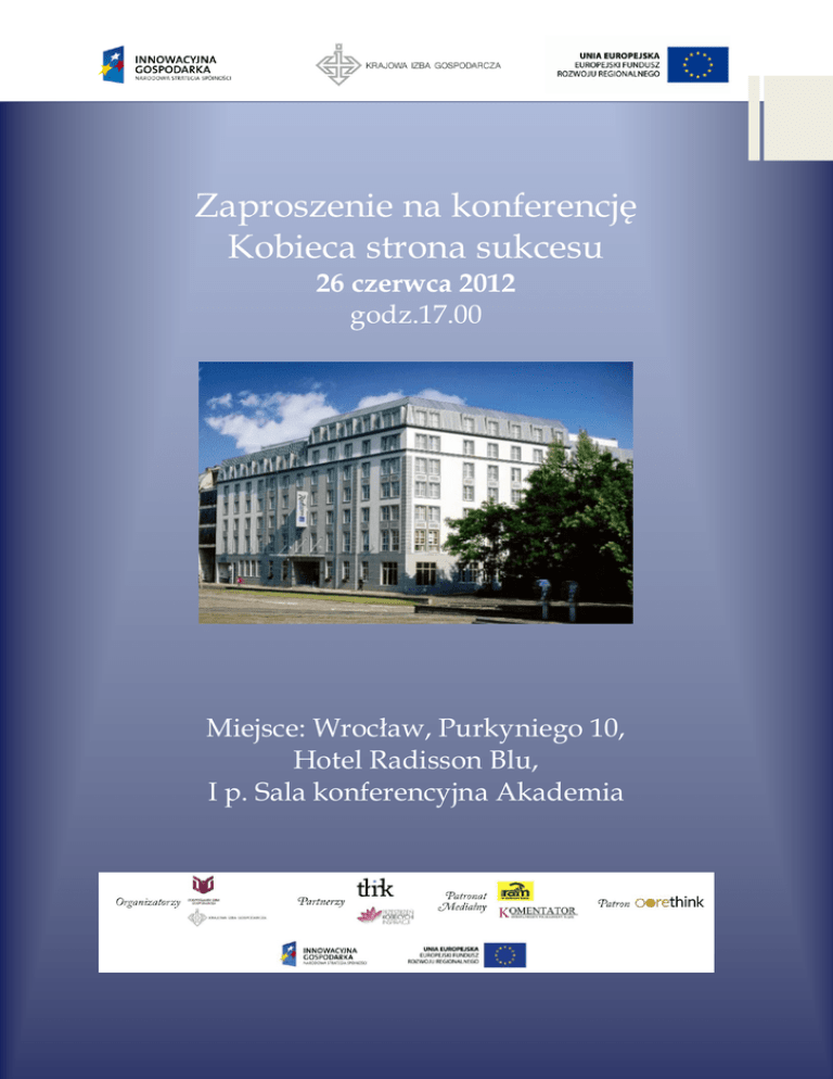 Zaproszenie na konferencję Kobieca strona sukcesu 26 czerwca 2012 godz.17.00 Organizator: Dolnośląska Izba Gospodarcza Miejsce: Wrocław, Purkyniego 10, Hotel Radisson Blu, I p. Sala konferencyjna Akademia ZAPROSZENIE Szanowne Panie, w imieniu Dolnośląskiej Izby Gospodarczej oraz Krajowej Izby Gospodarczej mamy przyjemność zaprosić do udziału w konferencji pod tytułem: KOBIECA STRONA SUKCESU 26- go czerwca (wtorek) 2012 r. Hotel Radisson Blu, sala konferencyjna Akademia Ip. w godz. 17.00 – 20.30 Agenda: 17.00 Powitanie gości przez organizatorów. Przedstawienie idei projektu i programu LEM Platformy wspierającej inwestowanie w przedsiębiorstwa. Zbigniew Sebastian – Prezes Dolnośląskiej Izby Gospodarczej Sylwia Lasota – Szef projektów unijnych w Dolnośląskiej Izbie Gospodarczej Julita Markiewicz Patkowska – Vice Dyrektor Dolnośląskiej Izby Gospodarczej Partner merytoryczny 17.30 Kobieca strona sukcesu Sukces - co to naprawdę znaczy? 6 czynników sukcesu. Coachingowa ścieżka dla kobiet. Prowadząca: Joanna Konczanin - trener z międzynarodowym doświadczeniem szkoleniowym, jedna z pierwszych osób w Polsce posiadająca tytuł coach-supervisor, właścicielka firmy szkoleniowe Masterskills, autorka projektu "Przestrzeń Kobiecych Inspiracji" 18.40 Rozstrzygniecie konkursu Lider Rynku Lokalnego, którego celem jest wyłonienie kobiety-przedsiębiorcy, która prowadzi i jednocześnie zarządza firmą na rynku lokalnym. 19.10 - 19. 40 Panel dyskusyjny „Kompetencje ponad stereotypami oraz siła stereotypów, dlaczego w biznesie i życiu publicznym dominują mężczyźni.” W panelu udział wezmą: Dagmara Płoszajska – właścicielka Agencji Brandingowej think oraz prezes Fundacji Rethink Poland Krzysztof Tokarz – Dziennikarz „Stosunki międzynarodowe”, Redaktor naczelny magazynu „Komentator”. Wojciech Piotrowski – Redaktor programu TVP3 „ Praca.Biznes.Innowacje” Laureatka konkursu Małgorzata Chorażewska – Specjalista stosunków polsko – włoskich w firmie E-Work. Moderator: Sylwia Lasota – Szef projektów unijnych w DIG Po spotkaniu zapraszamy na dalsze rozmowy przy kawie. Mamy nadzieję na Pani udział w konferencji. W celu potwierdzenia zgłoszenia proszę o wypełnienie i odesłanie formularza zgłoszeniowego na adres mailowy: [email protected] Liczba miejsc ograniczona, decyduje pierwszeństwo zgłoszeń. TYLKO 30 MIEJSC Dolnośląska Izba Gospodarcza, tel. +48 606 969 064 Partner merytoryczny