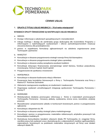 CENNIK USŁUG 1. OPŁATA OPŁATA Z TYTUŁU USŁUG INKUBACJI I - 70 zł netto miesięcznie* W RAMACH OPŁATY ŚWI ŚWIADCZONE SĄ NASTEPUJĄCE USŁUGI INKUBACJI: INKUBACJI: a. WIEDZA • • Dostęp i informacje o szkoleniach specjalistycznych i menedżerskich • pomoc w wypełnianiu formularzy zgłoszeniowych na szkolenia organizowane przez Technopark i partnerów Usługa mailingu i dostęp do zamkniętej grupy dyskusyjnej dla Uczestników Programu z informacjami o nadchodzących wydarzeniach i ofercie zachodniopomorskich instytucji otoczenia biznesu dla przedsiębiorców b. WARSZTAT • • • • Konsultacje w obszarze przygotowania strategii rozwoju firmy lub biznesplanu • Przygotowanie do spotkania z inwestorem Konsultacje w obszarze przygotowania strategii/ planu sprzedaży Konsultacje w obszarze analizy zarządzania zasobami ludzkimi Konsultacje dotyczące finansowania zewnętrznego (anioł biznesu, fundusz pożyczkowy, inwestycyjny, Venture Capital, Seed Capital) c. WSPÓŁPRACA • • Konsultacje w obszarze budowania relacji z Klientem • • Ułatwianie nawiązywania współpracy ze studentami i naukowcami Poszerzenie bazy kontaktów biznesowych o firmy z Technoparku Pomerania oraz firmy z Klastra ICT Pomorze Zachodnie Organizacja wydarzeń umożliwiających integrację społeczności Technoparku Pomerania i branży IT d. WIZERUNEK • Wielokanałowe działania promocyjne: informacja o firmie w materiałach promocyjnych Technoparku Pomerania - broszury, plakaty, wydarzenia, strona www, newsletter, artykuły prasowe • Wyszukiwanie i proponowanie udziału w konkursach branżowych, pomoc w przygotowaniu zgłoszenia • • • Konsultacje z ekspertem ds. PR • Dystrybucja komunikatów kanałami własnymi działu PR Technoparku nt. osiągnięć firmy, wyników pracy lub wydarzeń wraz z dystrybucją do o odpowiednich mediów ogólnopolskich, regionalnych, branżowych na podstawie materiałów otrzymanych od firmy oraz działań własnych działu PR. Konsultacje w obszarze analizy strategii/ planu marketingowego Konsultacje i pomoc w przygotowaniu: materiałów reklamowych, artykułów prasowych lub komunikatów medialnych 1 * Nie dotyczy innowacyjnych projektów wybranych przez Komisję Rekrutacyjną Technoparku Pomerania do udziału w Programie Inkubacji, na podstawie formularza zgłoszeniowego i spotkania. 2. OPŁATY Z TYTUŁU USŁUG INKUBACJI II* II* • • • • Doradztwo prawne -50 zł/godzina (maksymalnie 5 godzin w miesiącu) Doradztwo biznesowe - 50 zł/godzina (maksymalnie 5 godzin w miesiącu) Mentoring biznesowy- 50 zł/godzina (maksymalnie 5 godzin w miesiącu) Doradztwo w przygotowaniu wniosków do projektów finansowanych ze środków UE - cena ustalana indywidualne. * Nie dotyczy innowacyjnych projektów wybranych przez Komisję Rekrutacyjną Technoparku Pomerania do udziału w Programie Inkubacji, na podstawie formularza zgłoszeniowego i spotkania. 3. OPŁATY OPŁATY Z TYTUŁU NAJMU • POJEDYNCZE BIURA Okres najmu 1 rok pobytu 2 rok pobytu Stawka netto m2 /miesiąc* 38 zł 48 zł Dodatkowo: a. Opłata eksploatacyjna – 0,60 zł/ m2 miesięcznie b. Opłata z tytułu świadczenia usługi nieprzerwanej dostawy prądu i utrzymania gwarantowanego napięcia – 0,85 zł do każdego zużytego kW prądu z gniazda gwarantowanego napięcia c. koszty energii według wskazań podlicznika po stawkach dostawcy energii elektrycznej, d. Opłaty zawarte w punktach b i c punktu będą naliczane w terminach narzuconych przez dostawcę energii. • OTWARTA POWIERZCHNIA BIUROWA Rodzaj boksu Mały boks (2-3 osoby) Duży boks (3-4 osoby) Stawka netto za boks biurowy/ biurowy/ miesiąc ** 350 zł 400 zł ** W opłatę wliczony jest koszt energii elektrycznej. 4. UDOSTĘPNIENIE INFRASTRUKTURY SERWEROWNI Usługa Kolokacja serwerów i szaf Serwer dedykowany Serwer wirtualny Hosting Cena netto cena ustalana indywidualne cena ustalana indywidualne cena ustalana indywidualne cena ustalana indywidualne 2 5. USŁUGA „WIRTUALNE BIURO” Cena brutto/miesiąc Usługa • Adres w celach rejestracyjnych oraz do prowadzenia działalności gospodarczej, • odbiór korespondencji, • powiadomienie e-mailem o przesyłkach • 2 godziny wynajmu sali spotkań w miesiącu • Adres w celach rejestracyjnych oraz do prowadzenia działalności gospodarczej, • odbiór korespondencji, • powiadomienie e-mailem o przesyłkach • 2 godziny wynajmu sali spotkań w miesiącu • odsyłanie przesyłek na wskazany adres • Adres w celach rejestracyjnych oraz do prowadzenia działalności gospodarczej, • odbiór korespondencji, • powiadomienie e-mailem o przesyłkach • 2 godziny wynajmu sali spotkań w miesiącu • odsyłanie przesyłek na wskazany adres • USŁUGI INKUBACJI I (patrz Cennik: str. 1) 90 zł 110 zł 180 zł 6. SALE SZKOLENIOWE • Sala o powierzchni 20 m2 (do 10 osób) Ilość Lokatorzy 1 godzina 15 zł netto • Sala o powierzchni 55 m2 (do 30 osób) Ilość Lokatorzy Do 4 godzin 8 godzin Powyżej 2 dni 90 zł netto 150 zł netto 100 zł netto / dzień • Pozostali Użytkownicy 25 zł netto Pozostali Użytkownicy 300 zł netto 420 zł netto 380 zł netto / dzień Sala o powierzchni 110 m2 (do 70 osób) Ilość Lokatorzy Do 4 godzin 8 godzin Powyżej 2 dni 100 zł netto 180 zł netto 150 zł netto / dzień Pozostali Pozostali Użytkownicy 400 zł netto 520 zł netto 420 zł netto / dzień Ostatnia aktualizacja: czerwiec 2013 r. Niniejszy dokument nie stanowi oferty handlowej w rozumieniu przepisów kodeksu cywilnego. 3