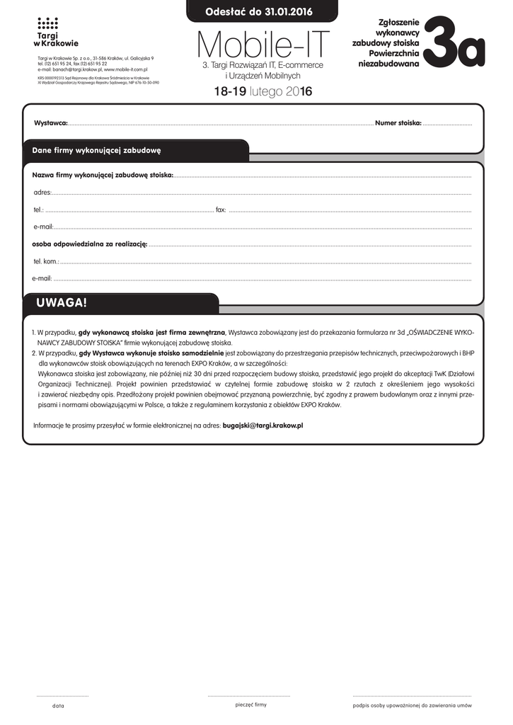 Odesłaç do 31.01.2016 Targi w Krakowie Sp. z o.o., 31-586 Kraków, ul. Galicyjska 9 tel. (12) 651 95 24, fax (12) 651 95 22 e-mail: [email protected], www.mobile-it.com.pl KRS 0000192313 Sàd Rejonowy dla Krakowa ÂródmieÊcia w Krakowie XI Wydzia∏ Gospodarczy Krajowego Rejestru Sàdowego, NIP 676-10-50-090 Mobile-IT 3. Targi Rozwiązań IT, E-commerce i Urządzeń Mobilnych Zgłoszenie wykonawcy zabudowy stoiska Powierzchnia niezabudowana 3a 18-19 lutego 2016 Wystawca:......................................................................................................................................................................................... Numer stoiska: ............................... Dane firmy wykonujàcej zabudow´ Nazwa firmy wykonującej zabudowę stoiska:...................................................................................................................................................................................... adres:................................................................................................................................................................................................................................................................ tel.: ....................................................................................................... fax: .................................................................................................................................................... e-mail:............................................................................................................................................................................................................................................................... osoba odpowiedzialna za realizację: ..................................................................................................................................................................................................... tel. kom.: ........................................................................................................................................................................................................................................................... e-mail: ............................................................................................................................................................................................................................................................... UWAGA! 1. W przypadku, gdy wykonawcą stoiska jest firma zewnętrzna, Wystawca zobowiązany jest do przekazania formularza nr 3d „OŚWIADCZENIE WYKONAWCY ZABUDOWY STOISKA” firmie wykonującej zabudowę stoiska. 2. W przypadku, gdy Wystawca wykonuje stoisko samodzielnie jest zobowiązany do przestrzegania przepisów technicznych, przeciwpożarowych i BHP dla wykonawców stoisk obowiązujących na terenach EXPO Kraków, a w szczególności: Wykonawca stoiska jest zobowiązany, nie później niż 30 dni przed rozpoczęciem budowy stoiska, przedstawić jego projekt do akceptacji TwK (Działowi Organizacji Technicznej). Projekt powinien przedstawiać w czytelnej formie zabudowę stoiska w 2 rzutach z określeniem jego wysokości i zawierać niezbędny opis. Przedłożony projekt powinien obejmować przyznaną powierzchnię, być zgodny z prawem budowlanym oraz z innymi przepisami i normami obowiązującymi w Polsce, a także z regulaminem korzystania z obiektów EXPO Kraków. Informacje te prosimy przesyłać w formie elektronicznej na adres: [email protected] .................................... data ......................................................... piecz´ç firmy .................................................................................. podpis osoby upowa˝nionej do zawierania umów