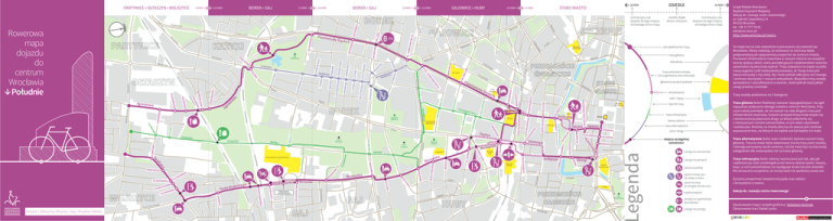 BOREK • GAJ GAJOWICE • HUBY 12 MIN 18 MIN Ga 24 MIN A skiego Pod wal e Bogusław AT RA LN A PI ŁS Łódzka ALE TE PODW ALE PODW trasa alternatywna SZEWSKA ŁACIARSKA miejsca szczególnej ostrożności: BISKUPIA Skargi Galeria Dominikańska Podwale ka bs Park Słowackiego gu Pułaskieg o tta Hu Tr au nna ulice i drogi go ackie Słow a Gajow łącznik trasy tereny zielone Szewska Urząd Miejski Wrocławia Wydział Inżynierii Miejskiej Sekcja ds. rozwoju ruchu rowerowego ul. Gabrieli Zapolskiej 2-4 50-032 Wrocław tel. +48 71 777 78 42 [email protected] http://www.wroclaw.pl/rowery Ta mapa ma na celu ułatwienie w poruszaniu się rowerem po Wrocławiu. Mamy nadzieję, że wskazane na niej trasy będą podpowiedzią jak najsprawniej przejechać do centrum miasta. Ponieważ infrastruktura rowerowa w naszym mieście nie wszędzie tworzy spójną całość, wielu początkujących użytkowników rowerów zastanawia się jaką trasę wybrać. Trasy wskazane na mapie są tylko naszą sugestią i jeśli lubisz/wolisz/uważasz, że Twoja trasa jest lepsza korzystaj z niej dalej. Być może jednak odkryjesz coś nowego i zechcesz skorzystać z naszych wskazówek. Wszystkie trasy zostały sprawdzone i zweryfikowane w terenie. Jeżeli jednak masz jakieś uwagi prosimy o kontakt. Trasy zostały podzielone na 3 kategorie: trasa rekreacyjna Ratusz egenda LE DW A PO KOŚCIUSZKI IEGO ŃSKA NA WESOŁA KOŚCIUSZKI IWA CKA ZAOLZ IA RADO S WIELK A SANO NNA Kościu szki A PRZESTRZ ENNA GLINIA Kamienna PIŁSUDSK WIELK A WIŚNIOWA NA STUD ZIE BOW A SZTA SZC ZĘŚ L A W IŚ NI OW KASZTAN OWA KASZTAN OWA wa iałko Dz A KO W AŁ Dworcowa Bazylika św. Elżbiety Poczta Kamie WEIGLA DZ I N KAMIEN A ST ZY EC WI NA ŚLICZ DŁUGOPOLSKA Kołłątaja skrzyżowanie rzeki i stawy ŁACIARSKA WA NO A Dworzec Główny icz a Widok MENNICZA A Renoma Stawowa PIŁSUDSKIEGO N CYJ EK Dworzec PKS Opera Świdnicka TEATRALNA R DY ska Borow pn E NA OD Ślężna OB SW SOJOWA WIELKA WIŚNIOW A PL. PO WSTA ŃCÓW ŚL. HALL ERA JAST RZĘB I LIPOWA JAST RZĘB IA LIPOWA JAWORO WA JARZĘBIN OWA JARZĘBIN DĘBOWA DĘBOWA OWA OSKA KAMP IN CISOWA RNIE W ICKA PUŁT USKA SKIE CZEREŚN IOWA A ŁUBINO W a ŁUBINOW Arkady główne/znaczące budowle Kru RYSIA PODWAL Strachowskiego zabudowa trasa jednokierunkowa lub sugerowany kierunek jazdy KAZIMIERZA WIELKIEGO ndor ska Wzgórze Andersa a wsk Boro j rajowe Armii K Świeradowska I NKOWA Y JASIENIC K KUKUCZ Planowana modernizacja Kom a ŚLĘŻN Aquapark NIA Borowska Borowska PRZYSTA go oweckie Grota-R Spiska WA WIŚNIO na ial iego oweck Grota-R A SK IOW ZN UC A KOW RCZY STO OWA IPAN TUL Park Andersa Hotel ląs Wrocław kic h ŚLĘŻNA O KUR Uniwersytecki Szpital Kliniczny f ra Pa UCZNIOWSKA WIŚNIOWA Spiska sta tań ców Ś A Park Skowroni iaź dzi A Kamienn WA INO B ŁU Orawska ego Gw Pow s Uniwersytet Ekonomiczny Ślężna trasa główna ski NASYPOW na Cmentarz Żydowski NENCKIEGO Dojazd z Ołtaszyna, Wojszyc, Gaju, Krzyków i Borka DRUK ARSK A A Orawska Sky Tower . Ślęż e gr liń ŚL a ow t s ecka Sud Zie ÓW ŃC Zwycięska NA na Za A ST OW ĘŻ Ślęż orientacyjny czas dojazdu do tego miejsca od lewego końca mapy początek/koniec trasy Dworzec Świebodzki le Podwa P AC ŚL NA WCZA BORÓ WA NO I KAL A DOWA MKOW JAGO POZIO Agrestowa Sudecka osiedla objęte danym arkuszem 24 MIN ta os Pr ska poro PL Sudecka a rosk o Zap ska yń isz OW A WA ABO SZT IG Ołtaszyńsk a ka ros o Zap ab Gr a ow ig Park Południowy ich JAWORO WA c yś KUTNO WSKA W WY ŚC Wyścig owa Powsta ńców Ślą sk orientacyjny czas dojazdu do tego miejsca od prawego końca mapy a zow Tęc ńców Powsta Karkonoska h Śląskic ick a Pretficza ka ŁNOC PÓ Rowerowa mapa dojazdu do centrum Wrocławia Południe Karkonos Lwows ka jow OSIEDLE 18 MIN STARE MIASTO 6 MIN PIŁSUDS KIEGO UD SK IEG O 18 MIN BOGUSŁAWSKIEGO 12 MIN DNA BOREK • GAJ 24 MIN SWOBO 6 MIN SUCHA PARTYNICE • OŁTASZYN • WOJSZYCE uwaga na samochody uwaga na pieszych zjazd na jezdnię zjazd na lewy pas do skrętu w lewo zjazd na trasę po drugiej stronie ulicy wąski przejazd uwaga na sygnalizację kierunkową uwaga na pociągi Trasa główna (kolor fioletowy) stanowi najwygodniejsze i na ogół najszybsze połączenie danego osiedla z centrum Wrocławia. Przy czym należy pamiętać, że nie zawsze na całej długości trasy jest infrastruktura rowerowa. Czasami przejazd trasą może wiązać się z koniecznością pokonania drogi, na której zetkniemy się z intensywnym ruchem samochodów, w tym także ciężarówek i autobusów. Niestety na chwilę obecną nie zawsze jest możliwe wyznaczenie tras, na których nie będzie aut lub będzie ich mało. Trasa alternatywna (kolor szaro-niebieski) stanowi wariant trasy głównej. Trasa ta może także obejmować trochę inną cześć osiedla, z którego poruszamy się do centrum, lub też może być na niej mniej udogodnień dla rowerzystów niż na trasie głównej. Trasa rekreacyjna (kolor zielony) wyznaczona jest tak, aby jak najdłuższa jej część przebiegała przez tereny zielone (parki, skwery, lasy), a ruch samochodowy nie występuje wcale lub jest niewielki. Nie oznacza to oczywiście, że na tej trasie nie spotkamy wcale aut. Życzymy przyjemnej i bezpiecznej jazdy oraz radości z korzystania z roweru. Sekcja ds. rozwoju ruchu rowerowego Opracowanie mapy i projekt graficzny: Sebastian Kończak Opracowanie tras: Radek Lesisz