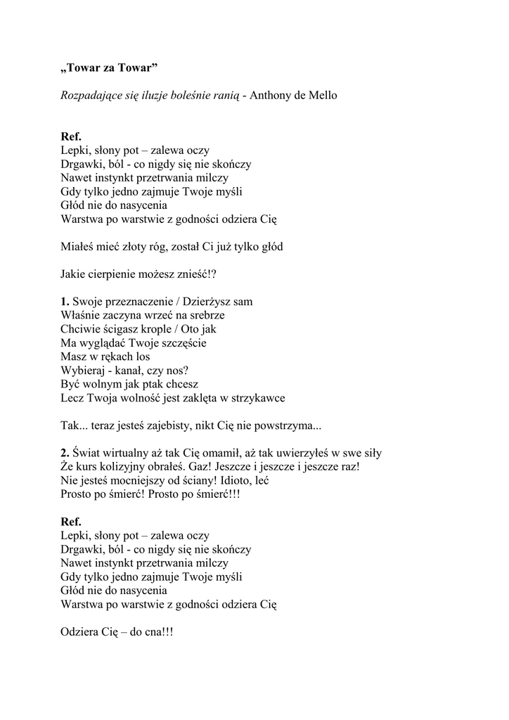 „Towar za Towar” Rozpadające się iluzje boleśnie ranią - Anthony de Mello Ref. Lepki, słony pot – zalewa oczy Drgawki, ból - co nigdy się nie skończy Nawet instynkt przetrwania milczy Gdy tylko jedno zajmuje Twoje myśli Głód nie do nasycenia Warstwa po warstwie z godności odziera Cię Miałeś mieć złoty róg, został Ci już tylko głód Jakie cierpienie możesz znieść!? 1. Swoje przeznaczenie / Dzierżysz sam Właśnie zaczyna wrzeć na srebrze Chciwie ścigasz krople / Oto jak Ma wyglądać Twoje szczęście Masz w rękach los Wybieraj - kanał, czy nos? Być wolnym jak ptak chcesz Lecz Twoja wolność jest zaklęta w strzykawce Tak... teraz jesteś zajebisty, nikt Cię nie powstrzyma... 2. Świat wirtualny aż tak Cię omamił, aż tak uwierzyłeś w swe siły Że kurs kolizyjny obrałeś. Gaz! Jeszcze i jeszcze i jeszcze raz! Nie jesteś mocniejszy od ściany! Idioto, leć Prosto po śmierć! Prosto po śmierć!!! Ref. Lepki, słony pot – zalewa oczy Drgawki, ból - co nigdy się nie skończy Nawet instynkt przetrwania milczy Gdy tylko jedno zajmuje Twoje myśli Głód nie do nasycenia Warstwa po warstwie z godności odziera Cię Odziera Cię – do cna!!! Jeśli masz kontrolę – To pokaż! Odstaw to! Odstaw to! Godność zaczyna przegrywać z bólem Czas przełamać wstyd To handel wymienny, więc musisz iść W noc / Jako towar za towar!