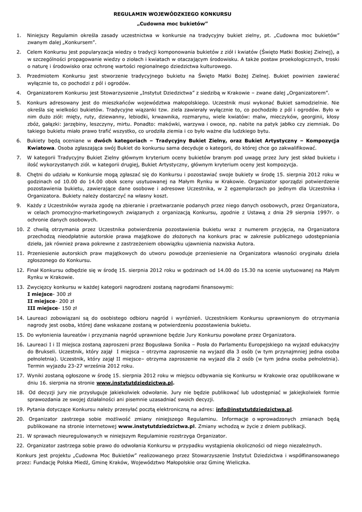 REGULAMIN WOJEWÓDZKIEGO KONKURSU „Cudowna moc bukietów” 1. Niniejszy Regulamin określa zasady uczestnictwa w konkursie na tradycyjny bukiet zielny, pt. „Cudowna moc bukietów” zwanym dalej „Konkursem”. 2. Celem Konkursu jest popularyzacja wiedzy o tradycji komponowania bukietów z ziół i kwiatów (Święto Matki Boskiej Zielnej), a w szczególności propagowanie wiedzy o ziołach i kwiatach w otaczającym środowisku. A także postaw proekologicznych, troski o naturę i środowisko oraz ochronę wartości regionalnego dziedzictwa kulturowego. 3. Przedmiotem Konkursu jest stworzenie tradycyjnego bukietu na Święto Matki Bożej Zielnej. Bukiet powinien zawierać wyłącznie to, co pochodzi z pól i ogrodów. 4. Organizatorem Konkursu jest Stowarzyszenie „Instytut Dziedzictwa” z siedzibą w Krakowie – zwane dalej „Organizatorem”. 5. Konkurs adresowany jest do mieszkańców województwa małopolskiego. Uczestnik musi wykonać Bukiet samodzielnie. Nie określa się wielkości bukietów. Tradycyjne wiązanki tzw. ziela zawierały wyłącznie to, co pochodziło z pól i ogrodów. Było w nim dużo ziół: mięty, ruty, dziewanny, lebiodki, krwawnika, rozmarynu, wiele kwiatów: malw, mieczyków, georginii, kłosy zbóż, gałązki: jarzębiny, leszczyny, mirtu. Ponadto: makówki, warzywa i owoce, np. nabite na patyk jabłko czy ziemniak. Do takiego bukietu miało prawo trafić wszystko, co urodziła ziemia i co było ważne dla ludzkiego bytu. 6. Bukiety będą oceniane w dwóch kategoriach – Tradycyjny Bukiet Zielny, oraz Bukiet Artystyczny – Kompozycja Kwiatowa. Osoba zgłaszająca swój Bukiet do konkursu sama decyduje o kategorii, do której chce go zakwalifikować. 7. W kategorii Tradycyjny Bukiet Zielny głównym kryterium oceny bukietów branym pod uwagę przez Jury jest skład bukietu i ilość wykorzystanych ziół. w kategorii drugiej, Bukiet Artystyczny, głównym kryterium oceny jest kompozycja. 8. Chętni do udziału w Konkursie mogą zgłaszać się do Konkursu i pozostawiać swoje bukiety w środę 15. sierpnia 2012 roku w godzinach od 10.00 do 14.00 obok sceny usytuowanej na Małym Rynku w Krakowie. Organizator sporządzi potwierdzenie pozostawienia bukietu, zawierające dane osobowe i adresowe Uczestnika, w 2 egzemplarzach po jednym dla Uczestnika i Organizatora. Bukiety należy dostarczyć na własny koszt. 9. Każdy z Uczestników wyraża zgodę na zbieranie i przetwarzanie podanych przez niego danych osobowych, przez Organizatora, w celach promocyjno-marketingowych związanych z organizacją Konkursu, zgodnie z Ustawą z dnia 29 sierpnia 1997r. o ochronie danych osobowych. 10. Z chwilą otrzymania przez Uczestnika potwierdzenia pozostawienia bukietu wraz z numerem przyjęcia, na Organizatora przechodzą nieodpłatnie autorskie prawa majątkowe do złożonych na konkurs prac w zakresie publicznego udostępniania dzieła, jak również prawa pokrewne z zastrzeżeniem obowiązku ujawnienia nazwiska Autora. 11. Przeniesienie autorskich praw majątkowych do utworu powoduje przeniesienie na Organizatora własności oryginału dzieła zgłoszonego do Konkursu. 12. Finał Konkursu odbędzie się w środę 15. sierpnia 2012 roku w godzinach od 14.00 do 15.30 na scenie usytuowanej na Małym Rynku w Krakowie. 13. Zwycięzcy konkursu w każdej kategorii nagrodzeni zostaną nagrodami finansowymi: I miejsce- 300 zł II miejsce- 200 zł III miejsce- 150 zł 14. Laureaci zobowiązani są do osobistego odbioru nagród i wyróżnień. Uczestnikiem Konkursu uprawnionym do otrzymania nagrody jest osoba, której dane wskazane zostaną w potwierdzeniu pozostawienia bukietu. 15. Do wyłonienia laureatów i przyznania nagród uprawnione będzie Jury Konkursu powołane przez Organizatora. 16. Laureaci I i II miejsca zostaną zaproszeni przez Bogusława Sonika – Posła do Parlamentu Europejskiego na wyjazd edukacyjny do Brukseli. Uczestnik, który zajął I miejsca – otrzyma zaproszenie na wyjazd dla 3 osób (w tym przynajmniej jedna osoba pełnoletnia). Uczestnik, który zajął II miejsce– otrzyma zaproszenie na wyjazd dla 2 osób (w tym jedna osoba pełnoletnia). Termin wyjazdu 23-27 września 2012 roku. 17. Wyniki zostaną ogłoszone w środę 15. sierpnia 2012 roku w miejscu odbywania się Konkursu w Krakowie oraz opublikowane w dniu 16. sierpnia na stronie www.instytutdziedzictwa.pl. 18. Od decyzji jury nie przysługuje jakiekolwiek odwołanie. Jury nie będzie publikować lub udostępniać w jakiejkolwiek formie sprawozdania ze swojej działalności ani pisemnie uzasadniać swoich decyzji. 19. Pytania dotyczące Konkursu należy przesyłać pocztą elektroniczną na adres: [email protected]. 20. Organizator zastrzega sobie możliwość zmiany niniejszego Regulaminu. Informacje o wprowadzonych zmianach będą publikowane na stronie internetowej www.instytutdziedzictwa.pl. Zmiany wchodzą w życie z dniem publikacji. 21. W sprawach nieuregulowanych w niniejszym Regulaminie rozstrzyga Organizator. 22. Organizator zastrzega sobie prawo do odwołania Konkursu w przypadku wystąpienia okoliczności od niego niezależnych. Konkurs jest projektu „Cudowna Moc Bukietów” realizowanego przez Stowarzyszenie Instytut Dziedzictwa i współfinansowanego przez: Fundację Polska Miedź, Gminę Kraków, Województwo Małopolskie oraz Gminę Wieliczka.