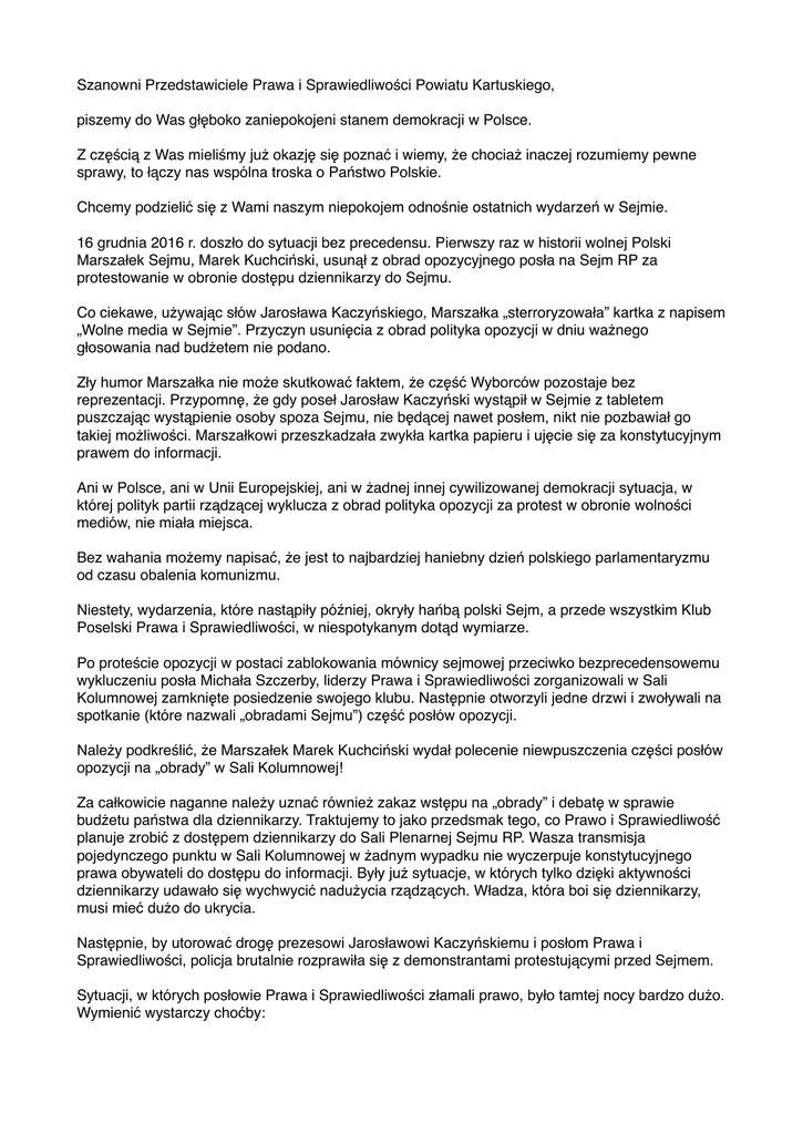 Szanowni Przedstawiciele Prawa i Sprawiedliwości Powiatu Kartuskiego, piszemy do Was głęboko zaniepokojeni stanem demokracji w Polsce. Z częścią z Was mieliśmy już okazję się poznać i wiemy, że chociaż inaczej rozumiemy pewne sprawy, to łączy nas wspólna troska o Państwo Polskie. Chcemy podzielić się z Wami naszym niepokojem odnośnie ostatnich wydarzeń w Sejmie. 16 grudnia 2016 r. doszło do sytuacji bez precedensu. Pierwszy raz w historii wolnej Polski Marszałek Sejmu, Marek Kuchciński, usunął z obrad opozycyjnego posła na Sejm RP za protestowanie w obronie dostępu dziennikarzy do Sejmu. Co ciekawe, używając słów Jarosława Kaczyńskiego, Marszałka „sterroryzowała” kartka z napisem „Wolne media w Sejmie”. Przyczyn usunięcia z obrad polityka opozycji w dniu ważnego głosowania nad budżetem nie podano. Zły humor Marszałka nie może skutkować faktem, że część Wyborców pozostaje bez reprezentacji. Przypomnę, że gdy poseł Jarosław Kaczyński wystąpił w Sejmie z tabletem puszczając wystąpienie osoby spoza Sejmu, nie będącej nawet posłem, nikt nie pozbawiał go takiej możliwości. Marszałkowi przeszkadzała zwykła kartka papieru i ujęcie się za konstytucyjnym prawem do informacji. Ani w Polsce, ani w Unii Europejskiej, ani w żadnej innej cywilizowanej demokracji sytuacja, w której polityk partii rządzącej wyklucza z obrad polityka opozycji za protest w obronie wolności mediów, nie miała miejsca. Bez wahania możemy napisać, że jest to najbardziej haniebny dzień polskiego parlamentaryzmu od czasu obalenia komunizmu. Niestety, wydarzenia, które nastąpiły później, okryły hańbą polski Sejm, a przede wszystkim Klub Poselski Prawa i Sprawiedliwości, w niespotykanym dotąd wymiarze. Po proteście opozycji w postaci zablokowania mównicy sejmowej przeciwko bezprecedensowemu wykluczeniu posła Michała Szczerby, liderzy Prawa i Sprawiedliwości zorganizowali w Sali Kolumnowej zamknięte posiedzenie swojego klubu. Następnie otworzyli jedne drzwi i zwoływali na spotkanie (które nazwali „obradami Sejmu”) część posłów opozycji. Należy podkreślić, że Marszałek Marek Kuchciński wydał polecenie niewpuszczenia części posłów opozycji na „obrady” w Sali Kolumnowej! Za całkowicie naganne należy uznać również zakaz wstępu na „obrady” i debatę w sprawie budżetu państwa dla dziennikarzy. Traktujemy to jako przedsmak tego, co Prawo i Sprawiedliwość planuje zrobić z dostępem dziennikarzy do Sali Plenarnej Sejmu RP. Wasza transmisja pojedynczego punktu w Sali Kolumnowej w żadnym wypadku nie wyczerpuje konstytucyjnego prawa obywateli do dostępu do informacji. Były już sytuacje, w których tylko dzięki aktywności dziennikarzy udawało się wychwycić nadużycia rządzących. Władza, która boi się dziennikarzy, musi mieć dużo do ukrycia. Następnie, by utorować drogę prezesowi Jarosławowi Kaczyńskiemu i posłom Prawa i Sprawiedliwości, policja brutalnie rozprawiła się z demonstrantami protestującymi przed Sejmem. Sytuacji, w których posłowie Prawa i Sprawiedliwości złamali prawo, było tamtej nocy bardzo dużo. Wymienić wystarczy choćby: - moment, w którym Zbigniew Ziobro fałszuje dokumenty podpisując obecność podczas głosowania już po zamknięciu sesji Sejmu (znany konstytucjonalista, prof. Chmaj uznał, że za takie zachowanie Zbigniew Ziobro powinien „natychmiast stanąć przed Trybunałem Stanu”), - moment, w którym Jarosław Kaczyński atakuje posłankę Pomaskę, zabiera jej telefon komórkowy po czym rzuca nim o ziemię! - głosowanie blokowe poprawek do budżetu - uniemożliwiło ono dyskusję nad poprawkami, było więc całkowicie bezprawne, a co więcej - pozbawiło mieszkańców Kaszub i Pomorza wiedzy o ewentualnych poprawkach ważnych z punktu widzenia naszego regionu, - obecność na Sali Kolumnowej osób nie będących posłami - jest bardzo prawdopodobne, że w „głosowaniu” nad ustawą budżetową brały udział osoby nie mające mandatu posła! - pobicie przez Straż Marszałkowską w obecności posła Jarosława Kaczyńskiego posłanek opozycji: Joanny Muchy oraz Doroty Niedzieli. Uchybień było znacznie więcej. Nie znajdujemy słów, by oddać, w jak dramatycznej sytuacji znajduje się dzisiaj polska demokracja. Uznajemy, że winę za zaistniałą sytuację w sposób jednoznaczny i nie pozostawiający wątpliwości ponoszą Jarosław Kaczyński, Marek Kuchciński oraz posłowie i posłanki Prawa i Sprawiedliwości. Wzywamy kartuskich przedstawicieli do natychmiastowego: - potępienia bezprawnych działań Marszałka Kuchcińskiego oraz posłów i posłanek Prawa i Sprawiedliwości, - jasnej deklaracji przywiązania do wartości demokratycznych, wolności mediów, wolności zgromadzeń, nietykalności fizycznej parlamentarzystów podczas sprawowania mandatu posła i senatora, szczególnie na terenie Sejmu, - wezwania posłów Prawa i Sprawiedliwości mających biura poselskie na terenie naszego powiatu do respektowania polskiego prawa. Jeśli kartuskie struktury Prawa i Sprawiedliwości stoją jednak na stanowisku, że wyżej opisane działania parlamentarzystów Waszej partii są uzasadnione i nie widzą w nich nic złego, to wzywamy Przewodniczącego Kartuskiego Koła Prawa i Sprawiedliwości do debaty o stanie polskiej demokracji w jak najszybszym terminie. Temat jest tak ważny, że jesteśmy winni kartuskiej społeczności pełną informację o zaistniałej sytuacji. W imieniu Koła Kartuzy Nowoczesnej Ryszarda Petru, Jan Burdyński Mariusz Klimczak Ewa Marcińska Adrian Pawłowski Krzysztof Rek Amanda Sowińska Andrzej Sowiński Alicja Szymichowska-Steinka Tytus Ułanowski