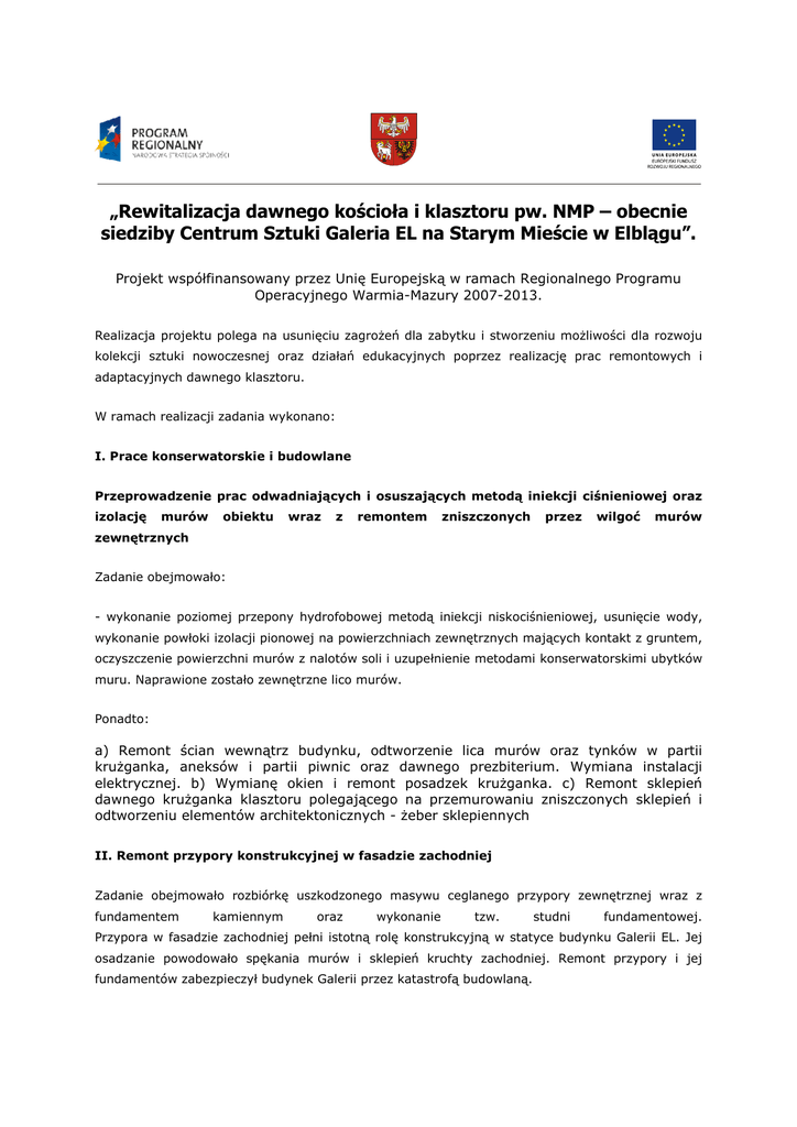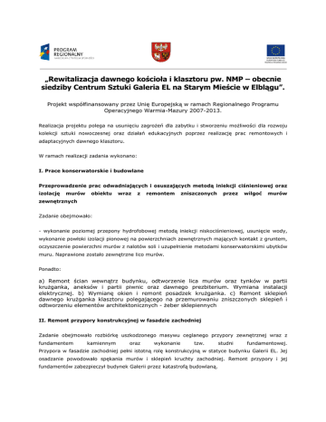 „Rewitalizacja dawnego kościoła i klasztoru pw. NMP – obecnie siedziby Centrum Sztuki Galeria EL na Starym Mieście w Elblągu”. Projekt współfinansowany przez Unię Europejską w ramach Regionalnego Programu Operacyjnego Warmia-Mazury 2007-2013. Realizacja projektu polega na usunięciu zagroŜeń dla zabytku i stworzeniu moŜliwości dla rozwoju kolekcji sztuki nowoczesnej oraz działań edukacyjnych poprzez realizację prac remontowych i adaptacyjnych dawnego klasztoru. W ramach realizacji zadania wykonano: I. Prace konserwatorskie i budowlane Przeprowadzenie prac odwadniających i osuszających metodą iniekcji ciśnieniowej oraz izolację murów obiektu wraz z remontem zniszczonych przez wilgoć murów zewnętrznych Zadanie obejmowało: - wykonanie poziomej przepony hydrofobowej metodą iniekcji niskociśnieniowej, usunięcie wody, wykonanie powłoki izolacji pionowej na powierzchniach zewnętrznych mających kontakt z gruntem, oczyszczenie powierzchni murów z nalotów soli i uzupełnienie metodami konserwatorskimi ubytków muru. Naprawione zostało zewnętrzne lico murów. Ponadto: a) Remont ścian wewnątrz budynku, odtworzenie lica murów oraz tynków w partii kruŜganka, aneksów i partii piwnic oraz dawnego prezbiterium. Wymiana instalacji elektrycznej. b) Wymianę okien i remont posadzek kruŜganka. c) Remont sklepień dawnego kruŜganka klasztoru polegającego na przemurowaniu zniszczonych sklepień i odtworzeniu elementów architektonicznych - Ŝeber sklepiennych II. Remont przypory konstrukcyjnej w fasadzie zachodniej Zadanie obejmowało rozbiórkę uszkodzonego masywu ceglanego przypory zewnętrznej wraz z fundamentem kamiennym oraz wykonanie tzw. studni fundamentowej. Przypora w fasadzie zachodniej pełni istotną rolę konstrukcyjną w statyce budynku Galerii EL. Jej osadzanie powodowało spękania murów i sklepień kruchty zachodniej. Remont przypory i jej fundamentów zabezpieczył budynek Galerii przez katastrofą budowlaną. III. Odbudowę istniejącej przed II Wojną Światową jednokondygnacjowej empory w nawie bocznej dawnego kościoła w formie dwukondygnacjowej konstrukcji ze szkła i stali połączonej windą. W nawie bocznej dawnej świątyni istniała do 1945 roku empora o konstrukcji drewnianej. Projektowana empora posłuŜy jako dodatkowa powierzchnia wystawowa. Jej formę przewidziano jako dwukondygnacjową galerię, wykonaną ze szkła i stali. Komunikacja między parterem i piętrami odbywa się windą elektryczną oraz stalowymi schodami. Dane po odbudowie: powierzchnia uŜytkowa: I piętro - 179m2 , II piętro - 170m2 Funkcja: Empora jest miejscem eksponowania zbiorów sztuki nowoczesnej, które Galerii EL przekazane zostały przez jej załoŜyciela - Gerarda Kwiatkowskiego, obecnie prowadzącego Muzeum Sztuki Nowoczesnej w niemieckim Hünfeld. Instytucja zyskała tym samym ponad 200 prac autorstwa uznanych artystów międzynarodowych. IV. Adaptacja pomieszczeń dawnego klasztoru na działalność kulturalną. Ta część obiektu została zamknięta w 1999 roku ze względu na zły stan techniczny. W ramach zadnia „Rewitalizacja dawnego kościoła i klasztoru pw. NMP - obecnie siedziby Centrum Sztuki Galeria EL na Starym Mieście w Elblągu" wyremontowane zostały 3 pomieszczenia i zaadoptowane do nowych funkcji: 1) pracownia plastyczna - wielofunkcyjna sala wykładowa z moŜliwością adaptacji jej do celów warsztatowych i ekspozycyjnych, 2) pomieszczenie magazynowe słuŜące przechowywaniu wystaw czasowych oraz 3) kruŜganek - wielofunkcyjna sala konferencyjna z moŜliwością adaptacji jej do celów kulturalnych - organizacji koncertów, spotkań dyskusyjnych. Stworzone zostały tym samym warunki dla zwiększenia dostępności do dóbr kultury - w kruŜganku dawnego klasztoru znajduje się zespół kilkunastu najwyŜszej klasy epitafiów patrycjatu elbląskiego z 17 i 18 wieku. Całkowity koszt realizacji: 4 984 476,49 zł Ze środków EFRR 3 488 994,95 zł Wkład własny Galerii EL w formie dotacji Gminy Miasta Elbląg 1 495 481,54 zł Czas trwania realizacji zadania: czerwiec 2010 – kwiecień 2011