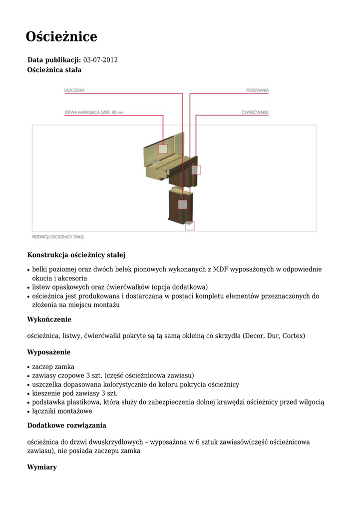 Ościeżnice Data publikacji: 03-07-2012 Ościeżnica stała Konstrukcja ościeżnicy stałej ● ● ● belki poziomej oraz dwóch belek pionowych wykonanych z MDF wyposażonych w odpowiednie okucia i akcesoria listew opaskowych oraz ćwierćwałków (opcja dodatkowa) ościeżnica jest produkowana i dostarczana w postaci kompletu elementów przeznaczonych do złożenia na miejscu montażu Wykończenie ościeżnica, listwy, ćwierćwałki pokryte są tą samą okleiną co skrzydła (Decor, Dur, Cortex) Wyposażenie ● ● ● ● ● ● zaczep zamka zawiasy czopowe 3 szt. (część ościeżnicowa zawiasu) uszczelka dopasowana kolorystycznie do koloru pokrycia ościeżnicy kieszenie pod zawiasy 3 szt. podstawka plastikowa, która służy do zabezpieczenia dolnej krawędzi ościeżnicy przed wilgocią łączniki montażowe Dodatkowe rozwiązania ościeżnica do drzwi dwuskrzydłowych – wyposażona w 6 sztuk zawiasów(część ościeżnicowa zawiasu), nie posiada zaczepu zamka Wymiary ● ● ● jednoskrzydłowe: „60”, „70”, „80”, „90”, „100” dwuskrzydłowe: dowolna kombinacja powyższych wymiarów przygotowana do osadzenia na mur o grubości min. 100 mm Ćwierćwałki ● wymiar:12x22 mm, długość: 2150 mm Listwy opaskowe ● ● ● ● ● szerokość listew – 80 mm krawędzie ostre przycinane pod kątem 900 wymiary: „90”, „100”, „100+100”, „110+110” dostępne opcje: komplet na jedną stronę lub pojedyncze listwy pionowe Montaż ● ● Aprobata Techniczna AT-15-5664/2007, ITB Warszawa montaż ościeżnicy należy wykonać w pomieszczeniach z kompletnie wykończonymi ścianami (tapety, malowanie, kafelkowanie itp.) oraz wykończonymi podłogami (np. parkiet) Ościeżnica regulowana Konstrukcja ościeżnicy regulowanej ● ● ● belki poziomej oraz dwóch belek pionowych wykonanych z płyty wiórowej wyposażonych w odpowiednie okucia i akcesoria kompletu opasek kątowych o szerokości 80 mm przycinanych pod kątem45° ościeżnica jest produkowana i dostarczana w postaci kompletu elementów przeznaczonych do złożenia na miejscu montażu Wykończenie ościeżnica, opaski kątowe pokryte są tą samą okleiną co skrzydła(Decor, Dur, Cortex) Wyposażenie ● ● ● ● ● zaczep zamka zawiasy czopowe 3 szt. (część ościeżnicowa zawiasu) uszczelka dopasowana kolorystycznie do koloru pokrycia ościeżnicy kieszenie pod zawiasy 3 szt. łączniki montażowe Dodatkowe rozwiązania ● ● ● ● ościeżnica w wersji tunel – do zastosowania jako osłona muru w miejscu gdzie nie przewidziano skrzydła lub jako element systemu przesuwnego; nie posiada uszczelki, zaczepu zamka, zawiasów ościeżnica łączona – przeznaczona na duże zakresy muru (max. 588 mm); składa się ze standardowej ościeżnicy oraz dodatkowej belki poszerzającej z łącznikiem panel regulacyjny – rozwiązanie umożliwiające poszerzenie standardowej ościeżnicy (max. 460 mm) za pomocą dodatkowego panelu wykonanego z MDF; panele regulacyjne występują w szerokości 80 i 160 mm ościeżnica do drzwi dwuskrzydłowych – wyposażona w 6 sztuk zawiasów(część ościeżnicowa zawiasu), nie posiada zaczepu zamka Wymiary ● ● ● jednoskrzydłowe: „60”, „70”, „80”, „90”, „100” dwuskrzydłowe: dowolna kombinacja powyższych wymiarów zakresy muru: A 75 ÷ 95 mm B 95 ÷ 115 mm C 120 ÷ 140 mm D 140 ÷ 160 mm E 160 ÷ 180 mm F 180 ÷ 200 mm G 200 ÷ 220 mm H 220 ÷ 240 mm I 240 ÷ 260 mm J 260 ÷ 280 mm K 280 ÷ 300 mm Uwagi ● ● Aprobata Techniczna AT-15-3691/2007, ITB Warszawa montaż ościeżnicy należy wykonać w pomieszczeniach z kompletnie wykończonymi ścianami (tapety, malowanie, kafelkowanie itp.) oraz wykończonymi podłogami (np. parkiet)