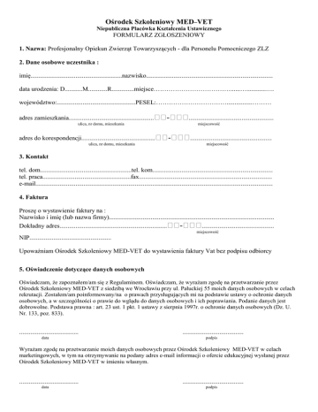 Ośrodek Szkoleniowy MED–VET Niepubliczna Placówka Kształcenia Ustawicznego FORMULARZ ZGŁOSZENIOWY 1. Nazwa: Profesjonalny Opiekun Zwierząt Towarzyszących - dla Personelu Pomocniczego ZLZ 2. Dane osobowe uczestnika : imię.........................................................nazwisko............................................................................... data urodzenia: D...........M............R..............miejsce………………………………......…............…. województwo:.................................................PESEL:……………………………................……… adres zamieszkania..................................................... - ulica, nr domu, mieszkania adres do korespondencji.............................................. ulica, nr domu, mieszkania ..................................................... miejscowość - ................................................... miejscowość 3. Kontakt tel. dom.........................................................tel. kom........................................................................... tel. praca.......................................................fax................................................................................... e-mail.................................................................................................................................................... 4. Faktura Proszę o wystawienie faktury na : Nazwisko i imię (lub nazwa firmy)....................................................................................................... Dokładny adres................................................................... ............................................. miejscowość NIP................................................... Upoważniam Ośrodek Szkoleniowy MED-VET do wystawienia faktury Vat bez podpisu odbiorcy 5. Oświadczenie dotyczące danych osobowych Oświadczam, że zapoznałem/am się z Regulaminem. Oświadczam, że wyrażam zgodę na przetwarzanie przez Ośrodek Szkoleniowy MED-VET z siedzibą we Wrocławiu przy ul. Pałuckiej 55 moich danych osobowych w celach rekrutacji. Zostałem/am poinformowany/na o prawach przysługujących mi na podstawie ustawy o ochronie danych osobowych, a w szczególności o prawie do wglądu do danych osobowych i ich poprawiania. Podanie danych jest dobrowolne. Podstawa prawna : art. 23 ust. 1 pkt. 1 ustawy z sierpnia 1997r. o ochronie danych osobowych (Dz. U. Nr. 133, poz. 833). ..................................... data ...................................... podpis Wyrażam zgodę na przetwarzanie moich danych osobowych przez Ośrodek Szkoleniowy MED-VET w celach marketingowych, w tym na otrzymywanie na podany adres e-mail informacji o ofercie edukacyjnej wysłanej przez Ośrodek Szkoleniowy MED-VET w imieniu własnym. ..................................... data ...................................... podpis