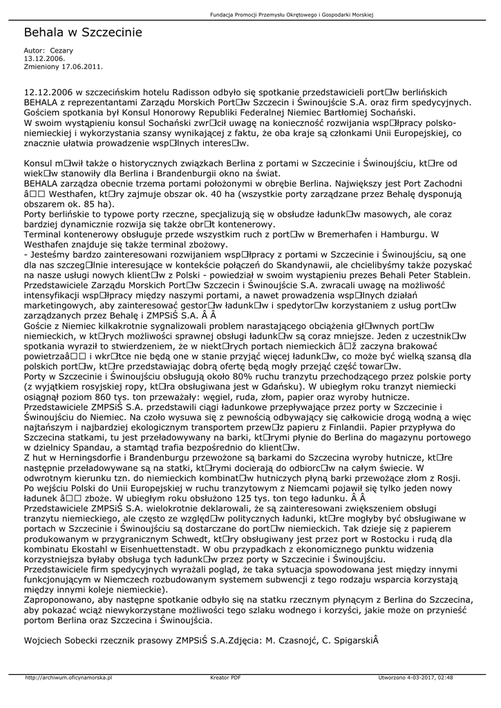 Fundacja Promocji Przemysłu Okrętowego i Gospodarki Morskiej Behala w Szczecinie Autor: Cezary 13.12.2006. Zmieniony 17.06.2011. 12.12.2006 w szczecińskim hotelu Radisson odbyło się spotkanie przedstawicieli portÃłw berlińskich BEHALA z reprezentantami Zarządu Morskich PortÃłw Szczecin i Świnoujście S.A. oraz firm spedycyjnych. Gościem spotkania był Konsul Honorowy Republiki Federalnej Niemiec Bartłomiej Sochański. W swoim wystąpieniu konsul Sochański zwrÃłcił uwagę na konieczność rozwijania wspÃłłpracy polskoniemieckiej i wykorzystania szansy wynikającej z faktu, że oba kraje są członkami Unii Europejskiej, co znacznie ułatwia prowadzenie wspÃłlnych interesÃłw. Konsul mÃłwił także o historycznych związkach Berlina z portami w Szczecinie i Świnoujściu, ktÃłre od wiekÃłw stanowiły dla Berlina i Brandenburgii okno na świat. BEHALA zarządza obecnie trzema portami położonymi w obrębie Berlina. Największy jest Port Zachodni – Westhafen, ktÃłry zajmuje obszar ok. 40 ha (wszystkie porty zarządzane przez Behalę dysponują obszarem ok. 85 ha). Porty berlińskie to typowe porty rzeczne, specjalizują się w obsłudze ładunkÃłw masowych, ale coraz bardziej dynamicznie rozwija się także obrÃłt kontenerowy. Terminal kontenerowy obsługuje przede wszystkim ruch z portÃłw w Bremerhafen i Hamburgu. W Westhafen znajduje się także terminal zbożowy. - Jesteśmy bardzo zainteresowani rozwijaniem wspÃłłpracy z portami w Szczecinie i Świnoujściu, są one dla nas szczegÃłlnie interesujące w kontekście połączeń do Skandynawii, ale chcielibyśmy także pozyskać na nasze usługi nowych klientÃłw z Polski - powiedział w swoim wystąpieniu prezes Behali Peter Stablein. Przedstawiciele Zarządu Morskich PortÃłw Szczecin i Świnoujście S.A. zwracali uwagę na możliwość intensyfikacji wspÃłłpracy między naszymi portami, a nawet prowadzenia wspÃłlnych działań marketingowych, aby zainteresować gestorÃłw ładunkÃłw i spedytorÃłw korzystaniem z usług portÃłw zarządzanych przez Behalę i ZMPSiŚ S.A.   Goście z Niemiec kilkakrotnie sygnalizowali problem narastającego obciążenia głÃłwnych portÃłw niemieckich, w ktÃłrych możliwości sprawnej obsługi ładunkÃłw są coraz mniejsze. Jeden z uczestnikÃłw spotkania wyraził to stwierdzeniem, że w niektÃłrych portach niemieckich „zaczyna brakować powietrza― i wkrÃłtce nie będą one w stanie przyjąć więcej ładunkÃłw, co może być wielką szansą dla polskich portÃłw, ktÃłre przedstawiając dobrą ofertę będą mogły przejąć część towarÃłw. Porty w Szczecinie i Świnoujściu obsługują około 80% ruchu tranzytu przechodzącego przez polskie porty (z wyjątkiem rosyjskiej ropy, ktÃłra obsługiwana jest w Gdańsku). W ubiegłym roku tranzyt niemiecki osiągnął poziom 860 tys. ton przeważały: węgiel, ruda, złom, papier oraz wyroby hutnicze. Przedstawiciele ZMPSiŚ S.A. przedstawili ciągi ładunkowe przepływające przez porty w Szczecinie i Świnoujściu do Niemiec. Na czoło wysuwa się z pewnością odbywający się całkowicie drogą wodną a więc najtańszym i najbardziej ekologicznym transportem przewÃłz papieru z Finlandii. Papier przypływa do Szczecina statkami, tu jest przeładowywany na barki, ktÃłrymi płynie do Berlina do magazynu portowego w dzielnicy Spandau, a stamtąd trafia bezpośrednio do klientÃłw. Z hut w Herningsdorfie i Brandenburgu przewożone są barkami do Szczecina wyroby hutnicze, ktÃłre następnie przeładowywane są na statki, ktÃłrymi docierają do odbiorcÃłw na całym świecie. W odwrotnym kierunku tzn. do niemieckich kombinatÃłw hutniczych płyną barki przewożące złom z Rosji. Po wejściu Polski do Unii Europejskiej w ruchu tranzytowym z Niemcami pojawił się tylko jeden nowy ładunek – zboże. W ubiegłym roku obsłużono 125 tys. ton tego ładunku.   Przedstawiciele ZMPSiŚ S.A. wielokrotnie deklarowali, że są zainteresowani zwiększeniem obsługi tranzytu niemieckiego, ale często ze względÃłw politycznych ładunki, ktÃłre mogłyby być obsługiwane w portach w Szczecinie i Świnoujściu są dostarczane do portÃłw niemieckich. Tak dzieje się z papierem produkowanym w przygranicznym Schwedt, ktÃłry obsługiwany jest przez port w Rostocku i rudą dla kombinatu Ekostahl w Eisenhuettenstadt. W obu przypadkach z ekonomicznego punktu widzenia korzystniejsza byłaby obsługa tych ładunkÃłw przez porty w Szczecinie i Świnoujściu. Przedstawiciele firm spedycyjnych wyrażali pogląd, że taka sytuacja spowodowana jest między innymi funkcjonującym w Niemczech rozbudowanym systemem subwencji z tego rodzaju wsparcia korzystają między innymi koleje niemieckie). Zaproponowano, aby następne spotkanie odbyło się na statku rzecznym płynącym z Berlina do Szczecina, aby pokazać wciąż niewykorzystane możliwości tego szlaku wodnego i korzyści, jakie może on przynieść portom Berlina oraz Szczecina i Świnoujścia. Wojciech Sobecki rzecznik prasowy ZMPSiŚ S.A.Zdjęcia: M. Czasnojć, C. Spigarski http://archiwum.oficynamorska.pl Kreator PDF Utworzono 4-03-2017, 02:48