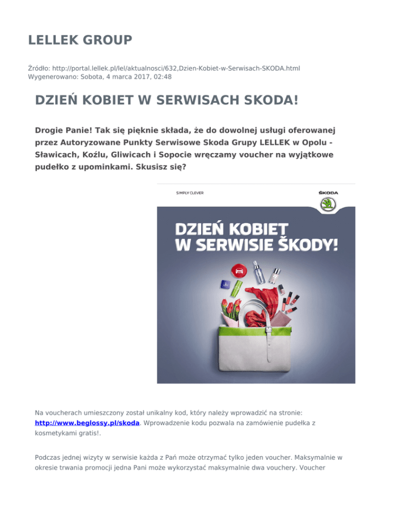 LELLEK GROUP Źródło: http://portal.lellek.pl/lel/aktualnosci/632,Dzien-Kobiet-w-Serwisach-SKODA.html Wygenerowano: Sobota, 4 marca 2017, 02:48 DZIEŃ KOBIET W SERWISACH SKODA! Drogie Panie! Tak się pięknie składa, że do dowolnej usługi oferowanej przez Autoryzowane Punkty Serwisowe Skoda Grupy LELLEK w Opolu Sławicach, Koźlu, Gliwicach i Sopocie wręczamy voucher na wyjątkowe pudełko z upominkami. Skusisz się? Na voucherach umieszczony został unikalny kod, który należy wprowadzić na stronie: http://www.beglossy.pl/skoda. Wprowadzenie kodu pozwala na zamówienie pudełka z kosmetykami gratis!. Podczas jednej wizyty w serwisie każda z Pań może otrzymać tylko jeden voucher. Maksymalnie w okresie trwania promocji jedna Pani może wykorzystać maksymalnie dwa vouchery. Voucher dedykowany jest wyłącznie właścicielkom samochodu, w którym wykonana została dowolna usługa serwisowa. Zachęcamy do skorzystania z oferty! Tweetnij