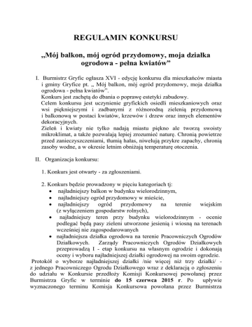 REGULAMIN KONKURSU ,,Mój balkon, mój ogród przydomowy, moja działka ogrodowa - pełna kwiatów” I. Burmistrz Gryfic ogłasza XVI - edycję konkursu dla mieszkańców miasta i gminy Gryfice pt. ,, Mój balkon, mój ogród przydomowy, moja działka ogrodowa - pełna kwiatów”. Konkurs jest zachętą do dbania o poprawę estetyki zabudowy. Celem konkursu jest uczynienie gryfickich osiedli mieszkaniowych oraz wsi piękniejszymi i zadbanymi z różnorodną zielenią przydomową i balkonową w postaci kwiatów, krzewów i drzew oraz innych elementów dekoracyjnych. Zieleń i kwiaty nie tylko nadają miastu piękno ale tworzą swoisty mikroklimat, a także pozwalają lepiej zrozumieć naturę. Chronią powietrze przed zanieczyszczeniami, tłumią hałas, niwelują przykre zapachy, chronią zasoby wodne, a w okresie letnim obniżają temperaturę otoczenia. II. Organizacja konkursu: 1. Konkurs jest otwarty - za zgłoszeniami. 2. Konkurs będzie prowadzony w pięciu kategoriach tj: najładniejszy balkon w budynku wielorodzinnym, najładniejszy ogród przydomowy w mieście, najładniejszy ogród przydomowy na terenie wiejskim (z wyłączeniem gospodarstw rolnych), najładniejszy teren przy budynku wielorodzinnym - ocenie podlegać będą pasy zieleni utworzone jesienią i wiosną na terenach wcześniej nie zagospodarowanych najładniejsza działka ogrodowa na terenie Pracowniczych Ogrodów Działkowych. Zarządy Pracowniczych Ogrodów Działkowych przeprowadzą I - etap konkursu na własnym ogrodzie i dokonają oceny i wyboru najładniejszej działki ogrodowej na swoim ogrodzie. Protokół o wyborze najładniejszej działki /nie więcej niż trzy działki/ z jednego Pracowniczego Ogrodu Działkowego wraz z deklaracją o zgłoszeniu do udziału w Konkursie przedłoży Komisji Konkursowej powołanej przez Burmistrza Gryfic w terminie do 15 czerwca 2015 r. Po upływie wyznaczonego terminu Komisja Konkursowa powołana przez Burmistrza Gryfic przy udziale przedstawicieli z Pracowniczych Ogrodów Działkowych dokona oceny i wyboru najładniejszego ogrodu. 3. Przedmiotem oceny w kategorii: najładniejszy balkon będzie: różnorodność gatunków roślinności, inne elementy dekoracyjne, pomysłowość i oryginalność rozwiązań, stan techniczny i estetyczny otoczenia (stan techniczny ścian balkonów, balustrad oraz skrzynek balkonowych i donic). 4. Przedmiotem oceny w kategorii: najładniejszy ogród przydomowy, ogród działkowy i pas zieleni będzie: różnorodność gatunków roślinności, inne elementy dekoracyjne, pomysłowość i oryginalność rozwiązań, stan techniczny i estetyczny otoczenia (stan techniczny ścian budynków, ogrodzenia oraz innych elementów dekoracyjnych), wyposażenia działki w kompostownik, zawarta umowa na wywóz nieczystości stałych, zawarta umowa na wywóz nieczystości płynnych. 5. Zgłoszenia będą przyjmowane w Urzędzie Miejskim przy Pl. Zwycięstwa 37 w pok. 202, II piętro. Zgłoszenie powinno zawierać: adres ogrodu, adres do korespondencji i telefon kontaktowy, deklarację do której kategorii konkursu ma być zakwalifikowane zgłoszenie, zgodę właściciela ogrodów lub balkonu na udostępnienie go komisji konkursowej do oceny oraz zgodę na publikację materiałów /zdjęć/ wraz z danymi osobowymi właściciela. 6. Oceny i wyboru balkonów oraz ogrodów dokona Komisja konkursowa w składzie: przedstawiciele Rad Osiedli Samorządu Mieszkańców, przedstawiciele Rad Sołeckich, przedstawiciele Urzędu Miejskiego. Przedstawiciele po jednej osobie z Pracowniczych Ogrodów Działkowych. 7. Laureaci konkursu otrzymają nagrody w postaci nagród rzeczowych lub bonów towarowych. Wszyscy uczestnicy konkursu otrzymają dyplomy pamiątkowe. 8. Terminarz konkursu: termin przyjmowania zgłoszeń dot. balkonów, ogrodów przydomowych i terenów przy budynkach wielorodzinnych - do 15 czerwca 2015 roku termin rozstrzygnięcia konkursu – do 20 lipca 2015 roku 9. Ogłoszenie wyników i wręczenie nagród nastąpi w czasie uroczystości dożynkowych. 10. Z udziału w konkursie wyłączeni są: pracownicy Urzędu Miejskiego w Gryficach, członkowie Komisji Konkursowej i ich rodziny oraz osoby, które były nagradzane w konkursie w ostatnich 3 latach. Zatwierdzam Burmistrz Gryfic - Andrzej Szczygieł Gryfice, 28.04.2015 r.