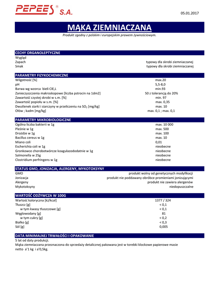 05.01.2017 MĄKA ZIEMNIACZANA Produkt zgodny z polskim i europejskim prawem żywnościowym. CECHY ORGANOLEPTYCZNE Wygląd Zapach Smak typowy dla skrobi ziemniaczanej typowy dla skrobi ziemniaczanej PARAMETRY FIZYKOCHEMICZNE Wilgotność [%] pH Barwa wg wzorca bieli CIE,L Zanieczyszczenia makroskopowe [liczba pstrocin na 1dm2] Zawartość czystej skrobi w s.m. [%] Zawartość popiołu w s.m. [%] Dwutlenek siarki i siarczyny w przeliczeniu na SO2 [mg/kg] Ołów ; kadm [mg/kg] max.20 5,5-8,0 min.93 50 z tolerancją do 20% min. 97 max. 0,35 max. 10 max. 0,1 ; max. 0,1 PARAMETRY MIKROBIOLOGICZNE Ogólna liczba bakterii w 1g Pleśnie w 1g Drożdże w 1g Bacillus cereus w 1g Miano coli Escherichia coli w 1g Gronkowce chorobotwórcze koagulazododatnie w 1g Salmonella w 25g Clostridium perfringens w 1g max. 10 000 max. 500 max. 100 max. 10 0,01 nieobecne nieobecne nieobecne nieobecne STATUS GMO, JONIZACJA, ALERGENY, MYKOTOKSYNY GMO Jonizacja Alergeny Mykotoksyny produkt wolny od genetycznych modyfikacji produkt nie poddawany obróbce promieniami jonizującymi produkt nie zawiera alergenów niedopuszczalne WARTOŚĆ ODŻYWCZA W 100G Wartość kaloryczna [kJ/kcal] Tłuszcz [g] w tym kwasy tłuszczowe [g] Węglowodany [g] w tym cukry [g] Białko [g] Sól [g] 1377 / 324 < 0,1 < 0,1 81 < 0,2 < 0,3 0,005 DATA MINIMALNEJ TRWAŁOŚCI I OPAKOWANIE 5 lat od daty produkcji. Mąka ziemniaczana przeznaczona do sprzedaży detalicznej pakowana jest w torebki klockowe papierowe masie netto a’1 kg i a’0,5kg. 05.01.2017 SKŁAD I POCHODZENIE SUROWCA Skrobia ziemniaczana 100% Mąka ziemniaczana wyprodukowana w PEPEES S.A. z ziemniaków pochodzenia polskiego. DOCELOWA GRUPA KONSUMENTÓW Produkt nadaje się do spożycia dla wszystkich grup konsumentów. PRZEZNACZENIE Do zagęszczania zup, sosów. Dodatek przy wyrobie pyz i klusek śląskich. Do krochmalenia tkanin. WARUNKI PRZECHOWYWANIA Przechowywać w suchych, chłodnych i czystych miejscach, wolnych od obcych zapachów.