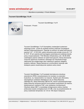 www.wirelesslan.pl 04-03-2017 Wycofane ze sprzedazy > Proxim Wireless Tsunami QuickBridge.11a R Tsunami QuickBridge.11a R Producent : Proxim Tsunami QuickBridge.11a R (kompletny zestaw)jest systemem otopologii punkt - punkt do szybkiej budowy polaczen wrozleglych sieciach bezprzewodowych. Operuje na wolnym od oplat licencyjnych pasmie 5.47 - 5.725 GHz, gdzie dozwolona jest emisja zmoca do 1 W E.I.R.P. W tym pasmie jest wymagana automatyczna selekcja kanalu pracy (rozporzadzenie 1162 Ministra Infrastruktury zdn. 06.08.2002 uwalniajace pasma radiowe od oplat licencyjnych), ktorej stosowanie znacznie ogranicza mozliwosc celowego lub niezamierzonego zaklocania sie wzajemnego sieci radiowych opartych olegalne systemy radiowe. Stacja bazowa po uruchomieniu skanuje cale dostepne pasmo iautomatycznie wybiera wolny kanal. Tsunami QuickBridge.11a R posiada hermetyczne obudowy zewnetrzne (IP65), przystosowane do montazu na zewnatrz budynkow, np. bezposrednio na maszcie. System jest oferowany wkompletnym zestawie skladajacym sie ze Stacji Bazowej (QB-BSU-R), Stacji Klienckiej (QB-SU-R), dwoch sztukzewnetrznego kabla Ethernet zwodoszczelnymi koncowkami wodcinkach 50 metrow, dedykowanych zasilaczy PoE, oraz zestawow montazowych. Obydwie stacje QB11.a posiadaja zintegrowane anteny dualnej polaryzacji ozysku energetycznym 23 dBi, oraz sa przystosowane do pracy wzakresie temperatur od -33 do +60 stopni Celsjusza. www.wirelesslan.pl - [email protected] - Konsorcjum ATS, 26-600 Radom, ul. Zeromskiego 75, tel. (048) 383 00 30 Strona 1/6 www.wirelesslan.pl 04-03-2017 Sredni termin realizacji: 35 dni Charakterystyka systemu Tsunami QuickBridge.11a R: czestotliwosc pracy: 5.47-5.725 GHz www.wirelesslan.pl - [email protected] - Konsorcjum ATS, 26-600 Radom, ul. Zeromskiego 75, tel. (048) 383 00 30 Strona 2/6 www.wirelesslan.pl 04-03-2017 moc E.I.R.P.: 1 W modulacja: OFDM wyzsze radiowe predkosci pracy: 54 oraz 48 Mbps efektywny transfer: ok. 36 Mbps (TDM)/kanal; maksymalna predkosc pracy na dluzszych odcinkach dzieki wyzszej radiowej predkosci pracy oraz eliminacji kabli niskostratnych www.wirelesslan.pl - [email protected] - Konsorcjum ATS, 26-600 Radom, ul. Zeromskiego 75, tel. (048) 383 00 30 Strona 3/6 www.wirelesslan.pl 04-03-2017 ilosc kanalow: 11, kanaly niezaklocajace sie wzajemnie zasieg komorki: do ok. 14 km kontrola mocy emitowanej zkrokiem co 3 dB (TPC) dynamiczna selekcja kanalu pracy (DFS) dynamiczna selekcja predkosci pracy oparta na analizie jakosci sygnalu (DDRS) www.wirelesslan.pl - [email protected] - Konsorcjum ATS, 26-600 Radom, ul. Zeromskiego 75, tel. (048) 383 00 30 Strona 4/6 www.wirelesslan.pl 04-03-2017 system moze pracowac bez pelnej widocznosci optycznej (NLOS odbicia sygnalu) zarzadzanie pasmem: symetryczne iasymetryczne bezpieczenstwo: enkrypcja AES, wzajemna autoryzacja stacji odbiorczych wRADIUS, MD-5 CHAP, Access Control List protokol: WORP - Wireless Outdoor Router Protocol, wlasny protokol Proxim www.wirelesslan.pl - [email protected] - Konsorcjum ATS, 26-600 Radom, ul. Zeromskiego 75, tel. (048) 383 00 30 Strona 5/6 www.wirelesslan.pl 04-03-2017 zasilanie: zasilacz PoE wzestawie, wbudowany przelacznik do kasowania konfiguracji (software reload Gwarancja: 12 www.wirelesslan.pl - [email protected] - Konsorcjum ATS, 26-600 Radom, ul. Zeromskiego 75, tel. (048) 383 00 30 Strona 6/6