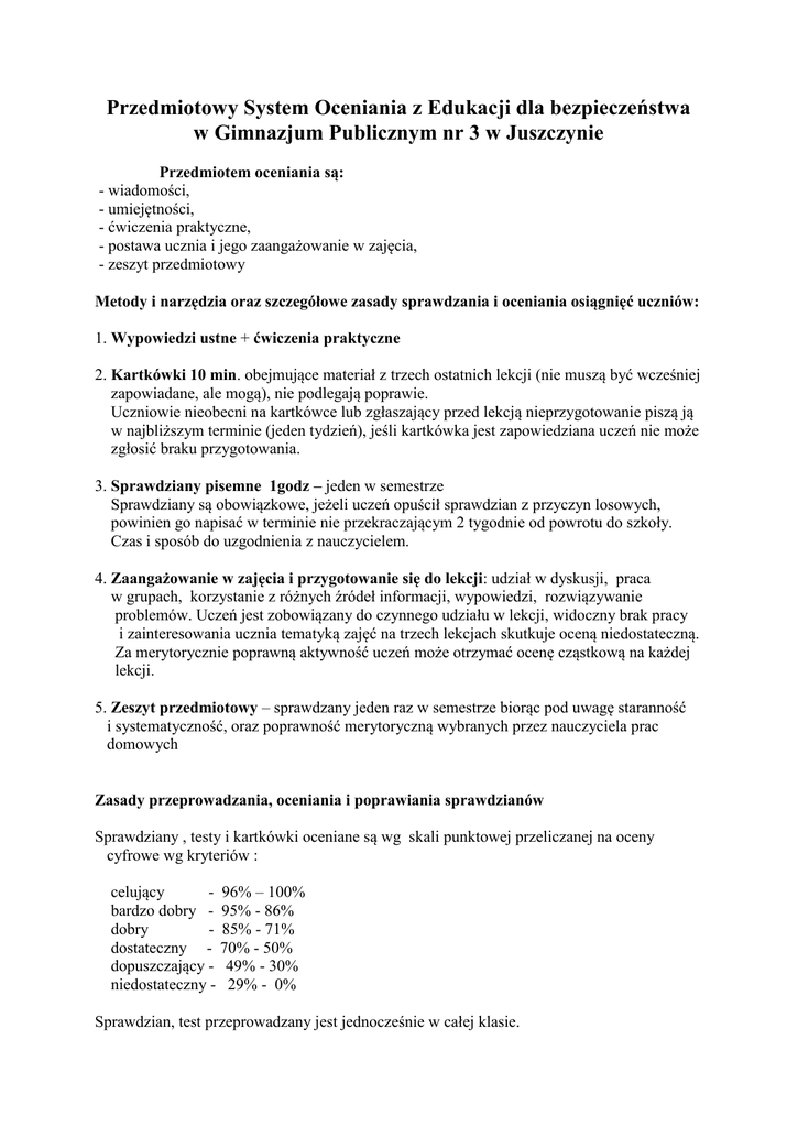 Przedmiotowy System Oceniania z Edukacji dla bezpieczeństwa w Gimnazjum Publicznym nr 3 w Juszczynie Przedmiotem oceniania są: - wiadomości, - umiejętności, - ćwiczenia praktyczne, - postawa ucznia i jego zaangażowanie w zajęcia, - zeszyt przedmiotowy Metody i narzędzia oraz szczegółowe zasady sprawdzania i oceniania osiągnięć uczniów: 1. Wypowiedzi ustne + ćwiczenia praktyczne 2. Kartkówki 10 min. obejmujące materiał z trzech ostatnich lekcji (nie muszą być wcześniej zapowiadane, ale mogą), nie podlegają poprawie. Uczniowie nieobecni na kartkówce lub zgłaszający przed lekcją nieprzygotowanie piszą ją w najbliższym terminie (jeden tydzień), jeśli kartkówka jest zapowiedziana uczeń nie może zgłosić braku przygotowania. 3. Sprawdziany pisemne 1godz – jeden w semestrze Sprawdziany są obowiązkowe, jeżeli uczeń opuścił sprawdzian z przyczyn losowych, powinien go napisać w terminie nie przekraczającym 2 tygodnie od powrotu do szkoły. Czas i sposób do uzgodnienia z nauczycielem. 4. Zaangażowanie w zajęcia i przygotowanie się do lekcji: udział w dyskusji, praca w grupach, korzystanie z różnych źródeł informacji, wypowiedzi, rozwiązywanie problemów. Uczeń jest zobowiązany do czynnego udziału w lekcji, widoczny brak pracy i zainteresowania ucznia tematyką zajęć na trzech lekcjach skutkuje oceną niedostateczną. Za merytorycznie poprawną aktywność uczeń może otrzymać ocenę cząstkową na każdej lekcji. 5. Zeszyt przedmiotowy – sprawdzany jeden raz w semestrze biorąc pod uwagę staranność i systematyczność, oraz poprawność merytoryczną wybranych przez nauczyciela prac domowych Zasady przeprowadzania, oceniania i poprawiania sprawdzianów Sprawdziany , testy i kartkówki oceniane są wg skali punktowej przeliczanej na oceny cyfrowe wg kryteriów : celujący - 96% – 100% bardzo dobry - 95% - 86% dobry - 85% - 71% dostateczny - 70% - 50% dopuszczający - 49% - 30% niedostateczny - 29% - 0% Sprawdzian, test przeprowadzany jest jednocześnie w całej klasie. Sprawdzoną przez nauczyciela pracę uczniowie otrzymują do wglądu nie później niż dwa tygodnie od dnia jej napisania przez ucznia. Ocenę niedostateczną i dopuszczającą ze sprawdzianu uczeń może poprawić. Poprawa jest dobrowolna, odbywa się w ciągu dwóch tygodni od rozdania prac i tylko jeden raz. Przy pisaniu poprawy sprawdzianu punktacja nie zmienia się, otrzymane oceny są wpisywane do dziennika np:1/4, 2/5( ocena niedostateczna z poprawy nie jest wpisywana do dziennika, jako ostateczną ocenę za sprawdzian przyjmuje się średnią z obu sprawdzianów, testów. Sprawdziany (testy) są przechowywane w szkole do końca następnego roku szkolnego, mogą być udostępnione do wglądu rodzicom ucznia na terenie szkoły. Sposoby informowania uczniów: Na pierwszych godzinach lekcyjnych nauczyciel zapoznaje uczniów z PSO. Oceny cząstkowe są jawne, oparte o opracowane kryteria. Uczniowie są informowani na bieżąco w czasie zajęć, każda ocena jest wpisywana do zeszytu przedmiotowego ucznia celem przedłożenia rodzicom do podpisu, O proponowanej ocenie klasyfikacyjnej nauczyciel informuje ucznia na miesiąc przed wystawieniem oceny ostatecznej. Sposoby informowania rodziców: O ocenach cząstkowych i klasyfikacyjnych informuje się rodziców na zebraniach rodzicielskich lub w czasie indywidualnych spotkań z rodzica z nauczycielem w szkole. Informacja o grożącej ocenie niedostatecznej klasyfikacyjnej jest przekazywana za pomocą specjalnego formularza, który uczeń przynosi podpisany przez rodzica. Zasady wystawiania oceny semestralnej i rocznej: Wystawianie oceny klasyfikacyjnej dokonuje się na podstawie ocen cząstkowych, przy czym większą wagę mają oceny za sprawdzian oraz ćwiczenia praktyczne i odpowiedź, w drugiej kolejności są kartkówki, aktywność ucznia. Pozostałe oceny są wspomagające. Przy wystawianiu oceny rocznej brane są pod uwagę oceny uzyskane w drugim semestrze i ocena śródroczna. Sposoby korygowania niepowodzeń szkolnych i podnoszenia osiągnięć uczniów. 1. Możliwość poprawy oceny za sprawdzian 2. Możliwość zgłoszenia nie przygotowania ucznia 1 raz w semestrze, oraz zgłoszenia jeden raz braku pracy domowej lub braku zeszytu przedmiotowego. Wymagania na poszczególne stopnie Celujący – uczeń inicjuje dyskusję, przedstawia własne koncepcje rozwiązań, systematycznie wzbogaca swoja wiedzę i dzieli się nią z grupą, argumentuje posługując się wiedzą ponadprogramową, bierze udział w konkursach związanych z przedmiotem (np. Konkurs wiedzy pożarniczej, Konkurs pierwszej pomocy) Bardzo dobry – uczeń sprawnie korzysta z dostępnych źródeł informacji, samodzielnie rozwiązuje problemy postawione przez nauczyciela, jest aktywny na lekcjach, bezbłędnie wykonuje czynności ratownicze Dobry – uczeń samodzielnie korzysta ze wskazanych źródeł informacji, podejmuje wybrane zadania dodatkowe, jest aktywny w czasie lekcji, poprawnie wykonuje czynności ratownicze Dostateczny – uczeń pod kierunkiem nauczyciela wykorzystuje podstawowe źródła informacji, samodzielnie wykonuje proste zadania, przejawia przeciętną aktywność, wykonuje podstawowe czynności ratownicze Dopuszczający – uczeń przy pomocy nauczyciela wykonuje podstawowe czynności ratownicze, wykazuje braki w zakresie podstawowych wiadomości Niedostateczny – uczeń nie potrafi wykonać podstawowych czynności ratowniczych, nie wykazuje żadnej aktywności na zajęciach, jest notorycznie nieprzygotowany do zajęć. Opracował: Tomasz Wnętrzak