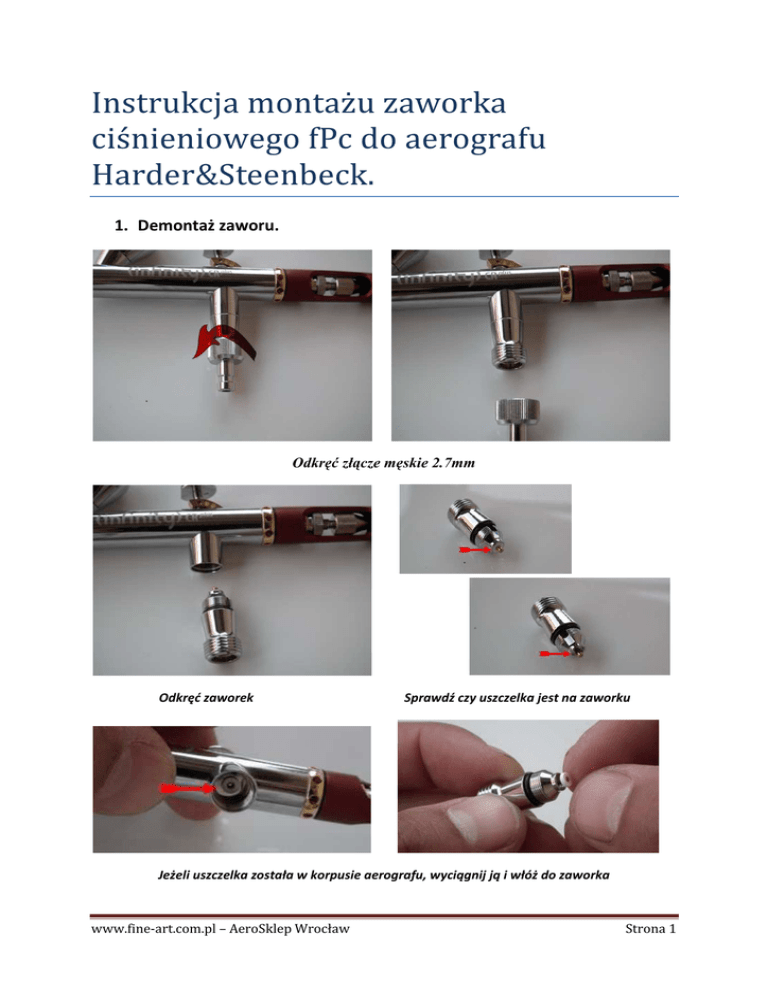 Instrukcja montażu zaworka ciśnieniowego fPc do aerografu Harder&Steenbeck. 1. Demontaż zaworu. Odkręć złącze męskie 2.7mm Odkręć zaworek Sprawdź czy uszczelka jest na zaworku Jeżeli uszczelka została w korpusie aerografu, wyciągnij ją i włóż do zaworka www.fine-art.com.pl – AeroSklep Wrocław Strona 1 2. Montaż zaworka fPc Przykręć zaworek fPc w miejsce starego zaworu. Do fPc dokręć końcówkę męską do szybkozłącza i gotowe !!! www.fine-art.com.pl – AeroSklep Wrocław Strona 2