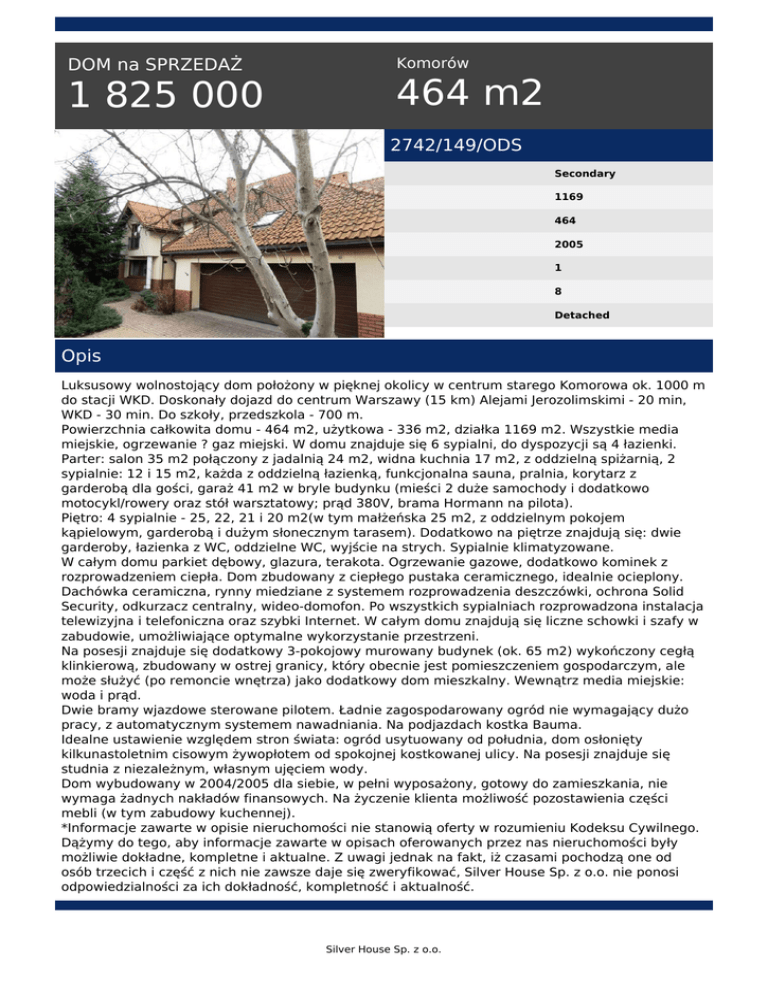 DOM na SPRZEDAŻ 1 825 000 Komorów 464 m2 2742/149/ODS Secondary 1169 464 2005 1 8 Detached Opis Luksusowy wolnostojący dom położony w pięknej okolicy w centrum starego Komorowa ok. 1000 m do stacji WKD. Doskonały dojazd do centrum Warszawy (15 km) Alejami Jerozolimskimi - 20 min, WKD - 30 min. Do szkoły, przedszkola - 700 m. Powierzchnia całkowita domu - 464 m2, użytkowa - 336 m2, działka 1169 m2. Wszystkie media miejskie, ogrzewanie ? gaz miejski. W domu znajduje się 6 sypialni, do dyspozycji są 4 łazienki. Parter: salon 35 m2 połączony z jadalnią 24 m2, widna kuchnia 17 m2, z oddzielną spiżarnią, 2 sypialnie: 12 i 15 m2, każda z oddzielną łazienką, funkcjonalna sauna, pralnia, korytarz z garderobą dla gości, garaż 41 m2 w bryle budynku (mieści 2 duże samochody i dodatkowo motocykl/rowery oraz stół warsztatowy; prąd 380V, brama Hormann na pilota). Piętro: 4 sypialnie - 25, 22, 21 i 20 m2(w tym małżeńska 25 m2, z oddzielnym pokojem kąpielowym, garderobą i dużym słonecznym tarasem). Dodatkowo na piętrze znajdują się: dwie garderoby, łazienka z WC, oddzielne WC, wyjście na strych. Sypialnie klimatyzowane. W całym domu parkiet dębowy, glazura, terakota. Ogrzewanie gazowe, dodatkowo kominek z rozprowadzeniem ciepła. Dom zbudowany z ciepłego pustaka ceramicznego, idealnie ocieplony. Dachówka ceramiczna, rynny miedziane z systemem rozprowadzenia deszczówki, ochrona Solid Security, odkurzacz centralny, wideo-domofon. Po wszystkich sypialniach rozprowadzona instalacja telewizyjna i telefoniczna oraz szybki Internet. W całym domu znajdują się liczne schowki i szafy w zabudowie, umożliwiające optymalne wykorzystanie przestrzeni. Na posesji znajduje się dodatkowy 3-pokojowy murowany budynek (ok. 65 m2) wykończony cegłą klinkierową, zbudowany w ostrej granicy, który obecnie jest pomieszczeniem gospodarczym, ale może służyć (po remoncie wnętrza) jako dodatkowy dom mieszkalny. Wewnątrz media miejskie: woda i prąd. Dwie bramy wjazdowe sterowane pilotem. Ładnie zagospodarowany ogród nie wymagający dużo pracy, z automatycznym systemem nawadniania. Na podjazdach kostka Bauma. Idealne ustawienie względem stron świata: ogród usytuowany od południa, dom osłonięty kilkunastoletnim cisowym żywopłotem od spokojnej kostkowanej ulicy. Na posesji znajduje się studnia z niezależnym, własnym ujęciem wody. Dom wybudowany w 2004/2005 dla siebie, w pełni wyposażony, gotowy do zamieszkania, nie wymaga żadnych nakładów finansowych. Na życzenie klienta możliwość pozostawienia części mebli (w tym zabudowy kuchennej). *Informacje zawarte w opisie nieruchomości nie stanowią oferty w rozumieniu Kodeksu Cywilnego. Dążymy do tego, aby informacje zawarte w opisach oferowanych przez nas nieruchomości były możliwie dokładne, kompletne i aktualne. Z uwagi jednak na fakt, iż czasami pochodzą one od osób trzecich i część z nich nie zawsze daje się zweryfikować, Silver House Sp. z o.o. nie ponosi odpowiedzialności za ich dokładność, kompletność i aktualność. Silver House Sp. z o.o. Andrzej Łukasiewicz tel. 502 36 26 16 tel. (22) 319 80 00 email: [email protected] Silver House Sp. z o.o. Powered by TCPDF (www.tcpdf.org)