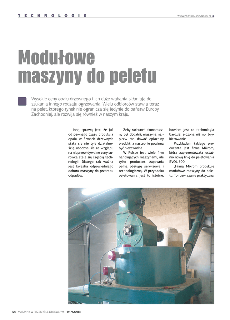 t e c h n o l o g i e www.portalmaszynowy.pl Modułowe maszyny do peletu Wysokie ceny opału drzewnego i ich duże wahania skłaniają do szukania innego rodzaju ogrzewania. Wielu odbiorców stawia teraz na pelet, którego rynek nie ogranicza się jedynie do państw Europy Zachodniej, ale rozwija się również w naszym kraju. Inną sprawą jest, że już od pewnego czasu produkcja opału w firmach drzewnych stała się nie tyle działalnością uboczną, ile ze względu na nieprzewidywalne ceny surowca staje się częścią technologii. Dlatego tak ważna jest kwestia odpowiedniego doboru maszyny do przerobu odpadów. 54 MASZYNY W PRZEMYŚLE DRZEWNYM 1 (17) 2011 r. Żeby rachunek ekonomiczny był dodatni, maszyna najpierw ma dawać opłacalny produkt, a następnie powinna być niezawodna. W Polsce jest wiele firm handlujących maszynami, ale tylko producent zapewnia pełną obsługę serwisową i technologiczną. W przypadku peletowania jest to istotne, bowiem jest to technologia bardziej złożona niż np. brykietowanie. Przykładem takiego producenta jest firma Mikrom, która zaprezentowała ostatnio nową linię do peletowania EVOL 500. „Firma Mikrom produkuje modułowe maszyny do peletu. To rozwiązanie praktyczne, ponieważ dzięki temu możemy dostosować wydajność linii do planowanej produkcji” – tłumaczy współwłaściciel firmy Bioterm z Osady k. Gostynina. W jego peleciarni pracują maszyny firmy Mikrom. „Zaczęliśmy od jednego modułu, ale firma nam się rozwija i jak osiągniemy maksimum naszej wydajności, to dostawimy kolejny moduł” – mówi. Tego typu maszyny zapewniają również zabezpieczenie produkcji, ponieważ każdy moduł stanowi niezależną linię i w razie zatrzymania jednego z nich, pozostałe pracują bez zmian. Linie Mikrom to rozwiązania elastyczne, bowiem można dzięki niemu produkować pelet z różnego rodzaju surowca. „Nie mamy swojego surowca, dlatego jest dla nas bardzo ważne, żeby łatwo przestawić maszynę pod inny surowiec. Linia Mikrom jest łatwa do przestawienia, ponieważ ma wałek ustawiany hydraulicznie, co pozwala na regulację w trakcie pracy” – mówi współwłaściciel firmy Bioterm. Historia granulowania biomasy zaczęła się w Stanach Zjednoczonych w latach 40. ubiegłego wieku. Peletowanie drewna to technologia trochę młodsza, lecz bardzo podobna. Powstała, kiedy nikt nie zwracał tak bardzo uwagi na zużycie prądu, bo jego ceny były znacznie niższe. Wielu producentów maszyn do peletu buduje dzisiaj maszyny według starych projektów. I przekłada się to często na koszty eksploatacji. „Nasza linia zużywa 25 kW/ h, co przy średniej wydajności modułu 430-450 kg/h daje 56-59 kW/t” – mówi współwłaściciel firmy Bioterm. „Są to bardzo niskie koszty, ponieważ firmy konkurencyjne potrzebują nawet 90-110 kW/t. „Firma Mikrom produkuje dzisiaj maszyny nieco inaczej niż konkurencja, dlatego osiąga lepsze parametry eksploatacyjne” – wyjaśnia właściciel firmy Mikrom. „Zawsze jest czas na szukanie nowej technologii, która pozwoli obniżyć koszty”. „My wybraliśmy linię Mikrom ze względu na niskie koszty eksploatacyjne oraz serwis producenta, który jest dostępny bez problemów, bo jest na miejscu” – przekonuje współwłaściciel firmy Bioterm. „Czasami potrzebowaliśmy pomocy technicznej bądź technologicznej i zapewniam, że w Mikromie ten serwis działa. Przekonaliśmy się również, że jest to prawda, że Mikrom potrzebuje tylko 25 kW/h, a przy tym pelet wychodzi bardzo ładny, dzięki czemu pozyskujemy coraz to nowych klientów”. R E K LAMA 1 (17) 2011 r. MASZYNY W PRZEMYŚLE DRZEWNYM 55