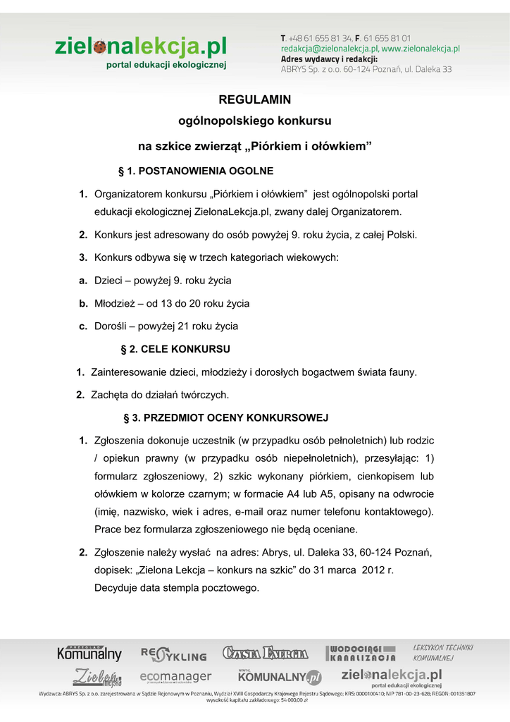 REGULAMIN ogólnopolskiego konkursu na szkice zwierząt „Piórkiem i ołówkiem” § 1. POSTANOWIENIA OGOLNE 1. Organizatorem konkursu „Piórkiem i ołówkiem” jest ogólnopolski portal edukacji ekologicznej ZielonaLekcja.pl, zwany dalej Organizatorem. 2. Konkurs jest adresowany do osób powyżej 9. roku życia, z całej Polski. 3. Konkurs odbywa się w trzech kategoriach wiekowych: a. Dzieci – powyżej 9. roku życia b. Młodzież – od 13 do 20 roku życia c. Dorośli – powyżej 21 roku życia § 2. CELE KONKURSU 1. Zainteresowanie dzieci, młodzieży i dorosłych bogactwem świata fauny. 2. Zachęta do działań twórczych. § 3. PRZEDMIOT OCENY KONKURSOWEJ 1. Zgłoszenia dokonuje uczestnik (w przypadku osób pełnoletnich) lub rodzic / opiekun prawny (w przypadku osób niepełnoletnich), przesyłając: 1) formularz zgłoszeniowy, 2) szkic wykonany piórkiem, cienkopisem lub ołówkiem w kolorze czarnym; w formacie A4 lub A5, opisany na odwrocie (imię, nazwisko, wiek i adres, e-mail oraz numer telefonu kontaktowego). Prace bez formularza zgłoszeniowego nie będą oceniane. 2. Zgłoszenie należy wysłać na adres: Abrys, ul. Daleka 33, 60-124 Poznań, dopisek: „Zielona Lekcja – konkurs na szkic” do 31 marca 2012 r. Decyduje data stempla pocztowego. § 4. ZASADY I PRZEBIEG KONKURSU 1. Uczestnictwo w Konkursie jest bezpłatne. 2. Zgłoszona może być praca wykonana wyłącznie na cele konkursu, którego dotyczy niniejszy regulamin. 3. Szkice oceni Komisja Konkursowa powołana przez portal ZielonaLekcja.pl. Zostanie przyznanych dziewięć nagród, po trzy w każdej kategorii wiekowej. 4. Zaświadczenia dla pozostałych uczestników będą wystawiane tylko na prośbę zainteresowanych. § 5. SPOSÓB I TERMIN OGŁOSZENIA WYNIKÓW 1. Rozstrzygniecie konkursu nastąpi w ciągu 30 dni od ostatecznej daty przyjmowania prac. Zwycięzcy otrzymają dyplomy oraz nagrody. 2. Wyniki konkursu będą podane do wiadomości uczestników konkursu na stronie internetowej www.zielonalekcja.pl 3. Laureaci zostaną powiadomieni telefonicznie lub przez pocztę elektroniczną e-mail. § 6. NAGRODY 1. Kategoria dzieci 9-12 lat • I miejsce - dyplom +Ptaki przestrzenne do malowania + linijka drewniana + „Leśna kolorowanka” • II miejsce - dyplom + zegar okrągły - o średnicy 30 cm + grafika artystyczna na drewnie + 2 x kolorowanka „Ptaki naszych lasów” i „Ssaki naszych lasów” + linijka drewniana • III miejsce - dyplom + maski leśnego zwierzęcia (do wyboru: wilk, puszczyk, ryś, wiewiórka) + karty do gry + kolorowanka „Ptaki naszych lasów” + linijka drewniana 2. Kategoria młodzież 13-20 lat • I miejsce - dyplom + zegar kwadratowy 30 x 30 z ramą + kalendarz + linijka drewniana • II miejsce - dyplom + zegar na drewnie 20 x 20 cm + grafika artystyczna na drewnie + linijka drewniana • III miejsce - dyplom + grafika artystyczna na drewnie + linijka drewniana 3. Kategoria dorośli - od 21 lat • I miejsce - dyplom + zegar okrągły o średnicy 30 cm + kalendarz + grafika artystyczna na drewnie • II miejsce - dyplom + kalendarz + zegar na drewnie 20 x 20 cm + grafika artystyczna na drewnie • III miejsce - dyplom + zegar na drewnie 20 x 20 cm + grafika artystyczna na drewnie § 7. UWAGI KOŃCOWE 1. Wyniki konkursu zatwierdzone przez Komisję Konkursową są ostateczne. Nie przysługuje odwołanie od decyzji Komisji Konkursowej. 2. Nagrodzone i wyróżnione prace przechodzą na własność Organizatora. Prace zgłoszone do konkursu nie będą zwracane autorom. Równocześnie dopuszcza się możliwość zwrotu w szczególnych przypadkach, na wniosek autora. 3. Organizator zastrzega sobie prawo do bezpłatnego korzystania z prac konkursowych, a szczególnie ich publikowania na stronach internetowych Organizatorów i Patronów Konkursu. Nadesłanie prac na Konkurs jest jednoznaczne z uznaniem niniejszego Regulaminu oraz wyrażeniem zgody na przesyłanie informacji drogą elektroniczną na podany adres poczty elektronicznej oraz wyrażeniem zgody na publikowanie danych osobowych przez Abrys Sp. z o.o. w celach związanych z Konkursem zgodnie z Ustawą z dnia 28.08.1997 r. o ochronie danych osobowych Sponsor: (Dz. U. z 2002 r. Nr 101 poz. 926).