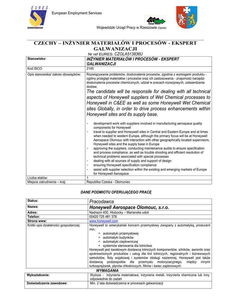 European Employment Services Wojewódzki Urząd Pracy w Rzeszowie (Opole) CZECHY – INŻYNIER MATERIAŁÓW I PROCESÓW - EKSPERT GALWANIZACJI Stanowisko: Nr ref EURES: CZOLA513836U INŻYNIER MATERIAŁÓW I PROCESÓW - EKSPERT GALWANIZACJI Kod ISCO: 2145 Opis stanowiska/ zakres obowiązków: Rozwiązywanie problemów, doskonalenie procesów, zgodnie z wymogami produktu ogólny przegląd materiałów i procesów oraz ich zastosowania - znajomość narzędzi doskonalenia procesów chemicznych, udział w pracach rozwojowych, zatwierdzanie dostaw. The candidate will be responsile for dealing with all technical aspects of Honeywell suppliers of Wet Chemical processes to Honeywell in C&EE as well as some Honeywell Wet Chemical sites Globally, in order to drive process enhancements within Honeywell sites and its supply base. - Liczba etatów: Miejsce zatrudnienia – kraj: development work with suppliers involved in manufacturing aerospace quality components for Honeywell travel to supplier and Honeywell sites in Central and Eastern Europe and at times when needed to western Europe, although the primary focus will be at Honeywell Aerospace Olomouc with interaction with other geographically located supervisors, Honeywell sites and the supply base in Europe approving the suppliers, conducting maintenance audits to ensure specification and process compliance, as well as trouble shooting and efficient resolution of technical problems associated with special processes dealing with all sources of supply and support of design ensuring Honeywell specification compliance assist with supplier selection within the existing and emerging markets of Europe for Honeywell Aerospace 1 Republika Czeska - Ołomuniec DANE PODMIOTU OFERUJĄCEGO PRACĘ Status: Nazwa: Pracodawca Honeywell Aerospace Olomouc, s.r.o. Adres: Telefon: Strona www: Krótki opis działalności gospodarczej: Nadrazni 400, Hlubocky – Marianske udoli 00420 725 481 378 www.honeywell.com Honeywell to amerykański koncern przemysłowy związany z automatyką, producent min.: automatyki przemysłowej automatyki budynków automatyki ciepłowniczej systemów sterowania dla lotnictwa. Honeywell jest światowym dostawcą lotniczych komponentów, silników, awioniki oraz spokrewnionych produktów i usług dla linii lotniczych, regionalnych i biznesowych samolotów, floty wojskowej i systemów obsługi naziemnej. Honeywell jest także dostawcą podzespołów dla przemysłu motoryzacyjnego, między innymi turbosprężarek, płynów chłodniczych, filtrów i świec zapłonowych. Wykształcenie: Wyższe - inżynieria materiałowa, inżynieria metali, inżynieria chemiczna lub inny odpowiednie do zadań Min. 2 lata doświadczenia w procesach galwanizacji WYMAGANIA Doświadczenie zawodowe: Znajomość języków: Język Poziom 1. angielski Dobry 2. czeski dobry Prawo jazdy kat „B” Zaletą będzie podsiadanie doświadczenia w charakterze lidera zespołu Zaletą będzie posiadanie doświadczenia w zarządzaniu projektami Gotowość do wykonywania podróży służbowych Uprawnienia/ dyplomy/ dokumenty Inne istotne wymagania: WYNAGRODZENIE I WARUNKI ZATRUDNIENIA Wysokość pensji brutto: Dodatkowe świadczenia: zakwaterowanie wyżywienie podróż Nazwa firmy, z którą zostanie podpisana umowa: Rodzaj umowy: Czas trwania umowy: Wymiar czasu pracy Liczba godzin pracy w tygodniu: Data rozpoczęcia: Od 20 000 do 40 000 Koron Czeskich brutto miesięcznie Nie Nie Nie Honeywell Aerospace Olomouc, s.r.o. Umowa o pracę Na czas nieokreślony pełny 40 Od zaraz SPOSÓB SKŁADANIA WNIOSKU Wymagane dokumenty CV Język, w którym muszą być sporządzone przedkładane dokumenty: Do kogo należy wysłać dokumenty: angielski Gdzie należy wysłać dokumenty: [email protected] Dodatkowe informacje: Szczegółowe informacje w języku angielskim lub czeskim: Veronika Hrochova Spickova +420 725 481 378 pracodawca KOORDYNATOR Wojewódzki Urząd Pracy w Opolu WAŻNOŚĆ Data publikacji: 12.08.2011 Termin przedkładania podań o pracę / zakończenia ważności oferty: Do odwołania Uprzejmie informujemy, że skontaktujemy się wyłącznie z wybranymi kandydatami. Urząd Pracy dokłada wszelkich starań, aby oferty pracy będące w zasobach urzędu, były rzetelne i wiarygodne. Ponieważ wszystkie oferty pracy pochodzą od osób trzecich Urząd Pracy zastrzega, że odpowiedzialność za ewentualne rozbieżności pomiędzy warunkami pracy zaprezentowanymi w niniejszej ofercie a warunkami zaproponowanymi przez potencjalnego pracodawcę ponosi pracodawca. Stosunek pracy z pracodawcą zagranicznym będzie zawarty w ramach prawa obowiązującego w kraju zatrudnienia. Oznacza to, że wszelkie roszczenie z tytułu nie wywiązywania się pracodawcy z warunków zawartych w umowie o pracę, dochodzić można wyłącznie w sądzie pracy w kraju zatrudnienia. W sytuacjach losowych pomoc polskich placówek konsularnych ogranicza się do ewentualnego udzielenia doraźnej pomocy (np. kredytu na zakup biletu powrotnego do Polski ). Na podstawie ustawy o ochronie danych osobowych z dnia 29 sierpnia 1997 r. (Dz. U. z 2002 r. Nr 101, poz. 926 ze zm.) informujemy, że administratorem danych osobowych wskazanych w dokumentach przekazanych w odpowiedzi na ofertę pracy jest pracodawca zagraniczny / Wojewódzki Urząd Pracy w Opolu, ul. Głogowska 25C, 45-315 Opole Dane osobowe wskazane dobrowolnie w ww. dokumentach będą przetwarzane i udostępniane publicznym służbom zatrudnienia, pracodawcom lub podmiotom reprezentującym pracodawców do celów związanych z pośrednictwem pracy w ramach sieci EURES, na podstawie ustawy z dnia 20 kwietnia 2004 r. o promocji zatrudnienia i instytucjach rynku pracy (Dz. U. z 2008 r. Nr 69, poz. 415 ze zm.) przez okres konieczny do osiągnięcia celu określonego w przedmiotowej ustawie. Osobie, której dane osobowe dotyczą przysługuje prawo dostępu do ich treści i prawo ich poprawiania. www.eures.europa.eu Więcej ofert pracy za granicą: www.eures.praca.gov.