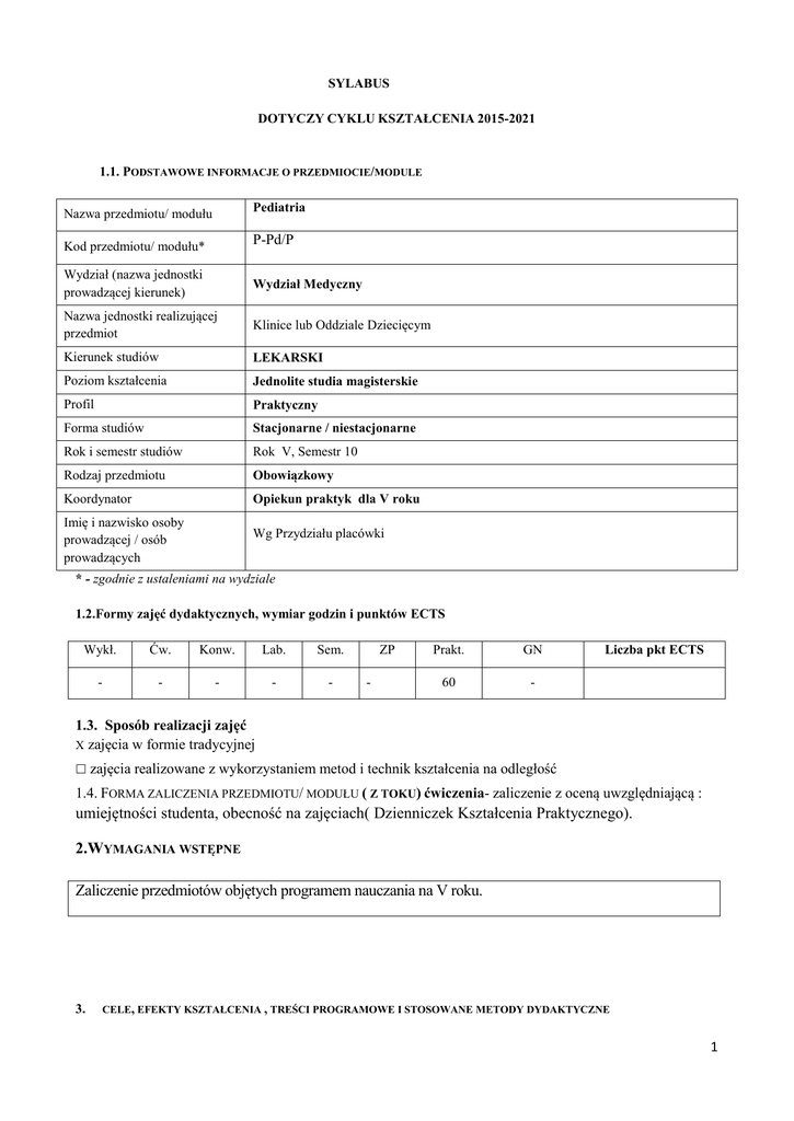 SYLABUS DOTYCZY CYKLU KSZTAŁCENIA 2015-2021 1.1. PODSTAWOWE INFORMACJE O PRZEDMIOCIE/MODULE Nazwa przedmiotu/ modułu Pediatria Kod przedmiotu/ modułu* P-Pd/P Wydział (nazwa jednostki prowadzącej kierunek) Wydział Medyczny Nazwa jednostki realizującej przedmiot Klinice lub Oddziale Dziecięcym Kierunek studiów LEKARSKI Poziom kształcenia Jednolite studia magisterskie Profil Praktyczny Forma studiów Stacjonarne / niestacjonarne Rok i semestr studiów Rok V, Semestr 10 Rodzaj przedmiotu Obowiązkowy Koordynator Opiekun praktyk dla V roku Imię i nazwisko osoby prowadzącej / osób prowadzących Wg Przydziału placówki * - zgodnie z ustaleniami na wydziale 1.2.Formy zajęć dydaktycznych, wymiar godzin i punktów ECTS Wykł. Ćw. Konw. Lab. Sem. - - - - - ZP - Prakt. GN 60 - Liczba pkt ECTS 1.3. Sposób realizacji zajęć X zajęcia w formie tradycyjnej ☐ zajęcia realizowane z wykorzystaniem metod i technik kształcenia na odległość 1.4. FORMA ZALICZENIA PRZEDMIOTU/ MODUŁU ( Z TOKU) ćwiczenia- zaliczenie z oceną uwzględniającą : umiejętności studenta, obecność na zajęciach( Dzienniczek Kształcenia Praktycznego). 2.WYMAGANIA WSTĘPNE Zaliczenie przedmiotów objętych programem nauczania na V roku. 3. CELE, EFEKTY KSZTAŁCENIA , TREŚCI PROGRAMOWE I STOSOWANE METODY DYDAKTYCZNE 1 3.1. C1 C2 C3 Cele przedmiotu/modułu zapoznanie się z organizacją Oddziału Dziecięcego /Kliniki/ i powiązaniach organizacyjnych Oddziału /Kliniki/ z lecznictwem otwartym, ocena stanu dziecka i jego psychofizycznego rozwoju, badanie dziecka, zasady udzielania pierwszej pomocy, pogłębienie umiejętności właściwego rozpoznawania i różnicowania podstawowych jednostek chorobowych ze szczególnym uwzględnieniem przypadków ostrych, poznanie właściwej interpretacji wyników badań pracowniczych, radiologicznych i patomorfologicznych udział w wizytach lekarskich i zapoznanie się z zasadami prowadzenia dokumentacji medycznej ocena stopnia nawodnienia niemowlęcia z ustaleniem wskazań do leczenia nawadniającego (ilość i skład płynu infuzyjnego ),ocena równowagi kwasowo-zasadowej u chorego dziecka, zwłaszcza niemowlęcia, uczestniczenie w konsultacjach wielospecjalistycznych. 3.2 EFEKTY KSZTAŁCENIA DLA PRZEDMIOTU/ MODUŁU EK ( EFEKT KSZTAŁCENIA) TREŚĆ EFEKTU KSZTAŁCENIA ZDEFINIOWANEGO DLA PRZEDMIOTU (MODUŁU) ODNIESIENIE DO EFEKTÓW KIERUNKOWYCH (KEK) EK_01 EK_02 EK_03 EK_04 EK_05 zna zasady żywienia dzieci zdrowych i chorych, szczepień ochronnych i prowadzenia bilansu zdrowia dziecka; przeprowadza wywiad lekarski z dzieckiem i jego rodziną; przeprowadza badanie fizykalne dziecka w każdym wieku; zestawia pomiary antropometryczne i ciśnienia krwi z danymi na siatkach centylowych; zna i rozumie przyczyny, objawy, zasady diagnozowania i postępowania terapeutycznego w przypadku najczęstszych chorób dzieci: c) ostrych i przewlekłych chorób górnych i dolnych dróg oddechowych, wad wrodzonych układu oddechowego, gruźlicy, mukowiscydozy, astmy, alergicznego nieżytu nosa, pokrzywki, wstrząsu anafilaktycznego, obrzęku naczynioworuchowego, e) ostrych i przewlekłych bólów brzucha, wymiotów, biegunek, zaparć, krwawień z przewodu pokarmowego, choroby wrzodowej, nieswoistych chorób jelit, chorób trzustki, cholestaz i chorób wątroby oraz innych chorób nabytych i wad wrodzonych przewodu pokarmowego, f) zakażeń układu moczowego, wad wrodzonych układu moczowego, zespołu nerczycowego, kamicy nerkowej, ostrej i przewlekłej niewydolności nerek, ostrych i przewlekłych zapaleń nerek, chorób układowych nerek, zaburzeń oddawania moczu, choroby refleksowej pęcherzowo moczowodowej, E.W2. E.U2. E.U4 E.U9. E.W3 2 3.3 EK_06 stosuje się do zasad aseptyki i antyseptyki; EK_07 prowadzi dokumentację medyczną pacjenta. E.U38. EK_08 ocenia stopień zaawansowania dojrzewania płciowego E.U10. EK_09 przeprowadza diagnostykę różnicową najczęstszych chorób dzieci; E.U12. EK_10 potrafi nawiązać i utrzymać głęboki i pełen szacunku kontakt z chorym F.U3 K.01 TREŚCI PROGRAMOWE Zbieranie wywiadu pediatrycznego, zasady dokumentowania. Badanie fizykalne dziecka Przyczyny, objawy, zasady diagnozowania i postępowania terapeutycznego w przypadku najczęstszych chorób dzieci . Pomiary antropometryczne Żywienia dzieci zdrowych i chorych, szczepienia ochronne i zasady prowadzenia bilansu zdrowia dziecka 3.4 METODY DYDAKTYCZNE Zajęcia seminaryjne, z moderowaną dyskusją dotyczącą tematu zajęć, Prezentacje multimedialne, Analiza przypadków 4. METODY I KRYTERIA OCENY 4.1 Sposoby weryfikacji efektów kształcenia Symbol efektu Metody oceny efektów kształcenia ( np.: kolokwium, egzamin ustny, egzamin pisemny, projekt, sprawozdanie, obserwacja w trakcie zajęć) Forma zajęć dydaktycznych ( w, ćw, …) EK_01-10 Moderowana dyskusja, aktywność studenta, umiejętność, interpretacji przedstawionego problemu diagnostycznego / Poprawna interpretacja przedstawionego problemu Ćw. praktyczne diagnostycznego. 4.2 Warunki zaliczenia przedmiotu (kryteria oceniania) Ocena przez opiekuna praktyki z wpisem do Dzienniczka Kształcenia Praktycznego( data, ocena, podpis opiekuna) 5. Całkowity nakład pracy studenta potrzebny do osiągnięcia założonych efektów w godzinach oraz punktach ECTS 3 Aktywność Liczba godzin/ nakład pracy studenta Godziny zajęć wg planu z nauczycielem 60 Przygotowanie do zajęć 10 Udział w konsultacjach - Czas na napisanie referatu/eseju - Przygotowanie do egzaminu - Udział w egzaminie - Inne (jakie?) - SUMA GODZIN 70 SUMARYCZNA LICZBA PUNKTÓW ECTS 2 1. PRAKTYKI ZAWODOWE W RAMACH PRZEDMIOTU/ MODUŁU Wymiar godzinowy Zasady i formy odbywania praktyk 60 PRAKTYKA WAKACYJNA Literatura podstawowa: [1] Kubicka K., Kawalec W. Pediatria PZWL Warszawa, 2006 [2] Dyduch A. Pediatria ,SUM , Katowice 2009 [3] Obuchowicz A. red. Badania podmiotowe i przedmiotowe w pediatrii, wyd. Śląska Akademia Medyczna [4] Sońta ‐ Jakimczyk D. [red]: Choroby
