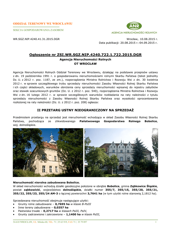 ODDZIAŁ TERENOWY WE WROCŁAWIU SEKCJA GOSPODAROWANIA ZASOBEM WR.SGZ.NIP.4240.41.31.2015.DGR Wrocław, 10.08.2015 r. Data publikacji: 20.08.2015 r.-04.09.2015 r. Ogłoszenie nr ZSI.WR.SGZ.NIP.4240.722.1.722.2015.DGR Agencja Nieruchomości Rolnych OT WROCŁAW Agencja Nieruchomości Rolnych Oddział Terenowy we Wrocławiu, działając na podstawie przepisów ustawy z dn. 19 października 1991 r. o gospodarowaniu nieruchomościami rolnymi Skarbu Państwa (tekst jednolity Dz. U. z 2012 r. poz. 1187, ze zm.), rozporządzenia Ministra Rolnictwa i Rozwoju Wsi z dn. 30 kwietnia 2012 r. w sprawie szczegółowego trybu sprzedaży nieruchomości Zasobu Własności Rolnej Skarbu Państwa i ich części składowych, warunków obniżenia ceny sprzedaży nieruchomości wpisanej do rejestru zabytków oraz stawek szacunkowych gruntów (Dz. U. z 2012 r. poz. 540), rozporządzenia Ministra Rolnictwa i Rozwoju Wsi z dn. 16 lutego 2012 r. w sprawie szczegółowych warunków rozkładania na raty należności z tytułu sprzedaży nieruchomości z Zasobu Własności Rolnej Skarbu Państwa oraz wysokości oprocentowania rozłożonej na raty należności (Dz. U. z 2012 r. poz. 208) ogłasza: II PRZETARG USTNY NIEOGRANICZONY NA SPRZEDAŻ Przedmiotem przetargu na sprzedaż jest nieruchomość wchodząca w skład Zasobu Własności Rolnej Skarbu Państwa, pochodząca ze zlikwidowanego Państwowego Gospodarstwa Rolnego Bobolice, woj. dolnośląskie. Nieruchomość nierolna zabudowana Bobolice. W skład nieruchomości wchodzą działki geodezyjne położone w obrębie Bobolice, gmina Ząbkowice Śląskie, powiat ząbkowicki, województwo dolnośląskie, działki numer 355/7, 355/15, 355/20, 355/21, 355/22, 355/23, 355/24 AM-3 o łącznej powierzchni 3,7641 ha (w tym użytki rolne stanowią 2,1812 ha). Sprzedawana nieruchomość obejmuje następujące użytki: Grunty rolne zabudowane – 0,7695 ha w klasie B-PsIII Inne tereny zabudowane – 0,0357 ha Pastwiska trwałe – 0,2717 ha w klasach PsIII, PsIV, Grunty zadrzewione i zakrzewione – 1,1400 ha w klasie PsIII, 54-610 WROCŁAW, UL. Mińska 60, TEL. 71 | 35 63 919, FAX 71 | 35 79 097 1 Nieużytki – 1,4785 ha Drogi – 0,0687 ha Powyższe informacje podawane są na podstawie danych z ewidencji gruntów. W skład nieruchomości wchodzą następujące budynki, budowle i inne składniki majątkowe: 1. Bud. mieszkalny – pałac nr inw. 9/110 [pow. zabudowy 1 306,60m2, pow. użytkowa 800,0m2]; 2. Ogrodzenie – mur pałacowy (105 mb) nr inw. 9/110; 3. Utwardzenie dziedzińca pałacu nr inw. 9/110; 4. Bud. gospodarczy – komórki z garażem nr inw. 108/002000 [pow. zabudowy 59,50 m2]; 5. Bud. gospodarczy – skład opału nr inw. 13/108 [pow. zabudowy 66,00 m2]; 6. Bud. gospodarczy – komórki pracownicze nr inw. 16/108, 17/108, 19/108 [pow. zabudowy 67,50 m2]; 7. Bud. gospodarczy – chlewik b/nr inw. [pow. zabudowy 10,56 m2]; 8. Hydrofornia – wodociąg (czynna) z ogrodzeniem nr inw. 211/000614/BN [pow. zabudowy 8,91 m2]; 9. Kocioł c.o. na miał KWM-S (sprawny) nr inw. 310/000027; 10. Szambo trzykomorowe b. o. nr inw. 291/000187/BN w parku (zbiornik przesyłowy); 11. Ogrodzenie placu zabaw (siatka druciana na stalowych słupkach 170 mb) nr inw. 291/000187/BN; 12. Ruiny budowli do odławiania ryb przy stawie b/nr inw.; 13. Studzienka kanalizacji deszczowej na terenie parku, w pobliżu drogi b/nr inw.; 14. Dwie kamienne figury parkowe b/ nr inw.; 15. Linia energetyczna nn (doprowadza energię do pałacu i hydroforni); Dostęp do mediów: energia elektryczna, woda (wodociąg gminny i dodatkowe ujęcie wody), kanalizacja (kanalizacja lokalna i gminna oczyszczalnia ścieków). Przedmiotowa nieruchomość znajduje się we wsi Bobolice, przy lokalnej drodze, w odległości 4,0 km od drogi krajowej nr 8 relacji Wrocław-Kłodzko, a około 5,0 km na północ od centrum Ząbkowic Śląskich. W otoczeniu parku i w pobliżu zabudowań folwarcznych (nie stanowiących przedmiotu sprzedaży) znajduje się wczesnobarokowy pałac czteroskrzydłowy na planie zbliżonym do kwadratu z wewnętrznym dziedzińcem arkadowym (obecnie arkady zamurowane), który powstał w wyniku przebudowy renesansowego dworu. Nad całą bryłą dominuje wieża przykryta baniastym hełmem. Budynek jest jednym z cenniejszych zabytków architektury renesansowo-barokowej na Dolnym Śląsku. Niewątpliwym atutem nieruchomości jest teren parku krajobrazowego i dawnego ogrodu ze stawem rybnym (połączonym z dwoma stawami poza terenem parku za pośrednictwem przepustu wodnego) oraz z zachowanymi rzeźbami ogrodowymi przedstawiającymi świętych. Aleje kasztanowców, lip, jesionów i grabów podkreślają kompozycję założenia i jego ozdobno-reprezentacyjny charakter. Aleja lipowa prowadziła na pagórek widokowy. Dawniej przy kamiennym murze, zamykającym ogród od drogi, znajdowały się dom ogrodnika i oranżeria (nie zachowane). Na osi centralnej parku powstała polana, która do niedawna stanowiła ogrodzony plac zabaw. Uszkodzeniu uległy urządzenia wodne parku, w wyniku czego staw uległ wypłycaniu, część parku stała się terenem podmokłym, a do zbiornika wodnego przedostają się ścieki gospodarcze. Na nieruchomości znajduje się DRZEWOSTAN, który stanowi w przeważającej części park na dz. nr 355/21. Wśród gatunków występujących na nieruchomości można wyróżnić następujące: brzoza omszona, buk pospolity, dąb szypułkowy, grab pospolity, jedlica zielona, jesion wyniosły, kasztanowiec biały, klon jawor, klon zwyczajny, lipa drobnolistna, olsza czarna, robinia akacjowa, sosna wejmutka, topole biała i czarna, wierzby biała i iwa, żywotnik wschodni, a także liczne samosiejki. Przedmiotem ochrony konserwatorskiej jest zamek w Bobolicach, wpisany do rejestru zabytków pod nr A/3593/1830 z dn. 08.10.1966 r. oraz park (nr rej. zab. A/3594/756/Wł z dn. 08.11.1980 r.). Ponadto teren zespołu położony jest w obszarze obserwacji archeologicznej wsi Bobolice, mur ogrodzenia parku