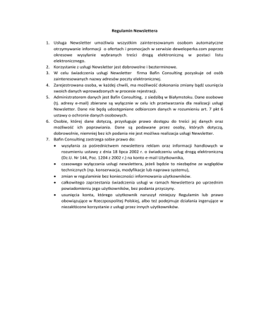 Regulamin Newslettera 1. Usługa Newsletter umożliwia wszystkim zainteresowanym osobom automatyczne otrzymywanie informacji o ofertach i promocjach w serwisie deweloperka.com poprzez okresowe wysyłanie wybranych treści drogą elektroniczną w postaci listu elektronicznego. 2. Korzystanie z usługi Newsletter jest dobrowolne i bezterminowe. 3. W celu świadczenia usługi Newsletter firma Bafin Consulting pozyskuje od osób zainteresowanych nazwy adresów poczty elektronicznej. 4. Zarejestrowana osoba, w każdej chwili, ma możliwość dokonania zmiany bądź usunięcia swoich danych wprowadzonych w procesie rejestracji. 5. Administratorem danych jest Bafin Consulting, z siedzibą w Białymstoku. Dane osobowe (tj. adresy e-mail) zbierane są wyłącznie w celu ich przetwarzania dla realizacji usługi Newsletter. Dane nie będą udostępniane odbiorcom danych w rozumieniu art. 7 pkt 6 ustawy o ochronie danych osobowych. 6. Osobie, której dane dotyczą, przysługuje prawo dostępu do treści jej danych oraz możliwość ich poprawiania. Dane są podawane przez osoby, których dotyczą, dobrowolnie, niemniej bez ich podania nie jest możliwa realizacja usługi Newsletter. 7. Bafin Consulting zastrzega sobie prawo do: wysyłania za pośrednictwem newslettera reklam oraz informacji handlowych w rozumieniu ustawy z dnia 18 lipca 2002 r. o świadczeniu usług drogą elektroniczną (Dz.U. Nr 144, Poz. 1204 z 2002 r.) na konto e-mail Użytkownika, czasowego wyłączania usługi newslettera, jeżeli będzie to niezbędne ze względów technicznych (np. konserwacja, modyfikacje lub naprawa systemu), zmian w regulaminie bez konieczności informowania użytkowników. całkowitego zaprzestania świadczenia usługi w ramach Newslettera po uprzednim powiadomieniu jego użytkowników, bez podania przyczyny. usunięcia konta, którego użytkownik naruszył niniejszy Regulamin lub prawo obowiązujące w Rzeczpospolitej Polskiej, albo też podejmuje działania ingerujące w niezakłócone korzystanie z usługi przez innych użytkowników. * Jeżeli zgoda wyrażana jest elektronicznie, system informatyczny powinien przechowywać informacje na temat wyrażenia zgody.