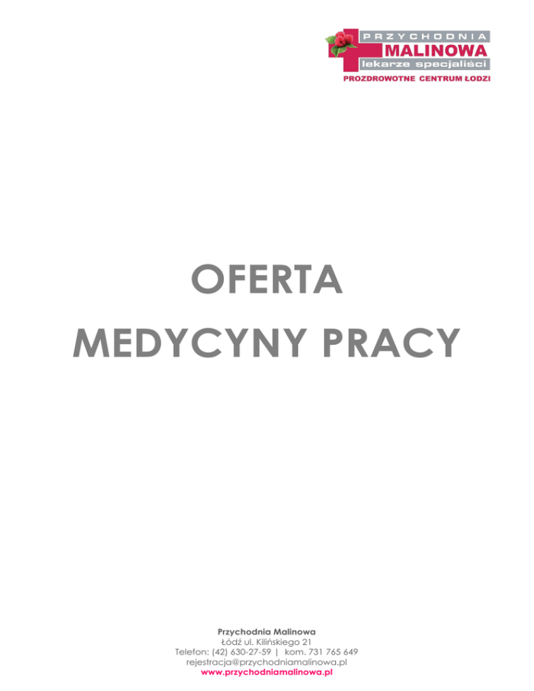OFERTA MEDYCYNY PRACY Przychodnia Malinowa Łódź ul. Kilińskiego 21 Telefon: (42) 630-27-59 | kom. 731 765 649 [email protected] www.przychodniamalinowa.pl Szanowni Państwo, zgodnie z treścią Kodeksu Pracy, pracodawcy zobowiązani są do kierowania na badania profilaktyczne (wstępne, okresowe i kontrolne) pracowników zatrudnionych na podstawie umów o pracę. W odpowiedzi na wynikające z tego Państwa potrzeby, oddajemy do dyspozycji naszą Przychodnię. Zapewniamy opiekę wielu lekarzy specjalistów oraz posiadamy pełne wyposażenie dostosowane do świadczenia specjalistycznych usług medycznych. Nasza Przychodnia zlokalizowana jest w dogodnym komunikacyjnie punkcie miasta, przy ulicy Kilińskiego 21 w Łodzi. Gwarantujemy: najwyższy standard świadczonych usług, maksymalnie krótki czas wykonania wszystkich niezbędnych badań, bardzo korzystne ceny, telefoniczną rezerwację wizyt, czytelne i klarowne druki skierowań na badania, sprawność obsługi, poprawność formalną i merytoryczną wystawionych zaświadczeń o zdolności do pracy, rezerwacja miejsc na nasze akcje profilaktyczne (także bezpłatne) z wielu dziedzin medycyn - pozyskujemy środki finansowe z Urzędu Miasta, Urzędu Marszałkowskiego oraz z Norweskiego Mechanizmu Finansowego. Każdy podmiot gospodarczy ma obowiązek zawarcia pisemnej umowy z jednostką medycyny pracy, która będzie przeprowadzać badania lekarskie pracowników danego zakładu. Wynika to z art. 12 ust. 1 ustawy z dnia 27 czerwca 1997 r. o służbie medycyny pracy. Zgodnie z art. 12 ust. 1 ww. ustawy, badania wstępne, okresowe i kontrolne pracowników oraz inne świadczenia zdrowotne są wykonywane na podstawie pisemnej umowy zawartej przez pracodawcę z podstawową jednostką służby medycyny pracy. W konsekwencji badania wykonane poza tą jednostką mogą zostać zakwestionowane, np. w razie kontroli PIP. Przepisy dotyczą każdego zakładu pracy, bez względu na ilość zatrudnianych pracowników. ZAPRASZAMY DO WSPÓŁPRACY CENNIK USŁUG MEDYCZNYCH Z ZAKRESU MEDYCYNY PRACY Rabat przewidziany jest dla podmiotów gospodarczych, z którymi zawarta jest umowa o współpracy Cena po rabacie Cena regularna Okulista w ramach medycyny pracy 55,00 zł Neurolog w ramach medycyny pracy 55,00 zł Laryngolog w ramach medycyny pracy 55,00 zł Badania krwi (morfologia, cholesterol, Aspat, Alat, glukoza, bilirubina), badanie ogólne moczu w ramach medycyny pracy EKG w ramach medycyny pracy 7,00 zł / szt. 30,00 zł Audiometria w ramach medycyny pracy 40,00 zł Spirometria w ramach medycyny pracy 30,00 zł RTG w ramach medycyny pracy 45,00 zł Testy psychologiczne dla kierowców pojazdów służbowych w ramach medycyny pracy 120,00 zł Testy psychologiczne dla operatorów wózków widłowych, w ramach medycyny pracy 110,00 zł Wydanie orzeczenia do celów sanitarnoepidemiologicznych 25,00 zł Ustalana indywidualnie z firmą zainteresowaną podpisaniem umowy W razie pytań i wątpliwości na Państwa pytania odpowie: Konsultant w zakresie medycyny pracy Adrianna Krzeszewska tel. +48 661 607 600 [email protected] Przychodnia Malinowa Łódź ul. Kilińskiego 21 Telefon: (42) 630-27-59 | kom. 731 765 649 [email protected] www.przychodniamalinowa.pl