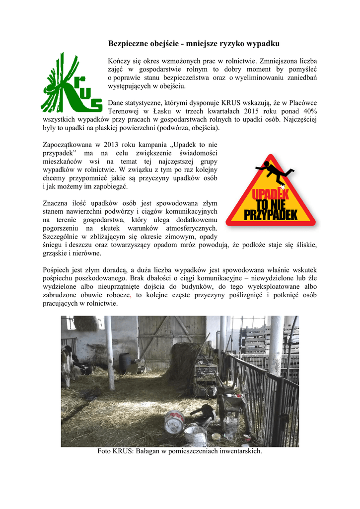 Bezpieczne obejście - mniejsze ryzyko wypadku Kończy się okres wzmożonych prac w rolnictwie. Zmniejszona liczba zajęć w gospodarstwie rolnym to dobry moment by pomyśleć o poprawie stanu bezpieczeństwa oraz o wyeliminowaniu zaniedbań występujących w obejściu. Dane statystyczne, którymi dysponuje KRUS wskazują, że w Placówce Terenowej w Łasku w trzech kwartałach 2015 roku ponad 40% wszystkich wypadków przy pracach w gospodarstwach rolnych to upadki osób. Najczęściej były to upadki na płaskiej powierzchni (podwórza, obejścia). Zapoczątkowana w 2013 roku kampania „Upadek to nie przypadek” ma na celu zwiększenie świadomości mieszkańców wsi na temat tej najczęstszej grupy wypadków w rolnictwie. W związku z tym po raz kolejny chcemy przypomnieć jakie są przyczyny upadków osób i jak możemy im zapobiegać. Znaczna ilość upadków osób jest spowodowana złym stanem nawierzchni podwórzy i ciągów komunikacyjnych na terenie gospodarstwa, który ulega dodatkowemu pogorszeniu na skutek warunków atmosferycznych. Szczególnie w zbliżającym się okresie zimowym, opady śniegu i deszczu oraz towarzyszący opadom mróz powodują, że podłoże staje się śliskie, grząskie i nierówne. Pośpiech jest złym doradcą, a duża liczba wypadków jest spowodowana właśnie wskutek pośpiechu poszkodowanego. Brak dbałości o ciągi komunikacyjne – niewydzielone lub źle wydzielone albo nieuprzątnięte dojścia do budynków, do tego wyeksploatowane albo zabrudzone obuwie robocze, to kolejne częste przyczyny poślizgnięć i potknięć osób pracujących w rolnictwie. Foto KRUS: Bałagan w pomieszczeniach inwentarskich. Z informacji uzyskiwanych podczas prowadzenia przez KRUS postępowania powypadkowego wynika, że często zdarzają się potknięcia o wysokie progi w wejściach i przejściach budynków inwentarskich. Wiele budynków inwentarskich starego typu stwarza takie zagrożenia. Dużą liczbę wypadków w gospodarstwie rolnym stanowią upadki osób ze strychów, poddaszy, stodół i innych budynków gospodarczych, podczas układania i zrzucania pasz objętościowych i słomy przez niezabezpieczone otwory zrzutowe w stropach i ścianach budynków. Upadek z dużej wysokości najczęściej kończy się ciężkimi obrażeniami ciała, a nawet śmiercią poszkodowanych. Liczną grupę przyczyn upadków z wysokości stanowią: nieprawidłowy sposób wchodzenia i schodzenia z maszyn rolniczych oraz nieprawidłowo skonstruowane i usytuowane drabiny. Zarówno szczeble drabin, jak i stopnie przy ciągnikach i maszynach często zabrudzone są ziemią oraz resztkami roślinnymi, co sprzyja ześlizgnięciom. Każdego roku zdarzają się także tragiczne w skutkach wpadnięcia osób do niezabezpieczonych dołów i odkrytych studzienek ściekowych, szamb i zbiorników na gnojowicę. Dotyczy to szczególnie dzieci. W maju ubiegłego roku, w jednej z gmin województwa łódzkiego 2,5 roczna dziewczynka wpadła do źle zabezpieczonego szamba. W ciężkim stanie trafiła do szpitala w Łodzi. Dlatego pamiętajmy, że nie tylko dorośli mieszkańcy wsi są narażeni na niebezpieczeństwa występujące na terenie posesji. Dbajmy o ład i porządek myśląc także o dzieciach i osobach starszych zamieszkujących teren gospodarstwa rolnego. Dzieci nie mają tyle świadomości a osoby starsze nie mają takiej sprawności by poradzić sobie z wszystkimi niedogodnościami, które mogą napotkać podczas codziennego życia w gospodarstwie. Dla uniknięcia niebezpiecznych zdarzeń można sformułować kilka podstawowych zasad, których przestrzeganie niejednokrotnie może uratować zdrowie bądź życie, a najważniejsze z nich to: Pamiętaj: -zachowuj porządek w obejściu, dbaj o stan techniczny ciągów komunikacyjnych, ich czystość i właściwe rozmieszczenie; -stosuj właściwe obuwie robocze, przylegające do kostki o podeszwie protektorowanej, które zmniejszy niebezpieczeństwo poślizgnięć i potknięć; -używaj maszyn wyposażonych w mocne i dobrze zamontowane drabinki oraz schodki wejściowe do kabin, przyczep i na pomosty; wchodź i schodź z nich przodem do maszyny; -przestrzegaj zasad bhp podczas prac remontowo-budowlanych w gospodarstwie; prace na wysokościach wykonuj na stabilnych podestach zabezpieczonych barierkami; -używaj bezpiecznych drabin i odpowiednio skonstruowanych schodów; -oznaczaj w sposób widoczny progi; -zabezpieczaj szamba i studzienki pokrywami; -stosuj odpowiednie środki ochrony pracy podczas prac na wysokości; -zabezpieczaj wszelkie otwory przykrywami lub barierkami; -nie przewoź osób na błotnikach ciągnika, na przyczepach na ładunku; -nie pracuj, gdy jesteś chory, przemęczony, zestresowany. Foto KRUS: Prawidłowo oznaczony próg. Podczas szkoleń dla rolników, pracownicy Kasy Rolniczego Ubezpieczenia Społecznego kładą szczególny nacisk na omówienie zagrożeń związanych z upadkami osób. W każdej placówce KRUS dostępne są bezpłatne broszury i ulotki związane z kampanią „Upadek to nie przypadek”. W materiałach tych szczegółowo opisano sposoby zapobiegania upadkom osób w gospodarstwach rolnych. Zachęcamy do udziału w szkoleniach oraz zapoznawania się z publikacjami o tematyce bhp w rolnictwie. Placówka Terenowa KRUS w Łasku przypomina również, że jeżeli już dojdzie do wypadku przy pracy rolniczej, zgłoszenia zdarzenia do KRUS powinien dokonać poszkodowany lub inna osoba, niezwłocznie po jego zaistnieniu. Zgłoszenia można dokonać osobiście, telefonicznie, za pośrednictwem poczty lub drogą elektroniczną we wszystkich placówkach terenowych Kasy. Przemysław Kraska Oddział Regionalny KRUS w Łodzi