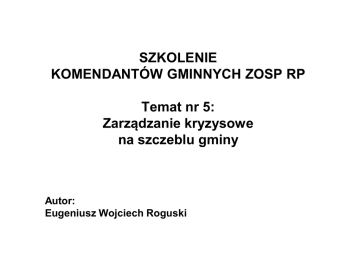 SZKOLENIE KOMENDANTÓW GMINNYCH ZOSP RP Temat nr 5: Zarządzanie kryzysowe na szczeblu gminy Autor: Eugeniusz Wojciech Roguski ZAGROŻENIA NATURALNE I TECHNICZNE OCHRONA CYWILNA BEZPIECZEŃSTWO OBYWATELI POLITYKA I STRATEGIA BEZPIECZEŃSTWA ZARZĄDZANIE BEZPIECZEŃSTWEM ZARZĄDZANIE KRYZYSOWE ZARZĄDZANIE W NAGŁYCH WYPADKACH ZARZĄDZANIE BEZPIECZEŃSTWEM W MIEJSCACH PRACY I WYPOCZYNKU ZARZĄDZANIE W INNYCH SYTUACJACH KRYZYSOWYCH Ogólne zasady zarządzania: planowanie, organizowanie, angażowanie, kierowanie (a w przypadku podmiotów i osób nie podlegających zarządzającemu – koordynowanie), oraz kontrolowanie. FAZY ZARZĄDZANIA KRYZYSOWEGO ŁAŃCUCH BEZPIECZEŃSTWA REGUŁA ZARZĄDZANIA RYZYSOWEGO KOORDYNACJA KRAJ POZIOM KRAJOWY RZĄDOWY WOJEWÓDZTWO POWIAT POZIOM LOKALNY SAMORZĄDOWY GMINA ZARZĄDZANIE PLANOWANIE ORGANIZOWANIE ANGAŻOWANIE KIEROWANIE KONTROLOWANIE FUNDAMENTALNE ZASADY ZARZĄDZANIA W SYTUACJACH KRYZYSOWYCH PRYMAT UKŁADU TERYTORIALNEGO NAD RESORTOWYM; JEDNOOSOBOWE KIEROWANIE I ODPOWIEDZIALNOŚĆ; REAGOWANIE NA NAJNIŻSZYM MOŻLIWYM POZIOMIE ADMINISTRACJI; ORGAN WYŻSZEGO SZCZEBLA ZOBOWIĄZANY JEST DO UDZIELENIA POMOCY ORGANOWI NIŻSZEGO SZCZEBLA; ZESPOLENIE SIŁ I SRODKÓW NA KAŻDYM SZCZEBLU ADMINISTRACJI. PLANOWANIE CYWILNE-ZINTEGROWANE WINNO ZAPEWNIAĆ: Ciągłość funkcjonowania organów administracji publicznej, Możliwy do zaakceptowania poziom życia społecznego i gospodarczego, Ochronę ludności cywilnej i jej zaopatrywanie, Wspieranie i współpracę z siłami zbrojnymi w czasie pokoju (misje pokojowe), kryzysu i wojny, Wspieranie międzynarodowej pomocy humanitarnej, technicznej i eksperckiej. Plan Reagowania Kryzysowego – Plan Awaryjny określa: Zasady koordynacji działań podczas reagowania kryzysowego; Istniejące zasoby sił i środków . Plan Reagowania Kryzysowego – Plan Awaryjny określa: Obowiązki poszczególnych osób i organizacji wykonujących specjalistyczne działania w przypadku zdarzeń nadzwyczajnych Strukturę organizacyjną kierowania działaniami w fazie reagowania – linie współdziałania. PLANOWANIE CYWILNE - ZINTEGROWANE Plany reagowania kryzysowego Zaleca się tzw. funkcjonalne podejście do planu reagowania kryzysowego, które uzasadnia się tym, że skutki różnych zdarzeń kryzysowych, niezależnie od ich przyczyny, są podobne. Dlatego należy planować jak radzić sobie ze skutkami zdarzeń kryzysowych, a nie opracowywać oddzielnych planów dla każdego zagrożenia. Chociaż przyczyny katastrof mogą się bardzo różnić, to ich skutki zwykle są bardzo podobne. Oznacza to, że dana społeczność może planować, jak radzić sobie ze skutkami, jednakowymi dla wielu zagrożeń, zamiast opracowywać oddzielne plany dla każdego zagrożenia. SIATKA-MATRYCA BEZPIECZEŃSTWA w ujęciu zagrożeń PODMIOT ZAGROŻENIE POŻAR POWÓDŹ KATASTROFA BUDOWLANA WYPADEK KOMUNIKACYJNY EPIDEMIA WYBÓCH GAZU ... PSP POGOTOWIE RATUNKOWE POLICJA SIATKA-MATRYCA BEZPIECZEŃSTWA w ujęciu funkcjonalnym PODMIOT ZADANIE EWAKUACJA OSÓB EWAKUACJA MIENIA OSTRZEGANIE I ALARMOWANIE POMOC MEDYCZNA OPIEKA SANITARNA ZAKWATEROWANIE EWAKUOWANYCH ... STRAŻ POLICJA POGOTOWIE … Przykładowe podstawowe kroki postępowania przy tworzeniu planu: 1) uzyskanie prawa do planowania (stosownych upoważnień); 2) określenie struktury planu i wyznaczenie zespołu(ów) planistycznych; 3) zrozumienie istoty zadań głównych; 4) zdefiniowanie polityki i określenie celów; 5) ocena sytuacji, szkic planu; 6) konsultacja szkicu planu; 7) rozpoznanie podstawowych problemów i obszarów krytycznych; 8) określenie priorytetów; Przykładowe podstawowe kroki postępowania przy tworzeniu planu (cd.): 9) UZGODNIENIA; 10) wykonanie planu i jego dystrybucja; 11) uzgadnianie planów i procedur podmiotów wskazanych w planie; 12) finalizowanie planu; 13) zarządzanie planem; 14) trening i szkolenie; 15) weryfikacja i aktualizacja planu. USTAWA z dnia 8 marca 1990 r. o samorządzie gminnym. Art. 7. 1. Zaspokajanie zbiorowych potrzeb wspólnoty należy do zadań własnych gminy. W szczególności zadania własne obejmują sprawy: 14)porządku publicznego i bezpieczeństwa obywateli oraz ochrony przeciwpożarowej i przeciwpowodziowej, w tym wyposażenia i utrzymania gminnego magazynu przeciwpowodziowego, Art. 31b. 1. Jeżeli w inny sposób nie można usunąć bezpośredniego niebezpieczeństwa dla życia ludzi lub dla mienia, wójt może zarządzić ewakuację z obszarów bezpośrednio zagrożonych. 2. W przypadku wprowadzenia stanu klęski żywiołowej wójt działa na zasadach określonych w odrębnych przepisach. USTAWA O STANIE KLĘSKI ŻYWIOŁOWEJ (Dz. U. z dnia 22 maja 2002 r.) Art. 7. W czasie stanu klęski żywiołowej organy władzy publicznej działają w dotychczasowych strukturach (...) w ramach przysługujących im kompetencji ... Art. 8. W czasie stanu klęski żywiołowej działaniami prowadzonymi w celu zapobieżenia skutkom klęski żywiołowej lub ich usunięcia kierują kierują: 1) WÓJT (BURMISTRZ, PREZYDENT MIASTA) – (...), 2) starosta – (...), 3) wojewoda –(...), 4) minister właściwy do spraw wewnętrznych lub inny minister, ... USTAWA O STANIE KLĘSKI ŻYWIOŁOWEJ (Dz. U. z dnia 22 maja 2002 r.) Art. 9. 1. W czasie stanu klęski żywiołowej właściwy miejscowo wójt (burmistrz, prezydent miasta) k i e r u j e działaniami prowadzonymi na obszarze gminy (...). 2. W zakresie działań, o których mowa w ust. 1, wójt (burmistrz, prezydent miasta) może wydawać p o l e c e n i a wiążące organom jednostek pomocniczych, kierownikom jednostek organizacyjnych utworzonych przez gminę, kierownikom jednostek organizacyjnych ochrony przeciwpożarowej działających na obszarze gminy ... . Art. 12. 1. Działania w celu zapobieżenia skutkom klęski żywiołowej lub ich usunięcia wójt (burmistrz, prezydent miasta), (...) wykonują przy pomocy gminnego zespołu reagowania ... USTAWA O STANIE KLĘSKI ŻYWIOŁOWEJ (Dz. U. z dnia 22 maja 2002 r.) A