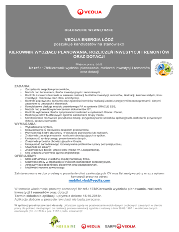 O G ŁO SZ EN I E W EW N ĘT RZN E VEOLIA ENERGIA ŁÓDŹ poszukuje kandydatów na stanowisko KIEROWNIK WYDZIAŁU PLANOWANIA, ROZLICZEŃ INWESTYCJI I REMONTÓW ORAZ DOTACJI Miejsce pracy: Łódź Nr ref.: 178/Kierownik wydziału planowania, rozliczeń inwestycji i remontów oraz dotacji 1 ZADANIA: o o o o o o o o o Zarządzanie zespołem pracowników, Nadzór nad tworzeniem planów inwestycyjnych i remontowych , Kontrola i sprawozdawczość w zakresie realizacji budżetów inwestycji, remontów, likwidacji, kosztów stałych pionu inwestycji i remontów oraz planu amortyzacji, Kontrola poprawności rozliczeń oraz zgodności terminów realizacji zadań z przyjętymi harmonogramami i danymi zawartymi w umowach i zleceniach, Kompleksowa obsługa modułu projektowego PA w systemie ORACLE EBS, Nadzór nad prawidłowym tworzeniem dokumentów OT, Kontrola wykonania planów i poprawności rozliczeń w systemach Oracle i Vector, Realizacja celów budżetowych zgodnie założeniami Grupy Veolia, Monitorowanie możliwości pozyskania dotacji, przygotowywanie wniosków aplikacyjnych, rozliczanie przyznanych dotacji, sprawozdawczość. WYMAGANIA: o o o o o o o o o o Wykształcenie wyższe, Doświadczenie w kierowaniu zespołem pracowników, Przynajmniej 2-letni staż pracy w obszarze planowania lub rozliczeń, Znajomość zasad planowania i rozliczeń obowiązujących w spółce, Umiejętność syntetycznego prezentowania danych, Znajomość procedur obowiązujących w Grupie, Umiejętność samodzielnego rozwiazywania problemów i pracy pod presją czasu, Otwartość na zmiany, Znajomość MS Excel i Oracle EBS (moduł PA i Zaopatrzenia), Mile widziana znajomość języka angielskiego. OFERUJEMY: o o o o Stałe zatrudnienie w stabilnej międzynarodowej firmie, Możliwość pracy w organizacji o wysokich standardach korporacyjnych, Atrakcyjny pakiet benefitów płacowych oraz pozapłacowych, Możliwość rozwoju zawodowego. Zainteresowane osoby prosimy o przesłanie ofert zawierających CV oraz list motywacyjny wraz z opisem koncepcji pracy na adres: [email protected] W temacie wiadomości prosimy zaznaczyć Nr ref.: 178/Kierownik wydziału planowania, rozliczeń inwestycji i remontów oraz dotacji Termin składania aplikacji upływa z dniem: 15.10.2015r. Aplikacje złożone w procesie rekrutacji nie będą zwracane. W aplikacji prosimy zawrzeć klauzulę: „Wyrażam zgodę na przetwarzanie moich danych osobowych zawartych w ofercie pracy dla potrzeb niezbędnych do realizacji procesu rekrutacji zgodnie z ustawą z dnia 29.08.1997 r. o ochronie danych osobowych (Dz.U z 2014 r poz. 1182 z późn. zmianami)”.