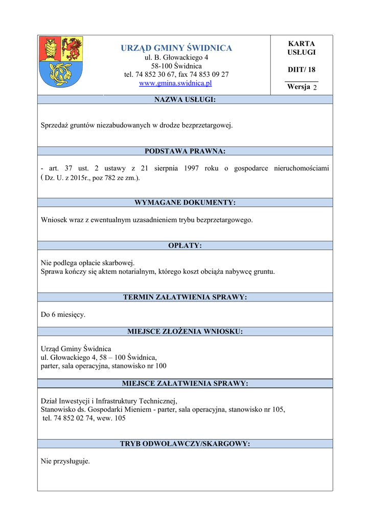 KARTA USŁUGI URZĄD GMINY ŚWIDNICA ul. B. Głowackiego 4 58-100 Świdnica tel. 74 852 30 67, fax 74 853 09 27 www.gmina.swidnica.pl DIIT/ 18 _________ Wersja 12 NAZWA USŁUGI: Sprzedaż gruntów niezabudowanych w drodze bezprzetargowej. PODSTAWA PRAWNA: - art. 37 ust. 2 ustawy z 21 sierpnia 1997 roku o gospodarce nieruchomościami (Dz. r. poz Nr 261, poz. 2603 z późn. zm.). Dz. U. U. zz 2004 2015r., 782 ze zm.). WYMAGANE DOKUMENTY: Wniosek wraz z ewentualnym uzasadnieniem trybu bezprzetargowego. OPŁATY: Nie podlega opłacie skarbowej. Sprawa kończy się aktem notarialnym, którego koszt obciąża nabywcę gruntu. TERMIN ZAŁATWIENIA SPRAWY: Do 6 miesięcy. MIEJSCE ZŁOŻENIA WNIOSKU: Urząd Gminy Świdnica ul. Głowackiego 4, 58 – 100 Świdnica, parter, sala operacyjna, stanowisko nr 100 MIEJSCE ZAŁATWIENIA SPRAWY: Dział Inwestycji i Infrastruktury Technicznej, Stanowisko ds. Gospodarki Mieniem - parter, sala operacyjna, stanowisko nr 105, tel. 74 852 02 74, wew. 105 TRYB ODWOŁAWCZY/SKARGOWY: Nie przysługuje. UWAGI: Sprzedaż gruntów niezabudowanych w drodze bezprzetargowej reguluje art. 37 ust.2 ustawy o gospodarce nieruchomościami. W drodze bezprzetargowej sprzedawane są nieruchomości m.in.: - kiedy przedmiotem zbycia jest nieruchomość lub jej części, jeśli mogą poprawić warunki zagospodarowania nieruchomości przyległej, stanowiącej własność lub oddanej w użytkowanie wieczyste osobie, która zamierza tę nieruchomość lub jej części nabyć, jeżeli nie mogą być zagospodarowane jako odrębne nieruchomości - na rzecz kościołów i związków wyznaniowych na cele działalności sakralnej - gdy sprzedaż nieruchomości następuje na rzecz jej użytkownika wieczystego - gdy przedmiotem zbycia jest udział w nieruchomości, a zbycie następuje na rzecz innych współwłaścicieli nieruchomości.