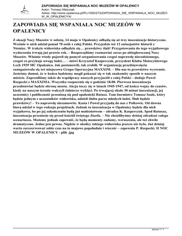 ZAPOWIADA SIĘ WSPANIAŁA NOC MUZEÓW W OPALENICY Autor: Tomasz Matusiak Adres: http://www.opalenica.pl/PL/1000/273/ZAPOWIADA_SIE_WSPANIALA_NOC_MUZEO W_W_OPALENICY/k/ ZAPOWIADA SIĘ WSPANIAŁA NOC MUZEÓW W OPALENICY Z okazji Nocy Muzeów w sobotę, 14 maja w Opalenicy odbędą się aż trzy inscenizacje historyczne. Weźmie w nich udział ponad 70 osób z całej Polski. Przyjedzie też 12 entuzjastów historii z Niemiec. W trakcie widowiska odbędzie się… prawdziwy ślub! Przygotowania do tego wyjątkowego wydarzenia trwają już prawie rok. – Rozpoczęliśmy rozmawiać zaraz po ubiegłorocznej Nocy Muzeów. Właśnie wtedy pojawił się pomysł zorganizowania czegoś naprawdę niecodziennego, czegoś co przykuje uwagę ludzi… – mówi Krzysztof Kasperczak, prezydent Klubu Motocyklowego Lech 1929 MC Opalenica. Jak postanowili, tak zrobili. W organizację przedsięwzięcia zaangażowała się też miejscowa Grupa Operacyjna MAXXIM. – Dla nas to prawdziwe wyzwanie. Jesteśmy dumni, że w końcu będziemy mogli pokazać się w tak znakomity sposób w naszym mieście. Zaprosiliśmy także do współpracy naszych przyjaciół z całej Polski – dodaje Paweł Rzepecki z MAXXIMA. Wszystko rozpocznie się o godzinie 18.00. Pierwsza inscenizacja przedstawiać będzie obronę mostu. Akcja toczy się w latach 1945-1947, od końca wojny do czasów, kiedy na naszym terenie walczyli żołnierze wyklęci. Po trwającej około 30 minut inscenizacji, jej uczestnicy i publiczność przeniosą się pod opalenicki Ratusz. Tam burmistrz Tomasz Szulc, który będzie jednym z uczestników widowiska, udzieli ślubu parze młodych ludzi. Ślub będzie prawdziwy! – To naprawdę niesamowite. Kasia i Paweł przyjadą do nas z Polkowic. Od dawna biorą udział w tego rodzaju projektach. Jednak ta inscenizacja w Opalenicy będzie dla nich wyjątkowa, bo po jej zakończeniu będą już małżeństwem – zdradza K. Kasperczak. Spod Ratusza, inscenizacja przeniesie się przed kościół świętego Józefa. – Nie chcielibyśmy dzisiaj zdradzać całego scenariusza. Możemy jednak zapewnić, że będą momenty zadumy, wzruszenia, ale też chwile dramatyczne. Jedno jest pewne. Nigdzie w okolicy takiego widowiska jeszcze nie było. Już dzisiaj warto zarezerwować sobie czas na to majowe popołudnie i wieczór – zapewnia P. Rzepecki. II NOC MUZEÓW W OPALENICY - plik .jpg strona 1 / 1 Powered by TCPDF (www.tcpdf.org)