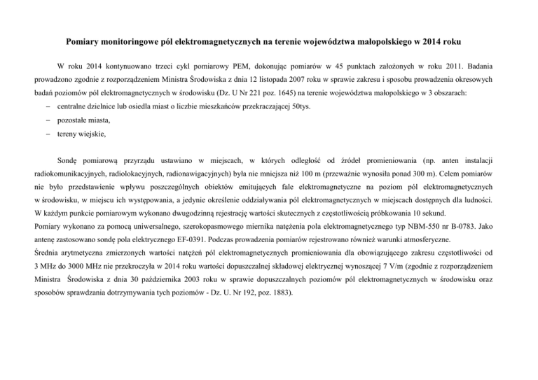 Pomiary monitoringowe pól elektromagnetycznych na terenie województwa małopolskiego w 2014 roku W roku 2014 kontynuowano trzeci cykl pomiarowy PEM, dokonując pomiarów w 45 punktach założonych w roku 2011. Badania prowadzono zgodnie z rozporządzeniem Ministra Środowiska z dnia 12 listopada 2007 roku w sprawie zakresu i sposobu prowadzenia okresowych badań poziomów pól elektromagnetycznych w środowisku (Dz. U Nr 221 poz. 1645) na terenie województwa małopolskiego w 3 obszarach: centralne dzielnice lub osiedla miast o liczbie mieszkańców przekraczającej 50tys. pozostałe miasta, tereny wiejskie, Sondę pomiarową przyrządu ustawiano w miejscach, w których odległość od źródeł promieniowania (np. anten instalacji radiokomunikacyjnych, radiolokacyjnych, radionawigacyjnych) była nie mniejsza niż 100 m (przeważnie wynosiła ponad 300 m). Celem pomiarów nie było przedstawienie wpływu poszczególnych obiektów emitujących fale elektromagnetyczne na poziom pól elektromagnetycznych w środowisku, w miejscu ich występowania, a jedynie określenie oddziaływania pól elektromagnetycznych w miejscach dostępnych dla ludności. W każdym punkcie pomiarowym wykonano dwugodzinną rejestrację wartości skutecznych z częstotliwością próbkowania 10 sekund. Pomiary wykonano za pomocą uniwersalnego, szerokopasmowego miernika natężenia pola elektromagnetycznego typ NBM-550 nr B-0783. Jako antenę zastosowano sondę pola elektrycznego EF-0391. Podczas prowadzenia pomiarów rejestrowano również warunki atmosferyczne. Średnia arytmetyczna zmierzonych wartości natężeń pól elektromagnetycznych promieniowania dla obowiązującego zakresu częstotliwości od 3 MHz do 3000 MHz nie przekroczyła w 2014 roku wartości dopuszczalnej składowej elektrycznej wynoszącej 7 V/m (zgodnie z rozporządzeniem Ministra Środowiska z dnia 30 października 2003 roku w sprawie dopuszczalnych poziomów pól elektromagnetycznych w środowisku oraz sposobów sprawdzania dotrzymywania tych poziomów - Dz. U. Nr 192, poz. 1883). Wyniki pomiarów monitoringu pól elektromagnetycznych na terenie województwa małopolskiego w 2014 roku Miasta o liczbie mieszkańców przekraczającej 50 tys. Lp. 1 2 3 4 5 6 7 8 9 10 11 12 13 14 15 Lokalizacja punktów pomiarowych Kraków, ul. Meissnera Kraków, ul. Gen. Maczka Kraków, Rynek Główny Kraków, ul. Armii Krajowej Kraków, Pl. Inwalidów Kraków, Al..3 Maja Kraków, Rondo Grunwaldzkie Kraków, ul. Kurczaba Kraków, ul. Zbrojarzy Kraków, Pl. Centralny Nowy Sącz, ul. Jagiellońska Nowy Sącz, ul. Nawojowska Nowy Sącz, ul. Wiśniowieckiego Tarnów, ul. Mroźna Tarnów, ul. Legionów Wartość średnia do wszystkich miejsc Data pomiaru 05.09.14 14.08.14 19.09.14 16.07.14 31.10.14 24.06.14 09.09.14 08.07.14 07.05.14 16.09.14 29.10.14 04.07.14 20.03.14 25.07.14 15.09.14 Wartość średnia [V/m] Niepewność [V/m] 1,00 1,31 0,94 0,60 <0,3 0,65 1,07 0,48 0,97 0,52 <0,3 0,30 <0,3 0,95 <0,3 0,63 0,32 0,42 0,31 0,19 0,21 0,34 0,16 0,32 0,17 0,10 0,31 0,21 Pozostałe miasta Lp. 12 17 18 19 20 21 22 23 24 25 26 27 28 29 30 Lokalizacja punktów pomiarowych Powiat olkuski, Olkusz Powiat miechowski, Miechów Powiat olkuski, Wolbrom Powiat myślenicki, Myślenice Powiat gorlicki, Gorlice Powiat nowosądecki, Stary Sącz Powiat tarnowski, Zakliczyn Powiat nowotarski, Nowy Targ Powiat limanowski, Mszana Dolna Powiat oświęcimski, Oświęcim Powiat myślenicki, Sułkowice Powiat suski, Jordanów Powiat brzeski, Czchów Powiat chrzanowski, Alwernia Powiat oświęcimski, Kęty Wartość średnia do wszystkich miejsc Data pomiaru 30.09.14 24.02.14 13.06.14 13.03.14 30.10.14 20.08.14 18.06.14 08.09.14 26.02.14 29.08.14 07.02.14 25.04.14 31.07.14 12.03.14 28.10.14 Wartość średnia [V/m] 0,55 0,62 <0,3 <0,3 0,47 <0,3 <0,3 0,30 0,63 <0,3 <0,3 <0,3 <0,3 <0,3 0,35 0,29 Niepewność [V/m] 0,18 0,20 0,11 0,10 0,21 0,08 0,1 Tereny wiejskie Lp. Lokalizacja punktów pomiarowych Data pomiaru 31 32 33 34 35 36 37 38 39 40 41 42 43 44 45 Powiat krakowski, Sułoszowa Powiat proszowicki, Koniusza Powiat krakowski, Zagórzyce Dworskie Powiat miechowski, Jaksice Wolbrom, Zasępiec Powiat nowosądecki, Rytro Powiat limanowski, Tymbark Powiat miechowski, Racławice Powiat wadowicki, Brody Powiat myślenicki, Pcim Powiat krakowski, Świątniki Górne Powiat brzeski, Dębno Powiat bocheński, Trzciana Powiat dąbrowski, Bolesław Powiat gorlicki, Uście Gorlickie Wartość średnia do wszystkich miejsc 28.04.14 28.02.14 06.02.14 07.03.14 23.06.14 19.08.14 05.02.14 10.07.14 30.04.14 24.04.14 17.01.14 07.08.14 11.03.14 27.06.14 24.11.14 Wartość średnia [V/m] <0,3 <0,3 <0,3 <0,3 <0,3 <0,3 <0,3 <0,3 <0,3 <0,3 <0,3 <0,3 <0,3 <0,3 <0,3 0,15 Niepewność [V/m] 0,12