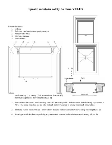 Sposób montażu rolety do okna VELUX Roleta dachowa: 1. Osłona 2. Roleta z mechanizmem sprężynowym 3. Mocowanie rolki 4. Listwa ciągnąca 5. Prowadnica Rys. 2 Rys. 3 1. M a s k maskownicę (1), roletę (2) i prowadnice boczne (5) położyć na płaskiej powierzchni (Rys. 1) 2. Prowadnice boczne i maskownicę osadzić na uchwytach. Zakończenia belki dolnej wykonane z PCV (4), które znajdują się po obu bokach należy wsunąć w szyny bocznych prowadnic. 3. Złożoną razem maskownice i prowadnice boczne należy zamontować w ramę okienną (Rys. 2) 4. Każdą prowadnicę boczną należy przymocować trzema śrubami do ramy okiennej. (Rys. 3)