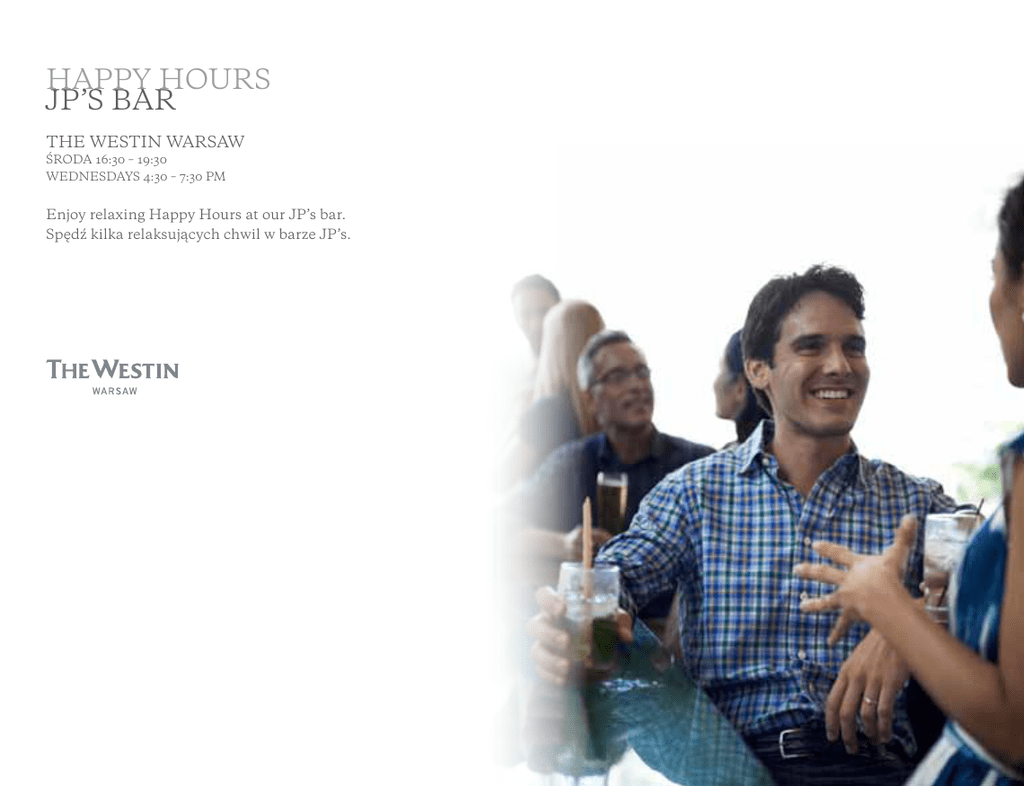 HAPPY HOURS JP’s BAR The Westin Warsaw środa 16:30 – 19:30 Wednesdays 4:30 – 7:30 PM Enjoy relaxing Happy Hours at our JP’s bar. Spędź kilka relaksujących chwil w barze JP’s. HAPPY HOURS JP’s BAR The westin warsaw al. Jana Pawła II 21, 00-854 Warszawa, Polska T 48.22.450.8000 F 48.22.450.8111 westin.com/warsaw W każdą środę zapraszamy na Happy Hours w barze JP’s. Enjoy special happy hours with live Dj set. „2 drinki w cenie 1” – promocja obejmuje całą kartę koktajli i alkoholi. JP’s bar is offering an impressive selection of cocktails and spirits – get 2 drinks while paying for 1! Od 18 o wyjątkowy nastrój zadba DJ. Starting from 6 pm our DJ will take care of your good mood.