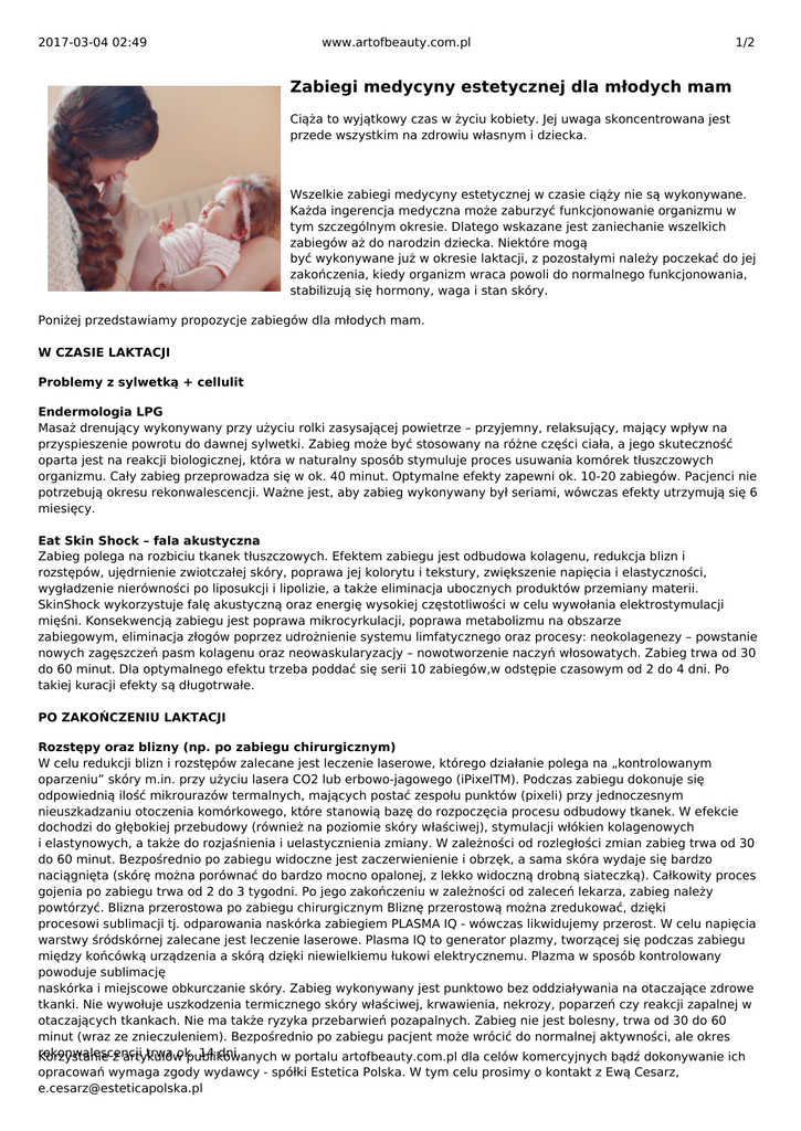 2017-03-04 02:49 www.artofbeauty.com.pl 1/2 Zabiegi medycyny estetycznej dla młodych mam Ciąża to wyjątkowy czas w życiu kobiety. Jej uwaga skoncentrowana jest przede wszystkim na zdrowiu własnym i dziecka. Wszelkie zabiegi medycyny estetycznej w czasie ciąży nie są wykonywane. Każda ingerencja medyczna może zaburzyć funkcjonowanie organizmu w tym szczególnym okresie. Dlatego wskazane jest zaniechanie wszelkich zabiegów aż do narodzin dziecka. Niektóre mogą być wykonywane już w okresie laktacji, z pozostałymi należy poczekać do jej zakończenia, kiedy organizm wraca powoli do normalnego funkcjonowania, stabilizują się hormony, waga i stan skóry. Poniżej przedstawiamy propozycje zabiegów dla młodych mam. W CZASIE LAKTACJI Problemy z sylwetką + cellulit Endermologia LPG Masaż drenujący wykonywany przy użyciu rolki zasysającej powietrze – przyjemny, relaksujący, mający wpływ na przyspieszenie powrotu do dawnej sylwetki. Zabieg może być stosowany na różne części ciała, a jego skuteczność oparta jest na reakcji biologicznej, która w naturalny sposób stymuluje proces usuwania komórek tłuszczowych organizmu. Cały zabieg przeprowadza się w ok. 40 minut. Optymalne efekty zapewni ok. 10-20 zabiegów. Pacjenci nie potrzebują okresu rekonwalescencji. Ważne jest, aby zabieg wykonywany był seriami, wówczas efekty utrzymują się 6 miesięcy. Eat Skin Shock – fala akustyczna Zabieg polega na rozbiciu tkanek tłuszczowych. Efektem zabiegu jest odbudowa kolagenu, redukcja blizn i rozstępów, ujędrnienie zwiotczałej skóry, poprawa jej kolorytu i tekstury, zwiększenie napięcia i elastyczności, wygładzenie nierówności po liposukcji i lipolizie, a także eliminacja ubocznych produktów przemiany materii. SkinShock wykorzystuje falę akustyczną oraz energię wysokiej częstotliwości w celu wywołania elektrostymulacji mięśni. Konsekwencją zabiegu jest poprawa mikrocyrkulacji, poprawa metabolizmu na obszarze zabiegowym, eliminacja złogów poprzez udrożnienie systemu limfatycznego oraz procesy: neokolagenezy – powstanie nowych zagęszczeń pasm kolagenu oraz neowaskularyzacjy – nowotworzenie naczyń włosowatych. Zabieg trwa od 30 do 60 minut. Dla optymalnego efektu trzeba poddać się serii 10 zabiegów,w odstępie czasowym od 2 do 4 dni. Po takiej kuracji efekty są długotrwałe. PO ZAKOŃCZENIU LAKTACJI Rozstępy oraz blizny (np. po zabiegu chirurgicznym) W celu redukcji blizn i rozstępów zalecane jest leczenie laserowe, którego działanie polega na „kontrolowanym oparzeniu” skóry m.in. przy użyciu lasera CO2 lub erbowo-jagowego (iPixelTM). Podczas zabiegu dokonuje się odpowiednią ilość mikrourazów termalnych, mających postać zespołu punktów (pixeli) przy jednoczesnym nieuszkadzaniu otoczenia komórkowego, które stanowią bazę do rozpoczęcia procesu odbudowy tkanek. W efekcie dochodzi do głębokiej przebudowy (również na poziomie skóry właściwej), stymulacji włókien kolagenowych i elastynowych, a także do rozjaśnienia i uelastycznienia zmiany. W zależności od rozległości zmian zabieg trwa od 30 do 60 minut. Bezpośrednio po zabiegu widoczne jest zaczerwienienie i obrzęk, a sama skóra wydaje się bardzo naciągnięta (skórę można porównać do bardzo mocno opalonej, z lekko widoczną drobną siateczką). Całkowity proces gojenia po zabiegu trwa od 2 do 3 tygodni. Po jego zakończeniu w zależności od zaleceń lekarza, zabieg należy powtórzyć. Blizna przerostowa po zabiegu chirurgicznym Bliznę przerostową można zredukować, dzięki procesowi sublimacji tj. odparowania naskórka zabiegiem PLASMA IQ - wówczas likwidujemy przerost. W celu napięcia warstwy śródskórnej zalecane jest leczenie laserowe. Plasma IQ to generator plazmy, tworzącej się podczas zabiegu między końcówką urządzenia a skórą dzięki niewielkiemu łukowi elektrycznemu. Plazma w sposób kontrolowany powoduje sublimację naskórka i miejscowe obkurczanie skóry. Zabieg wykonywany jest punktowo bez oddziaływania na otaczające zdrowe tkanki. Nie wywołuje uszkodzenia termicznego skóry właściwej, krwawienia, nekrozy, poparzeń czy reakcji zapalnej w otaczających tkankach. Nie ma także ryzyka przebarwień pozapalnych. Zabieg nie jest bolesny, trwa od 30 do 60 minut (wraz ze znieczuleniem). Bezpośrednio po zabiegu pacjent może wrócić do normalnej aktywności, ale okres rekonwalescencji trwa ok. 14 dni. Korzystanie z artykułów publikowanych w portalu artofbeauty.com.pl dla celów komercyjnych bądź dokonywanie ich opracowań wymaga zgody wydawcy - spółki Estetica Polska. W tym celu prosimy o kontakt z Ewą Cesarz, [email protected] 2017-03-04 02:49 www.artofbeauty.com.pl 2/2 Cellulit ALIDYA to nowoczesny preparat medyczny zarejestrowany do leczenia i profilaktyki cellulitu poprzez iniekcje. Najnowsza teoria dowodzi, że jedną z przyczyn powstawania cellulitu jest odkładanie się jonów żelaza, które niekorzystnie wpływają na właściwości błon komórkowych, białek i kwasów nukleinowych znajdujących się w komórce. Zadaniem tego preparatu jest wychwytywanie szkodliwych jonów żelaza i przywracanie sprawności błonom komórkowym. Zabieg powtarzany jest co 7 dni przez kolejne 7-12 tygodni. Efekty: Skóra jest bardziej jędrna, gładsza, a niechciany cellulit ulega redukcji. Efektami możemy się cieszyć kilka miesięcy od wykonania zabiegu. Miejscowe otłuszczenia Lipoliza to zabieg rozpuszczający tkankę tłuszczową, która następnie jest metabolizowana. Jest to niechirurgiczna metoda usuwania nadmiaru tkanki tłuszczowej. Preparat, na którym bazuje terapia to połączenie fosfatydylocholiny (substancja rozpuszczająca błony komórkowe komórek tłuszczowych) oraz deoksycholatu (substancja niszcząca tłuszcz). Uwolnione z komórek tłuszcze są następnie transportowane do wątroby, gdzie podlegają metabolizmowi i są usuwane z organizmu. Lipoliza najlepiej sprawdza się w redu