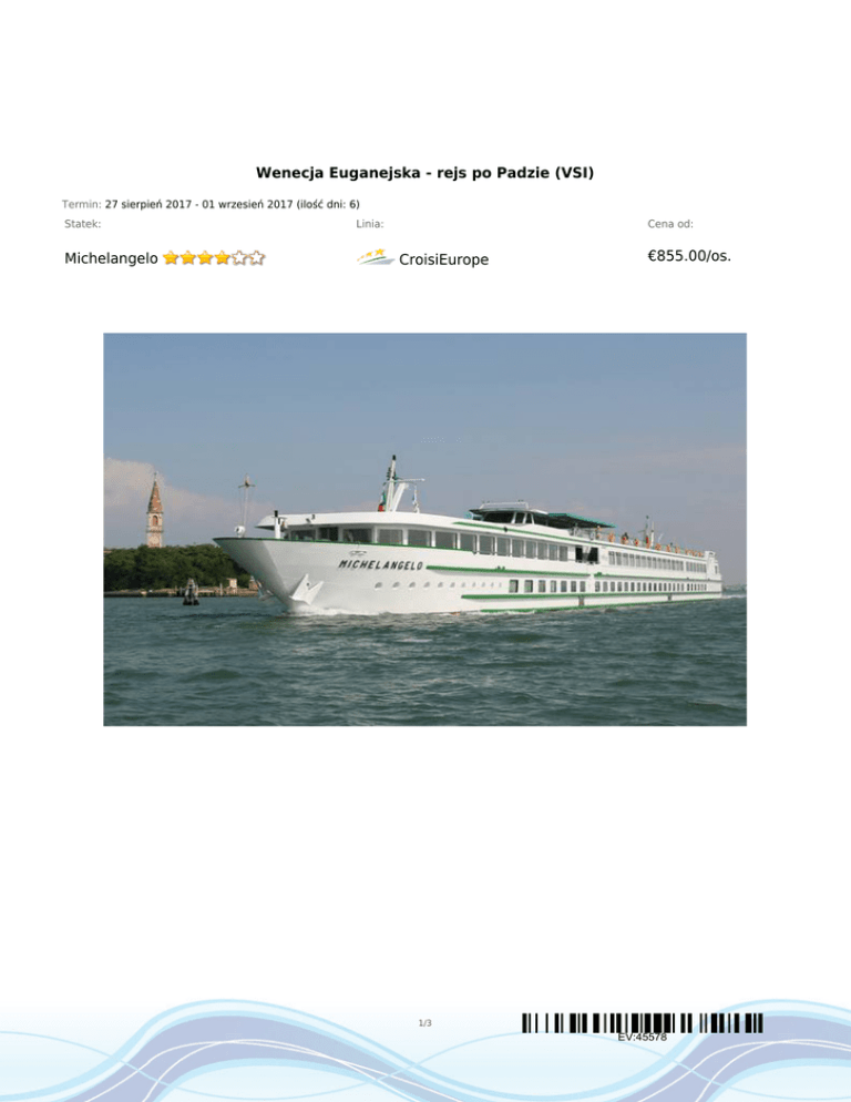 Wenecja Euganejska - rejs po Padzie (VSI) Termin: 27 sierpień 2017 - 01 wrzesień 2017 (ilość dni: 6) Statek: Michelangelo Linia: Cena od: CroisiEurope €855.00/os. 1/3 EV:45578 TRASA REJSU dzień 1 Data Port Wpłynięcie Wypłynięcie niedziela 27.08.2017 Wenecja --:-- --:-- Legenda Włochy Zaokrętowanie o godzinie 18:00. Koktajl powitalny i kolacja. Wolny wieczór w Wenecji. dzień 2 poniedziałek 28.08.2017 Chioggia --:-- --:-- Włochy Wczesnym rankiem wyruszymy w kierunku Chioggi. Po lunchu będzie możliwość skorzystania z wycieczki fakultatywnej do Padwy – miasta św. Antoniego, które jest znanym centrum pielgrzymkowym. Odwiedzimy bazylikę „Santo”, wybierzemy się na spacer po zabytkowym centrum miasta i odkryjemy słynną kawiarnię ”Pedrocchi”. dzień 2 poniedziałek 28.08.2017 Taglio di Po --:-- --:-- Włochy W międzyczasie statek popłynie w kierunku Taglio di Po gdzie dołączymy do niego około godziny 19:00. Dla uczestników którzy nie zdecydują się na skorzystanie z wycieczki przewidziany jest transfer do resortu Sottomarina. Będzie tutaj czas wolny żeby przespacerować się przepiękną nadmorska promenadą. Następnie przejazd do Taglio di Po, gdzie będzie czekać łódka. Po kolacji na statku przewidziany jest wieczór rozrywki. dzień 2 poniedziałek 28.08.2017 Polesella --:-- --:-- --:-- --:-- Włochy Na noc zacumujemy w Polesella. dzień 3 wtorek 29.08.2017 Ferrara Włochy Po śniadaniu wycieczka autokarem do Ferrary, która znajduje się na liście światowego dziedzictwa kultury i sztuki UNESCO. Powrót na statek na lunch. dzień 3 wtorek 29.08.2017 Werona --:-- --:-- Włochy Wczesnym popołudniem wycieczka autokarem do Werony – prawdziwie włoskiego miasta słynnego z dramatu „Romeo i Julia” i rzymskiego teatru. Powrót do Polsella. dzień 3 wtorek 29.08.2017 Taglio di Po --:-- --:-- --:-- --:-- Włochy Następnie wypłynięcie do Taglio Di Po i uroczysta kolacja na statku. dzień 4 środa 30.08.2017 Chioggia Włochy Po śniadaniu przejazd autokarem do Chioggi. Po drodze zatrzymamy się w urzekającej Adri na cześć której zostało nazwane Morze Adriatyckie. Chioggia była kiedyś drugim co do wielkości rzymskim portem. Stanowi ciekawą mieszankę różnych stylów oraz epok. Będzie okazja żeby przespacerować się po mieście i odkryć jego zakątki. dzień 4 środa 30.08.2017 Wenecja --:-- --:-- Włochy Po lunchu popłyniemy w kierunku Wenecji gdzie powinniśmy dotrzeć około godziny 14:30. Opcjonalnie do wyboru wycieczka po mieście ze zwiedzaniem Pałacu Dozów – symbolu chwały i potęgi Wenecji oraz słynnego Placu św. Marka. Powrót wieczorem na statek, na noc cumujemy w Wenecji. dzień 5 czwartek 31.08.2017 Wenecja --:-- --:-- Włochy Po śniadaniu możliwość skorzystania z wycieczki fakultatywnej na weneckie wyspy: Murano i Burano. Murano słynie z wyrobu szkła oraz kościołów: Santa Maria i San Donato. Burano natomiast znane jest z rybołówstwa, koronkarstwa oraz kolorowych domów. Po południu czas wolny lub opcjonalnie możliwość skorzystania z przejażdżki gondolą. Powrót na kolację. Na noc cumujemy w Wenecji. 2/3 EV:45578 dzień 6 Data Port Wpłynięcie Wypłynięcie piątek 01.09.2017 Wenecja --:-- --:-- Legenda Włochy Wyokrętowanie o godzinie 9:00. CENNIK Cena katalogowa Kabina zewnętrzna z oknem od 3 796.46zł 3 osoba dorosła w kabinie zniżka 30% dziecko od 2 do 9 lat zniżka 20% Opłaty portowe Cena promocyjna w cenie Uwaga! Ceny za osobę w kabinie dwuosobowej. Cena zawiera: 6-dniowy (5 noclegów) rejs po Padzie; zakwaterowanie w kabinie dwuosobowej z klimatyzacją, prysznicem oraz WC; pełne wyżywienie od kolacji dnia pierwszego do śniadania dnia ostatniego; napoje w tym wodę, wino, piwo, soki owocowe i kawę serwowane podczas posiłków na pokładzie; opiekę hostessy na pokładzie; koktajl powitalny oraz uroczysty wieczór galowy; wycieczkę do Ferrary i Werony; opłaty portowe. Cena nie zawiera: kosztów dojazdu do portu; ubezpieczenia KL, NNW i bagaż; napojów serwowanych w barze, win z karty, szampana oraz napojów podczas wycieczek fakultatywnych i transferów; wycieczek fakultatywnych (można zarezerwować i zapłacić na pokładzie); wydatków osobistych. Wycieczki fakultatywne: • Wyspy Murano i Burano – €32/os. • wycieczka z przewodnikiem po Wenecji ze zwiedzaniem Pałacu Dożów - €35/os. • wycieczka z przewodnikiem po Padwie – €37/os. 3/3 EV:45578