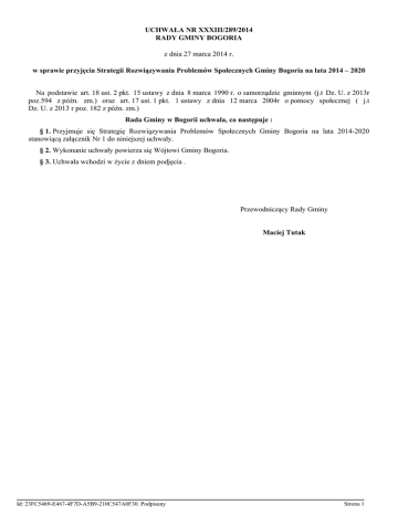 UCHWAŁA NR XXXIII/289/2014 RADY GMINY BOGORIA z dnia 27 marca 2014 r. w sprawie przyjęcia Strategii Rozwiązywania Problemów Społecznych Gminy Bogoria na lata 2014 – 2020 Na podstawie art. 18 ust. 2 pkt. 15 ustawy z dnia 8 marca 1990 r. o samorządzie gminnym (j.t Dz. U. z 2013r poz.594 z późn. zm.) oraz art. 17 ust. 1 pkt. 1 ustawy z dnia 12 marca 2004r o pomocy społecznej ( j.t Dz. U. z 2013 r poz. 182 z późn. zm.) Rada Gminy w Bogorii uchwala, co następuje : § 1. Przyjmuje się Strategię Rozwiązywania Problemów Społecznych Gminy Bogoria na lata 2014-2020 stanowiącą załącznik Nr 1 do niniejszej uchwały. § 2. Wykonanie uchwały powierza się Wójtowi Gminy Bogoria. § 3. Uchwała wchodzi w życie z dniem podjęcia . Przewodniczący Rady Gminy Maciej Tutak Id: 23FC5469-E467-4F7D-A5B9-210C547A0F30. Podpisany Strona 1 Załącznik Nr 1 do Uchwały Nr XXXIII/289/2014 Rady Gminy Bogoria z dnia 27 marca 2014 roku Strategia Rozwiązywania Problemów Społecznych Gminy Bogoria na lata 2014-2020 Id: 23FC5469-E467-4F7D-A5B9-210C547A0F30. Podpisany Strona 1 SPIS TREŚCI I. Wstęp 3 II. Podstawa prawna systemu pomocy społecznej w Polsce 5 III. Diagnoza sytuacji społecznej 7 3.1. Charakterystyka Gminy Bogoria 7 3.2. Problemy społeczne w gminie 9 3.3. Proces rozwiązywania problemów społecznych 14 3.4. Identyfikacja podstawowych problemów społecznych 15 IV. V. Opis głównych problemów w zakresie polityki społecznej 16 4.1. Bezrobocie 16 4.1.1 Skutki pozostawania bez zatrudnienia 18 4.2. Bezdomność 20 4.3. Problemy społeczno-wychowawcze rodzin 21 4.4. Alkoholizm 23 4.4.1 Społeczne skutki nadużywania alkoholu 23 4.5. Niepełnosprawność – charakterystyka problematyki i społeczne skutki 25 4.6 Problemy narkomanii i uzależnień 27 4.7 Przestępczość oraz przestępczość nieletnich 28 Podstawowe cele „Strategii Rozwiązywania Problemów Społecznych 29 w Gminie Bogoria” VI. Program rozwiązywania problemów społecznych w Gminie Bogoria 30 6.1 Przeciwdziałanie bezrobociu 30 6.2 Przeciwdziałanie bezdomności 32 6.3 Pomoc na rzecz rodzin i dzieci z problemami opiekuńczo- 33 wychowawczymi VII. 6.4 Pomoc na rzecz osób dotkniętych problemem alkoholowym 33 6.5 Pomoc na rzecz osób niepełnosprawnych 35 6.6 Zapobieganie narkomanii 36 6.7 Zapobieganie przestępczości i przestępczości nieletnich 36 Podmioty zaangażowane w realizację Strategii 37 7.1 System monitorowania Strategii 37 VIII. Finansowanie Strategii 39 IX. 39 Oczekiwane wskaźniki realizacji Strategii Rozwiązywania Problemów Społecznych X. Wnioski i uwagi końcowe 39 2 Id: 23FC5469-E467-4F7D-A5B9-210C547A0F30. Podpisany Strona 2 I. Wstęp Strategia Rozwiązywania Problemów Społecznych Gminy Bogoria na lata 2014-2020 to dokument, którego przyjęcie jest ustawowym obowiązkiem Gminy wynikającym z treści art. 17 ust.1, pkt. 1 ustawy z dnia 12 marca 2004r. o pomocy społecznej , która przekazuje realizację zadań z zakresu polityki społecznej wynikających z polityki regionalnej Unii Europejskiej. Przed instytucjami pomocy społecznej na poziomie lokalnym stoją trudne do rozwiązania problemy społeczne bez zaspokojenia których społeczeństwo nie może sprawnie funkcjonować. Chodzi tu o takie potrzeby z obszaru życia społecznego jak: przeciwdziałanie wykluczeniu społecznemu, ochrona zdrowia, bezpieczeństwo, edukacja, praca, pomoc społeczna, profilaktyka uzależnień. Rozwiązywanie tych problemów jest procesem długofalowym, należy więc strategicznie podejść do problemów społecznych również na poziomie lokalnym. Celowym jest zdiagnozowanie problemów społecznych występujących w Gminie Bogoria i wytyczenie strategicznych kierunków w „Strategii Rozwiązywania Problemów Społecznych”. Przedstawione w strategii podejście do problemów sfery społecznej pozwala zminimalizować niekorzystne zjawiska związane ze sferą ubóstwa. Realizacja zadań pomocy społecznej wymaga wypracowania niekonwencjonalnych form pracy, profesjonalnego i systematycznego diagnozowania problemów społecznych w gminie. Opracowana strategia problemów społecznych pozwala na rozszerzenie i pogłębienie form pomocy socjalnej, współpracę z różnymi instytucjami i organizacjami pozarządowymi zajmującymi się pomocą społeczną w gminie oraz instytucjami działającymi w szerszym obszarze polityki społecznej np. na szczeblu powiatowym. W ujęciu strategicznym, pomoc społeczna nie koncentruje się wyłącznie na wspieraniu potrzebujących pomocą materialną lecz na: - wypracowaniu lokalnego systemu reintegracji społecznej i zawodowej dla osób z problemami społecznymi przy współpracy z instytucjami i organizacjami społecznymi, - systematycznemu wdrażaniu modelu pomocy zintegrowanej, - wzmacnianiu postaw aktywnych. Ważną rolę w modelu strategicznym pomocy społecznej odgrywa również system wsparcia psychologicznego poradnictwa w rozwiązywaniu problemów indywidualnych profesjonalnej pracy socjalnej, zważywszy fakt, że problemy społeczne i nie są cechą 3 Id: 23FC5469-E467-4F7D-A5B9-210C547A0F30. Podpisany Strona 3 pojedynczych osób lecz całych środowisk. Takie postrzeganie negatywnych zjawisk pozwala na strategiczne rozwiązywanie problemów społeczności lokalnej. Podejście strategiczne (systemowe) jest szansą na skuteczne wyłączenie osób z systemu pomocy społecznej w wyniku ich reintegracji zawodowej. Systemowe rozwiązania w funkcjonowaniu pomocy społecznej dają szansę następnemu pokoleniu na samodzielne funkcjonowanie bez korzystania z systemu pomocy społecznej. Najczęstsze trudności jakie występują w rodzinach w dziedzinie pomocy społecznej są związane z: - bezradnością w prowadzeniu gospodarstwa domowego szczególnie w rodzinach wielodzietnych i z osobami niepełnosprawnymi, - trudnymi warunkami materialnymi w rodzinach z długotrwałym bezrobociem (konflikty wewnątrzrodzinne), - przewlekłymi chorobami, - przemocą fizyczną i psychiczn