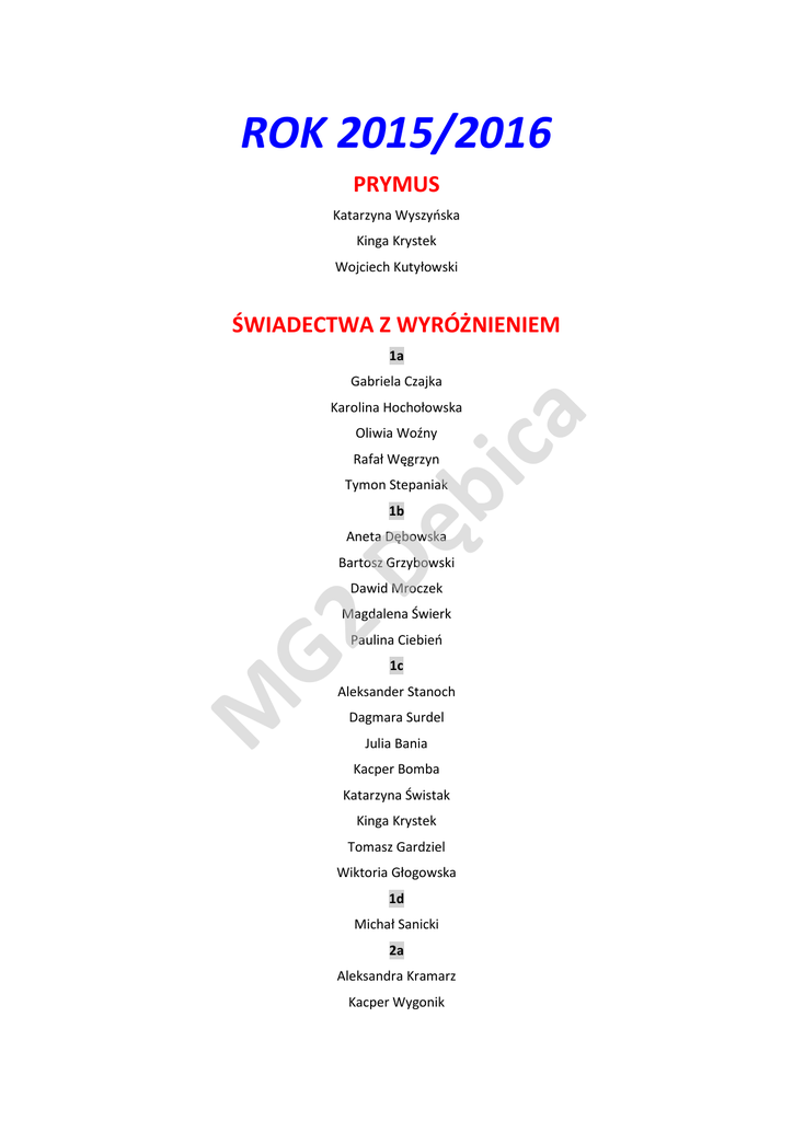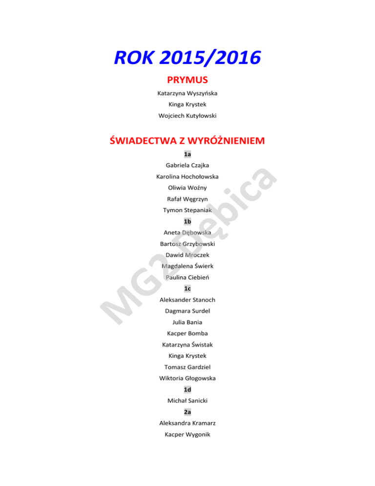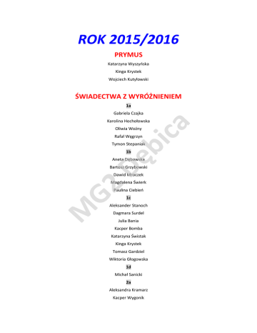 ROK 2015/2016 PRYMUS Katarzyna Wyszyńska Kinga Krystek Wojciech Kutyłowski ŚWIADECTWA Z WYRÓŻNIENIEM 1a Gabriela Czajka Dę bi ca Karolina Hochołowska Oliwia Woźny Rafał Węgrzyn Tymon Stepaniak 1b Aneta Dębowska Bartosz Grzybowski Dawid Mroczek M G2 Magdalena Świerk Paulina Ciebień 1c Aleksander Stanoch Dagmara Surdel Julia Bania Kacper Bomba Katarzyna Świstak Kinga Krystek Tomasz Gardziel Wiktoria Głogowska 1d Michał Sanicki 2a Aleksandra Kramarz Kacper Wygonik Kaja Kaput Karolina Michno Nikoletta Vasilev Piotr Wadas Tomasz Starostka Weronika Szewczyk 2b Estera Bąk Julia Bielawa Kamil Jugo Karolina Wójtowicz Katarzyna Szlachetka Dę bi ca Marianna Wacko Oliwia Kamińska Sara Wójcik Wiktoria Niemiec 2c Jakub Skóra Jakub Stelmach 2d M G2 Gabriela Lesiak Julia Kiebała Julia Koziańska Kamil Maduzia Krzysztof Malata Marlena Gancarz Natalia Janiec Piotr Czernicki Wiktoria Grych Wiktoria Więcek Wojciech Kutyłowski 3a Agata Przybyła Aleksandra Grobelny Aleksandra Sadok Anna Szyszka Eliza Pijar Gabriela Florka Gabriela Radzik Jakub Czapla Karolina Małozięć Katarzyna Wyszyńska Magdalena Kasowicz Paulina Kasowicz 3b Kinga Książek Wiktoria Gawlik 3c Dę bi ca Aleksandra Skrzypiec Michał Posłuszny Paulina Więcek M G2 Paweł Zborowski ROK 2014/2015 Sylwia Knych PRYMUS Mateusz Kolak Tomasz Starostka Wojciech Kutyłowski ŚWIADECTWA Z WYRÓŻNIENIEM 1a Aleksandra Kramarz Dę bi ca Julia Jarosz Kacper Wygonik Karolina Michno Nikoletta Vasilev Tomasz Starostka Weronika Szewczyk 1b Estera Bąk M G2 Julia Bielawa Karolina Wójtowicz Katarzyna Szlachetka Marianna Wacko Martyna Soprych Sara Wójcik Wiktoria Niemiec 1c Jakub Skóra Jakub Stelmach 1d Dawid Surdel Gabriela Lesiak Julia Kiebała Julia Koziańska Kamil Maduzia Krzysztof Malata Marlena Gancarz Natalia Janiec Piotr Czernicki Wiktoria Grych Wiktoria Więcek Wojciech Kutyłowski 2a Agata Przybyła Aleksandra Grobelny Aleksandra Sadok Anna Szyszka Dę bi ca Eliza Pijar Gabriela Florka Gabriela Radzik Jakub Czapla Karolina Małozięć Katarzyna Wyszyńska Magdalena Kasowicz M G2 Paulina Kasowicz 2b Kinga Książek Wiktoria Gawlik 2c Aleksandra Skrzypiec Michał Posłuszny Paweł Zborowski 3a Agata Ziobroń Aleksandra Nowacka Damian Mazur Kinga Godawska Klaudia Krzyś Magdalena Wolak Marcelina Żybura Marcin Malata Mateusz Kolak Patrycja Kraj Sara Maduzia Tomasz Grzybowski Wiktoria Śliwa 3b Aleksandra Buczak Aleksandra Mądro Filip Musiał Gerard Wójtowicz Konrad Petryk Martyna Flankowska Dę bi ca Mateusz Sobecki Michał Buczek Michał Mroczek Paweł Szlachta 3c Aleksandra Tarnopolska Kamila Zięba M G2 Klaudia Korczyńska ROK 2013/2014 PRYMUS Ewelina Golonka Katarzyna Wójtowicz ŚWIADECTWA Z WYRÓŻNIENIEM 1a Agata Przybyła Aleksandra Grobelny Aleksandra Sadok Dę bi ca Anna Szyszka Anna Wójcik Eliza Pijar Gabriela Florka Gabriela Radzik Jakub Czapla Karolina Małozięć Katarzyna Wyszyńska M G2 Magdalena Kasowicz Paulina Kasowicz 1b Kinga Książek Wiktoria Gawlik 1c Aleksandra Skrzypiec Paweł Zborowski 2a Agata Ziobroń Kinga Godawska Magdalena Wolak Marcin Malata Mateusz Kolak Sara Maduzia Tomasz Grzybowski 2b Aleksandra Mądro Filip Musiał Gerard Wójtowicz Martyna Flankowska Mateusz Sobecki Michał Mroczek Paweł Szlachta 2c Kamila Zięba 3a Aleksandra Ożóg Dę bi ca Daniel Sikora Ewelina Golonka Gabriela Bizoń Gabriela Depowska Jan Kusek Katarzyna Wójtowicz Kinga Zwierzyk Klaudia Strózik M G2 Klaudia Włoch Mateusz Chruściel Piotr Cebula 3b Aleksandra Owsiak Dagmara Lesiak Dorian Kraj Iwona Rudka Jędrzej Miś Kaja Zygmunt Karolina Łoch Klaudia Woźny Magdalena Kołodziej Maksymilian Wójtowicz Wojciech Szutryk 3c Claudia Pociask Patrycja Ozimek 3d M G2 Dę bi ca Aneta Muniak ROK 2012/2013 PRYMUS Jan Krasnoid Katarzyna Wójtowicz Mateusz Kolak Sylwia Mazur ŚWIADECTWA Z WYRÓŻNIENIEM 1a Bartosz Jeniec Dę bi ca Kinga Godawska Marcin Malata Mateusz Kolak Piotr Para Sara Maduzia Tomasz Grzybowski 1b Aleksandra Buczak M G2 Aleksandra Mądro Filip Musiał Izabela Zygmunt Michał Mroczek Paweł Szlachta 1c Aleksandra Siry Aleksandra Tarnopolska Kamila Zięba 2a Ewelina Golonka Gabriela Depowska Jan Kusek Katarzyna Wójtowicz Kinga Zwierzyk Klaudia Strózik Mateusz Chruściel 2b Dagmara Lesiak Dorian Kraj Iwona Rudka Jędrzej Miś Kaja Zygmunt Karolina Łoch 2c Claudia Pociask Patrycja Ozimek 3a Dę bi ca Jakub Koczur Jan Krasnoid Karolina Krok Klaudia Wróbel Małgorzata Gardziel Michał Mikuła Michał Puźniak Monika Stawarz M G2 Natalia Szukała Patryk Roman Piotr Gawle Rafał Chajec Sylwia Mazur 3b Mariusz Fleszar Norbert Acedański Sabina Śliwa 3c Anna Kania Iwona Duźniak Katarzyna Petyniak Mateusz Matysek Monika Grabowska Roland Lombara Weronika Soboń 3e Jakub Fołta M G2 Dę bi ca Oliwia Rojowska ROK 2011/2012 PRYMUS Ewelina Golonka Joanna Socha Natalia Ruda ŚWIADECTWA Z WYRÓŻNIENIEM 1a Aleksandra Ożóg Daniel Sikora Dę bi ca Ewelina Golonka Gabriela Depowska Jan Kusek Katarzyna Wójtowicz Kinga Zwierzyk Klaudia Strózik Klaudia Włoch 1b M G2 Aleksandra Owsiak Dorian Kraj Jędrzej Miś Kaja Zygmunt Karolina Łoch Marek Piękoś 1c Claudia Pociask Patrycja Ozimek 2a Jakub Erazmus Jakub Koczur Jan Krasnoid Karolina Krok Klaudia Wróbel Małgorzata Gardziel Michał Mikuła Monika Stawarz Natalia Szukała Patryk Roman Piotr Gawle Sylwia Mazur 2b Mariusz Fleszar Norbert Acedański Sabina Śliwa 2c Iwona Duźniak Dę bi ca Roland Lombara 3a Kamil Kawa Klaudia Ciuła Magdalena Pelc Patrycja Bielatowicz Patrycja Bogdan Patrycja Szpak M G2 Sylwia Kasprzyk 3b Agnieszka Susz Gabriela Stawarz Jessica Medygrał Joanna Strzałka Kamila Brandys Kinga Kopeć Maria Prucnal Monika Szajgin Natalia Bielatowicz Natalia Ruda Patrycja Węgrzyn Paulina Malinowska 3c Anna Gruba Dawid Nauka Jakub Czuchra Joanna Socha Kinga Żegleń Klaudia Skóra Michał Jasek Michał Litwin Norbert Szczerbiński Patrycja Gierlicka Rafał Klabacha Rafał Krzyś 3d Dę bi ca Aleksandra Duda Kamil Kryczka Karolina Pietrasik Sylwia
