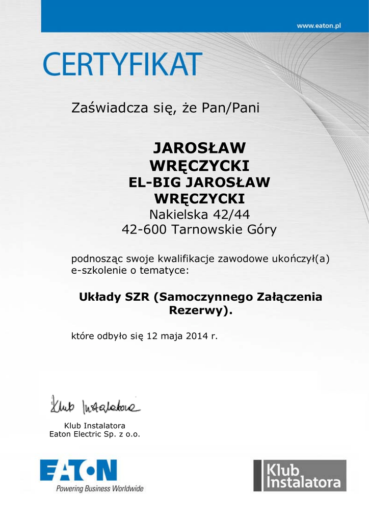 Zaświadcza się, że Pan/Pani JAROSŁAW WRĘCZYCKI EL-BIG JAROSŁAW WRĘCZYCKI Nakielska 42/44 42-600 Tarnowskie Góry podnosząc swoje kwalifikacje zawodowe ukończył(a) e-szkolenie o tematyce: Układy SZR (Samoczynnego Załączenia Rezerwy). które odbyło się 12 maja 2014 r. Klub Instalatora Eaton Electric Sp. z o.o.