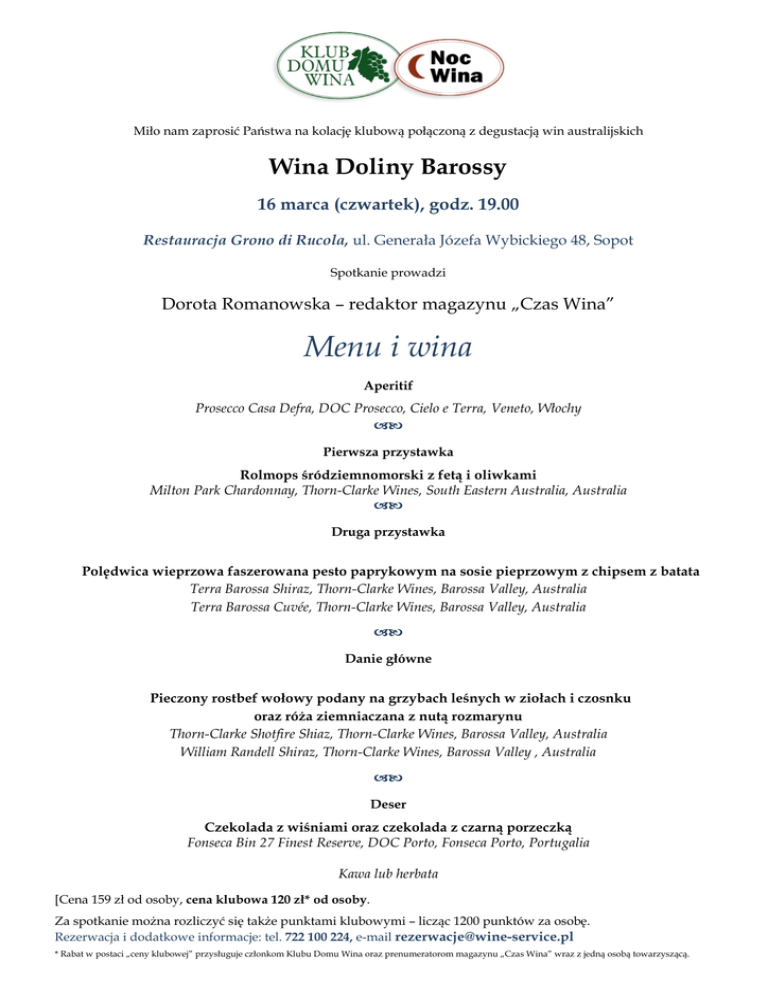 Miło nam zaprosić Państwa na kolację klubową połączoną z degustacją win australijskich Wina Doliny Barossy 16 marca (czwartek), godz. 19.00 Restauracja Grono di Rucola, ul. Generała Józefa Wybickiego 48, Sopot Spotkanie prowadzi Dorota Romanowska – redaktor magazynu „Czas Wina” Menu i wina Aperitif Prosecco Casa Defra, DOC Prosecco, Cielo e Terra, Veneto, Włochy Pierwsza przystawka Rolmops śródziemnomorski z fetą i oliwkami Milton Park Chardonnay, Thorn-Clarke Wines, South Eastern Australia, Australia Druga przystawka Polędwica wieprzowa faszerowana pesto paprykowym na sosie pieprzowym z chipsem z batata Terra Barossa Shiraz, Thorn-Clarke Wines, Barossa Valley, Australia Terra Barossa Cuvée, Thorn-Clarke Wines, Barossa Valley, Australia Danie główne Pieczony rostbef wołowy podany na grzybach leśnych w ziołach i czosnku oraz róża ziemniaczana z nutą rozmarynu Thorn-Clarke Shotfire Shiaz, Thorn-Clarke Wines, Barossa Valley, Australia William Randell Shiraz, Thorn-Clarke Wines, Barossa Valley , Australia Deser Czekolada z wiśniami oraz czekolada z czarną porzeczką Fonseca Bin 27 Finest Reserve, DOC Porto, Fonseca Porto, Portugalia Kawa lub herbata [Cena 159 zł od osoby, cena klubowa 120 zł* od osoby. Za spotkanie można rozliczyć się także punktami klubowymi – licząc 1200 punktów za osobę. Rezerwacja i dodatkowe informacje: tel. 722 100 224, e-mail [email protected] * Rabat w postaci „ceny klubowej” przysługuje członkom Klubu Domu Wina oraz prenumeratorom magazynu „Czas Wina” wraz z jedną osobą towarzyszącą.