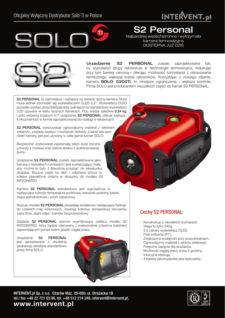 Oficjalny Wyłączny Dystrybutor Solo Ti w Polsce S2 Personal Najbardziej wszechstronna i wytrzymała kamera termowizyjna DOSTĘPNA JUŻ DZIŚ Urzadzenie S2 PERSONAL zostało zaprojektowane tak, by wyposażyć grupy ratownicze w technologie termowizyjna, redukując przy tym barierę cenową i oferując możliwość korzystania z obrazowania termicznego większej liczbie ratowników. Korzystajac z nowego rdzenia, kamera SOLO 5200Ti, to mniejsze ograniczenia i większa kontrola. Firma SOLO jest producentem wszystkich części do kamer S2 PERSONAL. S2 PERSONAL to najmniejsza i najlżejsza na świecie ręczna kamera, która może jednak pochwalić się wyświetlaczem OLED 3,5’’. Wyświetlacz OLED pozwala uzyskać obraz bardziej ostry i jaśniejszy niż standardowy wyświetlacz LCD używany w wielu ręcznych kamerach. Przy wadze zaledwie 0,54 kg i polu widzenia liczącym 51° urządzenie S2 PERSONAL oferuje większą funkcjonalność w formie zaprojektowanej do obsługi w rękawicach. S2 PERSONAL wykorzystuje ognioodporny materiał z włóknem szklanym, posiada zasilacz i możliwość blokady, a także taki sam rdzeń kamery, jaki jest używany w całej gamie kamer SOLO. Bezpieczne użytkowanie zapewniają także duże boczne uchwyty z nomexu oraz osłona ekranu z wulkanizowanej gumy. Urządzenie S2 PERSONAL zostało zaprojektowane jako kamera o niewielkich rozmiarach i jest wystarczająco mała, aby można je było z łatwością przypiąć do ekwipunku strażaka. Boczne paski na dłoń i odpinana smycz to kolejne zewnętrzne zmiany w stosunku do modelu S2 INTEGRATED. Kamera S2 PERSONAL standardowo jest wyposażona w następujące funkcje: temperatura punktowa, wskaźnik poziomu baterii, mapa jednokolorowa i zoom całościowy. Wyższe modele S2 PERSONAL posiadają dodatkowo następujące funkcje: do czterech map kolorowych, inwersja kolorów, temperatura otoczenia, zapis filów, zapis zdjęć i transfer bezprzewodowy. Zasilanie S2 PERSONAL stanowi wypróbowany zasilacz modelu S2 INTEGRATED, który będzie oferowany z maksymalnie czterema bateriami zapewniającymi ponad osiem godzin ciągłej pracy. Urządzenie S2 PERSONAL jest sprzedawane z dwuletnią gwarancją udzielaną standardowo przez firmę SOLO. INTERVENT.pl Sp. z o.o. Ożarów Maz. 05-850, ul. Strażacka 1B tel./ fax +48 22 721 03 66, tel. +48 512 214 248, [email protected], www.intervent.pl Cechy S2 PERSONAL: ∙∙ ∙∙ ∙∙ ∙∙ ∙∙ ∙∙ ∙∙ ∙∙ ∙∙ ∙∙ Konstrukcja o niewielkich rozmiarach. Waga to tylko 540g. 3.5 calowy wyświetlacz OLED. Pole widzenia (51°). Zwiększona wydajność przy poszukiwaniach. Ognioodporny materiał z włókna szklanego. Poręczne zapięcie dla strażaków. Możliwość ciągłej pracy przez 2 godziny. Intuicyjna obsługa. 4 baterie (akumulatorki) plus ładowarka. Oficjalny Wyłączny Dystrybutor Solo Ti w Polsce Rdzeń kamery Specyfikacja techniczna Charakterystyka ogólna Dane modułu optycznego Czas uruchomienia < 5 s Krótki zakres: Bezpośredni pomiar temperatury ze wskaźnikiem celownika w celu wskazania obszaru pomiaru Materiał: german (germanium) Pomiar temperatury otoczenia Możliwość programowania kolorów obrazu Zoom cyfrowy 2x i 4x Wskaźnik poziomu naładowania baterii Możliwość zmiany ekranu startowego Kompatybilne z USB 2.0 Ogniskowa: 6,48mm Pole widzenia: 510 Stała odległość ostrości od 1 metra do nieskończoności Długi zakres: Pole widzenia: 110 Ręczne ustawianie ostrości Przysłona f / 1,0 Przyjazny interfejs graficzny służący do konfiguracji sprzętu Moduł wideo Format zapisu odpowiednio dla NTSC/PAL (30/25fps), zgodny ze standardem PAL (używanym w unii europejskiej) Gniazdo wideo (cincz) Ręczne ustawienia kolorów przez użytkownika z mapowaniem w zakresach temperatury bezwzględnej Nałożenie graficzne Zaawansowana obróbka obrazu Rozdzielczość wyjściowa 640x480 pixeli Sprzęt zgodny z przechwytywaniem poszczególnych klatek Sprzęt zgodny z przechwytywaniem sygnału wideo Czujnik 35μm odstęp pomiędzy pikselami Czułość termiczna < 50 mK (< 0,050C) Amorficzny krzemowy detektor bolometryczny Obrazowanie FPA 160 x 120 Odpowiedź widma 7-14μm Właściwości fizyczne Temperatura pracy: od -200C do 850C Temperatura przechowywania: od -400C do 1050C Saturacja (nasycenie) termiczna: 6000C Przetwarzanie w czasie rzeczywistym Ustawienia migawki wprowadzane przez użytkownika Moduł pamięci Gniazdo na kartę micro SD Wbudowana pamięć SRAM 2 x 8MB Moduł zasilania Napięcie pracy 2,7 do 12 V Tryb pojedynczego i wielokrotnego ogniwa Dane techniczne mogą ulec zmianie bez powiadomienia. INTERVENT.pl Sp. z o.o. Ożarów Maz. 05-850, ul. Strażacka 1B tel./ fax +48 22 721 03 66, tel. +48 512 214 248, [email protected], www.intervent.pl