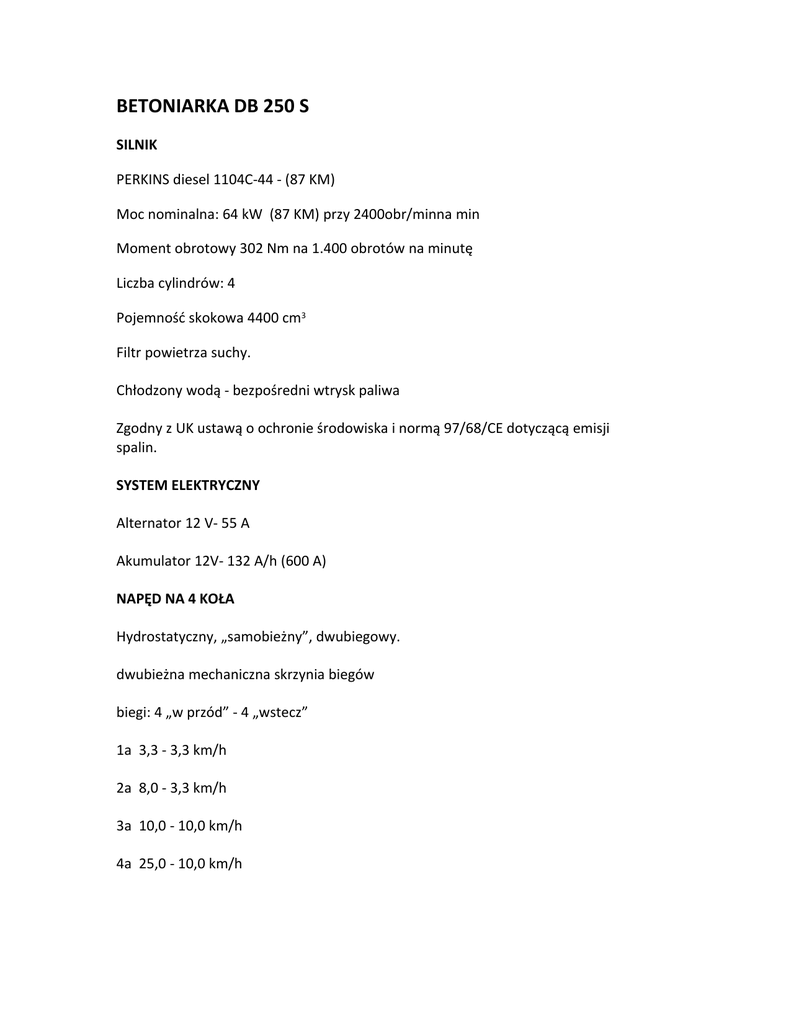 BETONIARKA DB 250 S SILNIK PERKINS diesel 1104C-44 - (87 KM) Moc nominalna: 64 kW (87 KM) przy 2400obr/minna min Moment obrotowy 302 Nm na 1.400 obrotów na minutę Liczba cylindrów: 4 Pojemność skokowa 4400 cm3 Filtr powietrza suchy. Chłodzony wodą - bezpośredni wtrysk paliwa Zgodny z UK ustawą o ochronie środowiska i normą 97/68/CE dotyczącą emisji spalin. SYSTEM ELEKTRYCZNY Alternator 12 V- 55 A Akumulator 12V- 132 A/h (600 A) NAPĘD NA 4 KOŁA Hydrostatyczny, „samobieżny”, dwubiegowy. dwubieżna mechaniczna skrzynia biegów biegi: 4 „w przód” - 4 „wstecz” 1a 3,3 - 3,3 km/h 2a 8,0 - 3,3 km/h 3a 10,0 - 10,0 km/h 4a 25,0 - 10,0 km/h OSIE Przednia: nośna, oscylująca (+/- 7, 5 ş) planetarny napęd końcowy na piastach kół. Tylna: oś nośna, z planetarnym napędem końcowym na piastach kół HAMULCE OBSŁUGA I HAMULCE BEZPIECZEŃSTWA: Hydrauliczne hamulce tarczowe umieszczone wewnątrz piast, oddziaływujące na 4 koła, zasilane dwustopniową pompą hamulcową w niezależnym bliźniaczym obiegu, hamulec ze wspomaganiem PARKOWANIE: hamulec tarczowy na przedniej osi; regulacja mechaniczna OPONY Przednie i tylne: 16,0/70-20 STEROWANIE Samowspomagane napęd oddziaływujący na 2 siłowniki hydrauliczne Min. wewnętrzny promień skrętu koła: 2300mm PODWOZIE Podwozie stalowe o wysokiej odporności ST52 Max. wysokość zbiornika wyładunkowego: 1.800 mm Max wysokość rynny wyładunkowej: 1.460 mm Minim. wysokość rynny wyładunkowej: 1.320mm KABINA Otwarta z zabezpieczeniem typu ROPS - FOPS; obrotowe (180ş) stanowisko operatora. Światła i kierunkowskazy SYSTEM HYDRAULICZNY Pompa biegowa - 5-stronny mechanizm regulujący i aluminiowa chłodnica oleju Maks. tempo przepływu: 47 l/1 min. Maks. ciśnienie: 180 bar INSTALACJA WODNA szybkossąca wirnikowa pompa wodna Maks. tempo przepływu: 300 l/min - Maks. ciśnienie: 2,0 bar Pojemność zbiornika: 580 l- Regulacja pompy wodnej umieszczona w kabinie i z poziomu gruntu Automatyczna blokada pompy w razie braku wody. BĘBEN Bęben obracany napędem hydrostatycznym z pompą o zróżnicowanym przepływie i elektrohydrauliczną kontrolą umieszczoną w kabinie, jak i z tyłu maszyny. Usztywnienie zamontowane na walcu płyty centralnej typu Heavy-Duty (do pracy w trudnych warunkach) z automatyczną blokadą z możliwością hydraulicznego obracania 240ş Prędkość obrotu bębna: 0 - 21 obr/min. Pojemność bębna: 3150 l Maks. uzysk betonu: 2500 l Przedłużenie rynny wyładunkowej CZERPAK ŁADUJĄCY Pojemność 550 l Liczba kubłów wymaganych do jednorazowego załadunku 7 POJEMNOŚCI EKSPLOATACYJNE Zbiornik paliwa: 80 l Zbiornik oleju hydraulicznego: 100 l CIĘŻAR masa urządzenia 5150 Max masa 11100 kg Dozwolona masa przewożonego ładunku5950 kg