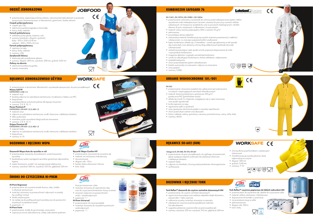 ODZIEŻ JEDNORAZOWA KOMBINEZON SAFEGARD 76 L A K E L A N D I N D U S T R I E S E U R O P E LT D • przeznaczenie: zapewniają ochronę odzieży i obuwia przed zabrudzeniem w przemyśle spożywczym, farmaceutycznym, w laboratoriach, gastronomii, służbie zdrowia Czepek polipropylenowy • czepek typu Clip • zakończony gumką ściągniętą w harmonijkę • kolory: biały, niebieski Fartuch polietylenowy • zakładany przez głowę, wiązany z tyłu • wymiary (szerokość x długość x grubość): biały – 810 x 1250 x 0,18 mm niebieski – 850 x 1500 x 0,3 mm Fartuch polipropylenowy • zapinany na napy • kolory: biały, niebieski • rozmiary: L-XXL Zarękawek foliowy • doskonały jako przedłużenie rękawic • wymiary: długość: 400 mm, szerokość: 200 mm, grubość: 0,02 mm Osłony na obuwie • zakończone praktyczną gumką • rozmiar uniwersalny EN 1149-1, EN 1073-2, EN 13982-1, EN 13034 RĘKAWICE JEDNORAZOWEGO UŻYTKU UBRANIE WODOOCHRONNE 101/001 • przeznaczenie: w lecznictwie, laboratoriach, w przemyśle spożywczym, do prac porządkowych. Nimex Soft PF EN 343 KATEGORIA I; AQL 1,5 • materiał: nitryl • bardziej odporne na uszkodzenia mechaniczne, niż rękawice z lateksu czy PVC • bezpudrowe • posiadają fakturę na końcach palców dla lepszej chwytności • rozmiary: 7, 8, 9, 10, 11 Pevex Premium P KATEGORIA I; EN 455 1,2,3; AQL 1,5 • materiał: winyl • odporne na uszkodzenia mechaniczne, środki chemiczne o delikatnym działaniu • lekko pudrowane • minimalne ryzyko wywołanie alergii podczas stosowania • rozmiary: 7, 8, 9, 10, 11 Gripex Premium PF • przeznaczenie: stosowany w przemyśle do ochrony przed niebezpiecznymi pyłami i lekkim opryskaniem mało niebezpiecznymi cieczami; używany do prac przy usuwaniu włókien azbestowych, ich transporcie i przeładunku oraz w procesach metalurgicznych i obróbki drewna; do prac związanych z odkażaniem i oczyszczaniem • materiał: cztery warstwy polipropylenu SMS o wartości 55 g/m2 • jednorazowy • pozwalający skórze oddychać • zastosowany materiał charakteryzuje się wysokim stopniem przewiewności, miękkości i elastyczności, co znacząco poprawia komfort użytkowania • kaptur kombinezonu składa się z 3 kawałków – został zaprojektowany w taki sposób, aby można było nosić elementy ochrony dróg oddechowych (półmaski lub maski całotwarzowe) • wstawka poszerzająca część spodni w kroku poprawia dopasowanie do ciała i wytrzymałość kombinezonu • ściągacze rękawów i nogawek uszczelniają kombinezon • suwak na całej długości kombinezonu ułatwia wkładanie i zdejmowanie • antyelektrostatyczny • chroni przed skażeniem pyłami radioaktywnymi • bardzo wytrzymały na rozerwanie i odporny na zniszczenia • szwy spajane • rozmiary: S-XXXL • przeznaczenie: stosowane wszędzie tam, gdzie praca jest wykonywana w trudnych i niesprzyjających warunkach atmosferycznych • materiał: dzianina poliestrowa o gramaturze 350 g/m2, powleczona PVC (polichlorkiem winylu) • składa się z kurtki ¾ z kapturem, ściągającym się w części twarzowej oraz spodni ogrodniczek • kurtka zapinana na napy • regulowane szelki w spodniach • szwy zgrzewane obustronnie prądem o wysokiej częstotliwości • chroni przed silnym wiatrem oraz deszczem • kolory: niebieski, zielony, granatowy, czerwony, pomarańczowy, czarny, żółty, biały • rozmiary: 48-62 KATEGORIA I; EN 455 1,2,3; AQL 1,5 • • • • materiał: lateks odporne na uszkodzenia mechaniczne, środki chemiczne o delikatnym działaniu bezpudrowe rozmiary: 6–10 RĘKAWICE 50-602 (SUN) DOZOWNIK I RĘCZNIKI WEPA Dozownik Wepa Auto do ręcznika w roli • przeznaczenie: stosowany do podawania i przechowywania ręczników • bezdotykowy system wyciągania ręczników gwarantuje odpowiednią higienę • system dozowania „autake” nie wymaga energii elektrycznej • wymiary: szerokość 368 mm, wysokość 350 mm, głębokość 220 mm Ręczniki Wepa Comfort HT • przeznaczenie: stosowane do osuszania rąk • materiał: mix celulozowo makulaturowy • dwuwarstwowe • długość rolki: 130 m • bardzo dobre właściwości chłonne • kolor: biały Kategoria III, EN 388, EN 374, EN 421 • przeznaczenie: do prac porządkowych, do ogólnego stosowania tam, gdzie występuje wilgotne środowisko lub substancje chemiczne o delikatnym działaniu • materiał: lateks • odporne na chemikalia, chronią przed przenikaniem mikroorganizmów • są flokowane • chronią dłonie przed kontaktem z substancjami chemicznymi • charakteryzują się wysoką jakością i dużą odpornością na zużycie • długość: 300 mm • grubość: 0,42 mm • rozmiary: 7–10 1010 ŚRODKI DO CZYSZCZENIA HI-PREM Hi-Prem Degreaser • przeznaczenie: do usuwania resztek tłuszczu, oleju i białka w obszarze spożywczym • może być stosowany na powierzchniach odpornych na zasady (np. podłogi i ściany) • działa antykorozyjnie • nie nadaje się do podłóg pokrytych powłoką oraz do powierzchni wrażliwych na działanie zasad • pojemność: 1 l Hi-Prem Forte • przeznaczenie: środek do gruntownego czyszczenia • rozpuszcza mocne zabrudzenia np. sadzę, zabrudzenia spalinami, tłuszcze maszynowe i oleje • może być stosowany do separatorów oleju oraz do czyszczenia kontenerów i koszy na śmieci • stosować wyłącznie na powierzchniach wodo- i zasadoodpornych • pojemność: 1 l Hi-Prem Universal • przeznaczenie: do mycia posadzek • może być stosowany do wszystkich powierzchni wodoodpornych • pojemność: 1 l DOZOWNIK I RĘCZNIKI TORK Tork Reflex™ dozownik do czyściw centralnie dozowanych M4 • przeznaczenie: do czyściw centralnie dozowanych • ograniczona konsumpcja oraz redukcja odpadów dzięki dozowaniu zawsze tylko 1 listka czyściwa • całkowicie szczelny, może być stosowany na zewnątrz • zabezpiecza czyściwo przed przypadkowym zalaniem lub zabrudzeniem • wyg