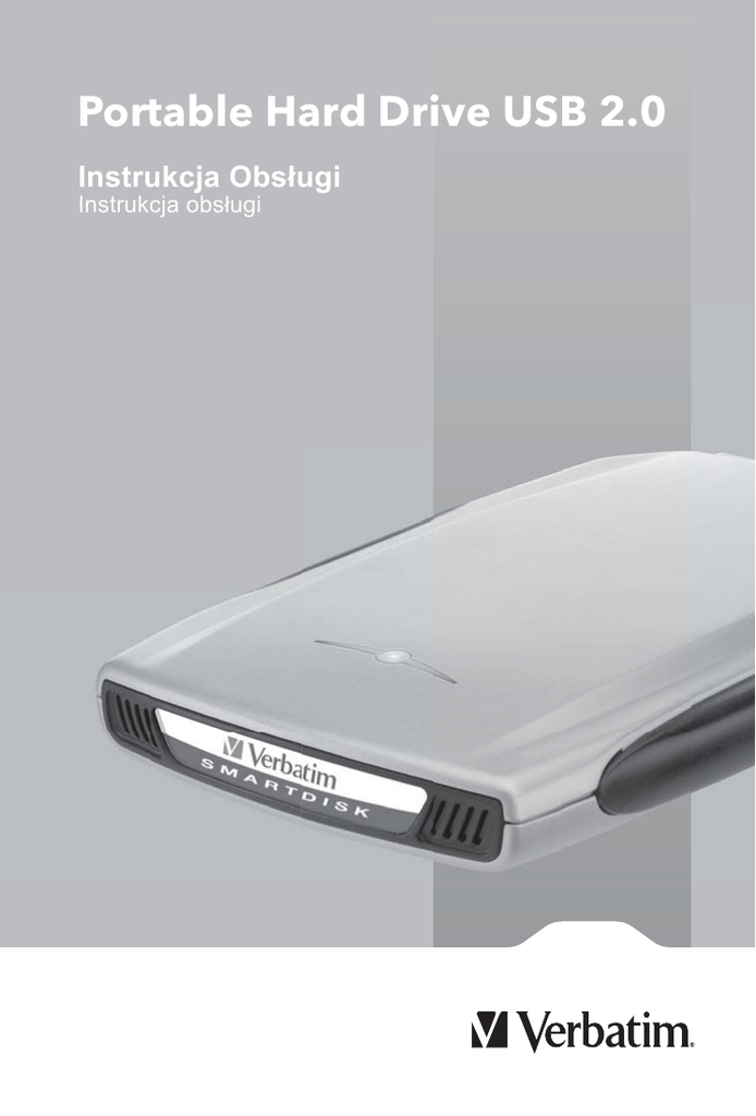 Portable Hard Drive USB 2.0 Instrukcja Obsługi Instrukcja obsługi Przenośny dysk twardy USB 2.0 Podręcznik użytkownika Wersja polska Spis treści Wstęp 3 Podłączanie przenośnego dysku twardego 3 Zasilanie przenośnego dysku twardego 4 Zapisywanie i przesyłanie danych 4 Odłączanie przenośnego dysku twardego 5 Pomoc techniczna 6 Warunki ograniczonej gwarancji 7 Przepisy prawne 8 Zgodność z przepisami FCC 8 Oświadczenie WEEE 9 Deklaracja CE 10 Zgodność z przepisami RoHS 10 Wstęp Dysk twardy jest skomplikowanym elektronicznym urządzeniem pamięci masowej i należy obchodzić się z nim ostrożnie, podobnie jak z komputerem przenośnym lub innym zaawansowanym urządzeniem elektronicznym. Nie należy go narażać na wstrząsy, działanie wysokich temperatur lub silnego pola magnetycznego. Uwaga: Pojemność dysku zależy od modelu. Podawana w gigabajtach pojemność wykrywana przez system może być mniejsza. 1 GB = 1 000 000 000 bajtów. Podłączanie przenośnego dysku twardego Podłączanie przenośnego dysku twardego jest bardzo proste — wystarczy połączyć dysk z komputerem za pomocą dostarczonego w zestawie kabla USB. W systemie Windows w oknie Mój komputer zostanie wyświetlona ikona przedstawiająca przenośny dysk twardy. W systemie Mac OS dysk zostanie wyświetlony na pulpicie jako nowy dysk. W przypadku korzystania z systemu Windows 98 SE należy zainstalować dodatkowe oprogramowanie, dostępne w witrynie firmy Verbatim. Dodatkowe informacje zawiera sekcja Pomoc Techniczna. Jeśli używany jest interfejs USB 1.1 w komputerze, na którym zainstalowano system Windows, może zostać wyświetlone następujące ostrzeżenie: Urządzenie USB HI-SPEED podłączono do koncentratora USB innego typu. Nie stanowi to problemu, ponieważ dysk twardy jest zgodny ze standardem USB 1.1 i USB 2.0. Wystarczy zamknąć okno komunikatu i kontynuować. Dysk twardy będzie jednak przesyłał i odbierał dane z prędkością interfejsu USB 1.1. Jeśli przenośny dysk twardy nie włącza się po podłączeniu, należy sprawdzić ustawienia zasilania. Następny rozdział zawiera dodatkowe informacje na ten temat. Zasilanie przenośnego dysku twardego Źródło zasilania można wybrać za pomocą przełącznika, który umieszczono z tyłu urządzenia. Jeśli przełącznik został ustawiony w pozycji USB (w stronę gniazda USB), dysk będzie zasilany przez port USB. Jeśli przełącznik został ustawiony w pozycji EXT (w stronę gniazda zasilania), dysk będzie zasilany ze źródła zewnętrznego. Niektóre komputery nie mogą zapewnić wystarczającej mocy, żeby zasilać dysk twardy przez port USB — w tym przypadku należy podłączyć zasilacz zewnętrzny. (Jeśli dysk nie może być zasilany przez port USB komputera, będzie wydawał dźwięk „klikania”, a wskaźnik LED będzie migał raz na sekundę.) Zasilacz jest dostępny w ofercie firmy Verbatim. Witryna www.Verbatim-Europe.com zawiera dodatkowe informacje. Uwaga: Należy używać tylko zasilacza firmy Verbatim. Użycie innego zasilacza spowoduje utratę gwarancji i może spowodować obrażenia, uszkodzenie dysku twardego lub utratę danych. Zapisywanie i przesyłanie danych Po podłączeniu przenośnego dysku twardego do komputera można odczytać zapisane na nim dane, podobnie jak w przypadku innych dysków zewnętrznych. Pliki można kopiować, przeciągając je na ikonę dysku twardego, otwierać zawartość dysku w oknach dialogowych Otwórz lub Zapisz, lub usuwać pliki zapisane na przenośnym dysku twardym. Informacje dotyczące kopiowania, otwierania lub usuwania plików zawiera dokumentacja komputera. Odłączanie przenośnego dysku twardego Przenośny dysk twardy można podłączać i odłączać bez konieczności ponownego uruchamiania komputera. Aby odłączyć przenośny dysk twardy w dowolnym momencie, wystarczy wykonać następujące kroki. Dysk można również odłączyć, kiedy komputer jest wyłączony. Uwaga: Należy pamiętać, aby wykonać odpowiednią procedurę podczas odłączania urządzenia. Pominięcie poniższych instrukcji podczas odłączania urządzenia może spowodować uszkodzenie dysku i/lub utratę danych. Użytkownicy systemu Windows: 1 Jeśli pliki znajdujące się na dysku twardym są otwarte w dowolnej aplikacji, zamknij je. 2 Kliknij dwukrotnie ikonę Bezpieczne usuwanie sprzętu na pasku zadań systemu Windows. 3 Wybierz dysk twardy w wyświetlonym menu. 4 Po chwili system Windows wyświetli komunikat, informujący że można bezpiecznie odłączyć sprzęt. Użytkownicy systemu Mac OS: 1 Jeśli pliki znajdujące się na dysku twardym są otwarte w dowolnej aplikacji, zamknij je. 2 Przenieś ikonę dysku znajdującą się na pulpicie do kosza. Pomoc techniczna Jeśli podczas instalowania lub eksploatacji dysku twardego Verbatim wystąpią problemy, należy odwiedzić witrynę pomocy technicznej firmy Verbatim pod adresem www.verbatim.com lub www.verbatim-europe.com. Witryna ta zawiera bibliotekę dokumentacji, odpowiedzi na najczęściej zadawane pytania i najnowsze aktualizacje oprogramowania. Dla większości naszych klientów informacje te będą wystarczające do rozwiązania problemów, ale na stronie znajdują się również numery telefonów zespołu pomocy technicznej firmy Verbatim. USA/Kanada 800-538-8589 Meksyk (55) 55284642 Argentyna (54-11) 4943-3336 Europa: W Europie pomoc techniczną można uzyskać za pośrednictwem poczty e-mail, wysyłając wiadomość na adres [email protected] lub telefonicznie, pod numerem 00 800 3883 2222, dla następujących krajów: Austria, Belgia, Dania, Finlandia, Francja, Niemcy, Węgry, Włochy, Luksemburg, Monako, Holandia, Norwegia, Polska, Portugalia, Irlandia, Hiszpania, Szwecja i Szwajcaria. Numer telefonu dla połączeń z innych krajów: +353 61 226586. Warunki ograniczonej gwarancji Verbatim Corporation gwarantuje, że niniejszy produkt jest wolny od wad materiałowych i produkcyjnych. Gwarancja jest ważna przez jeden rok 